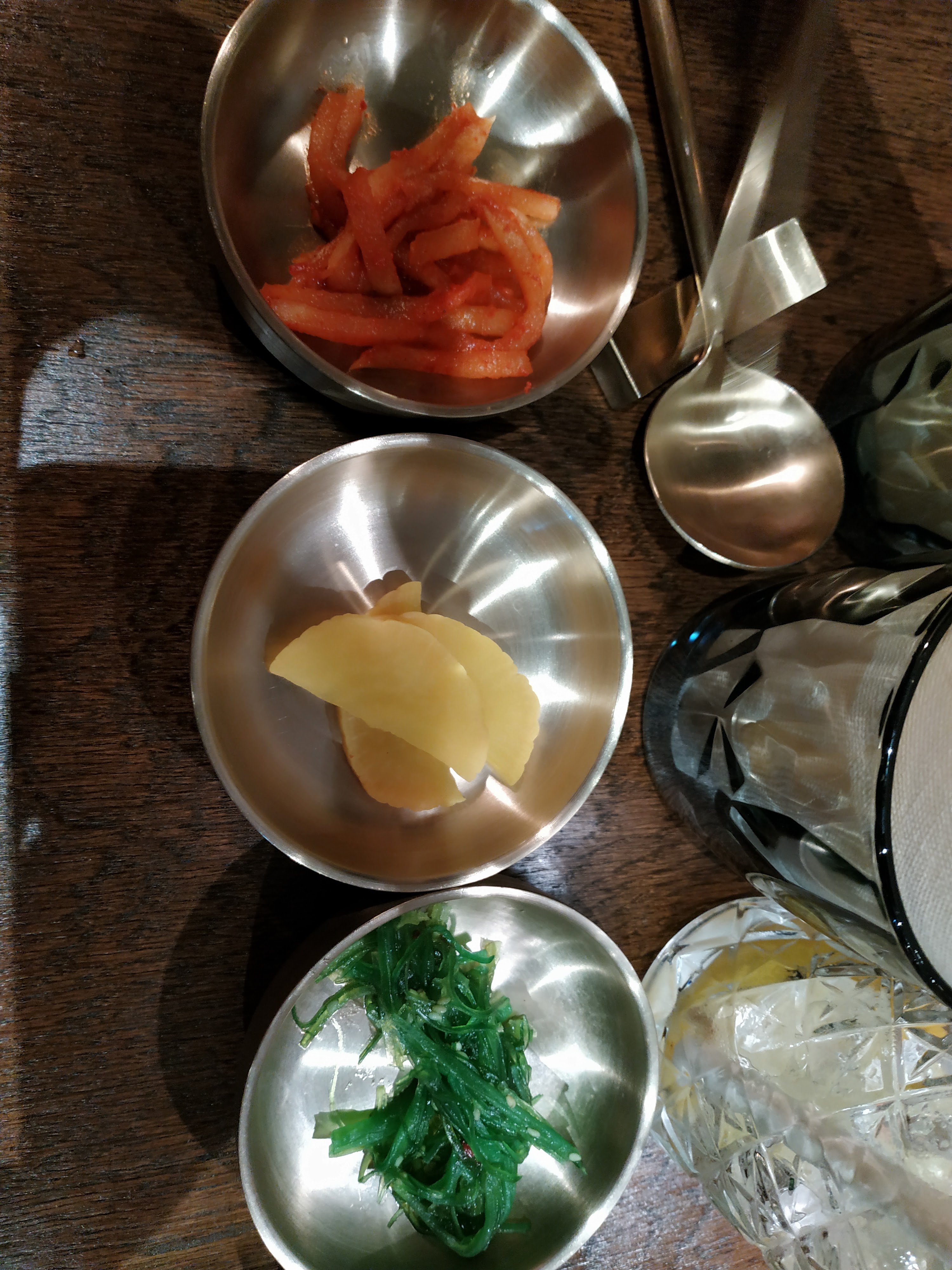 Avons pris une entrée pour deux, un bibimbap chacune , un supplément accompagnement kimchi pour tester : tout était très bon , bibimbap copieux nous sommes sorties calées et serveur très gentil