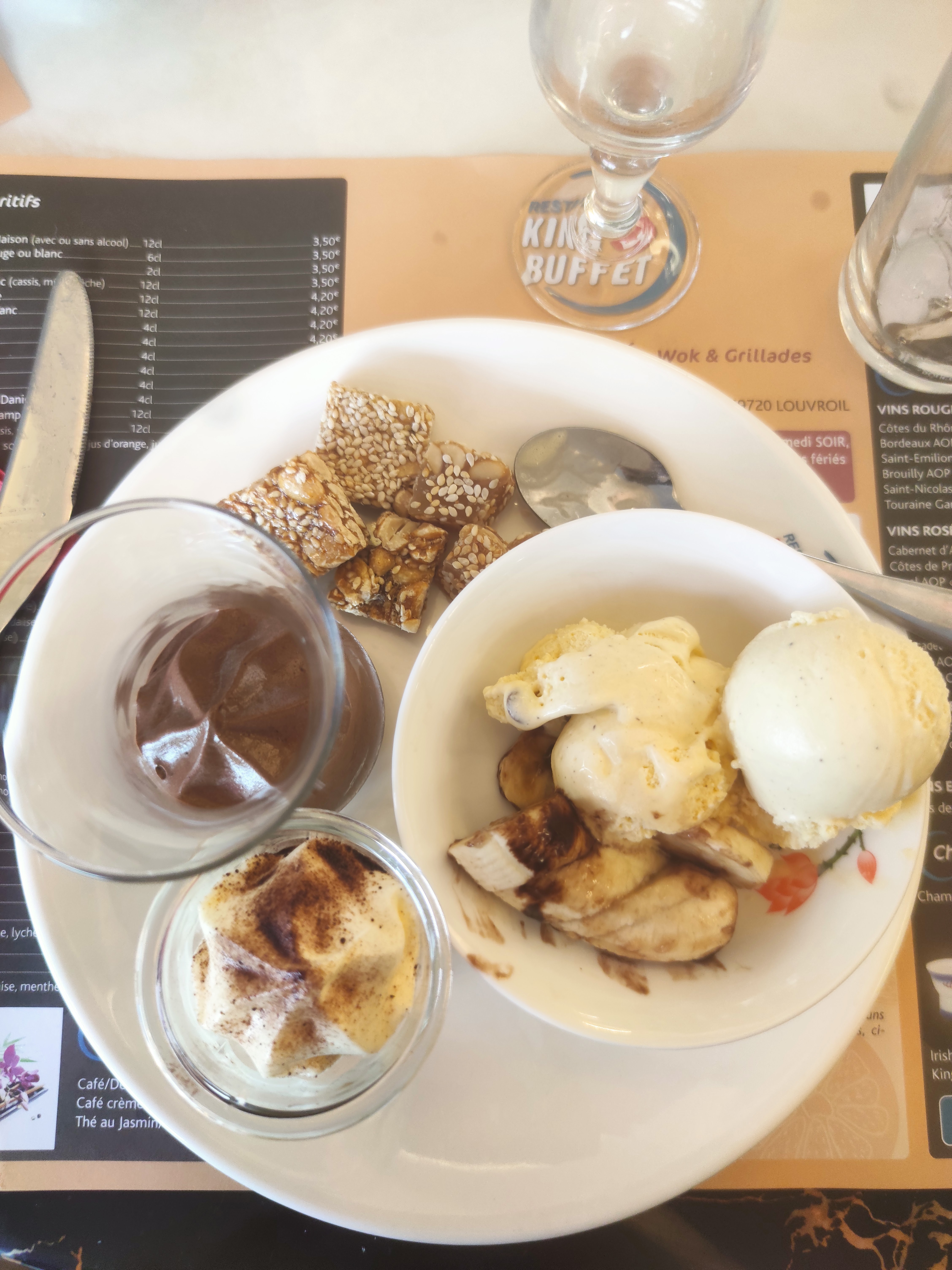 Personnel pas très communicatif. Bon choix de boissons, dommage que ça ne ressemble pas aux photos Plats tièdes , large choix de desserts Prix (20€ soir de semaine) exagéré ..