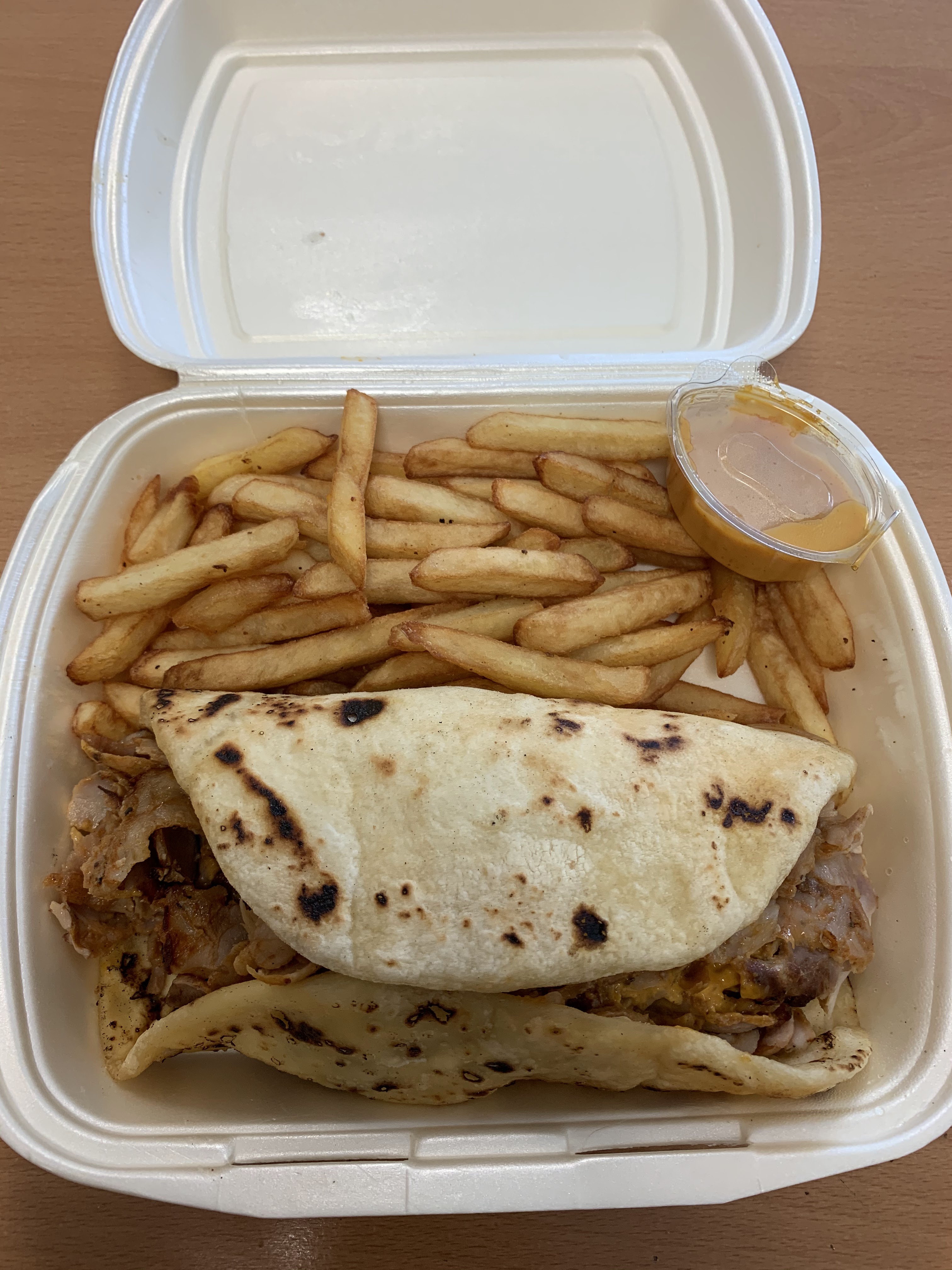 Très bon Kebab avec des frites. Grosses portions, service client bon marché et rapide.