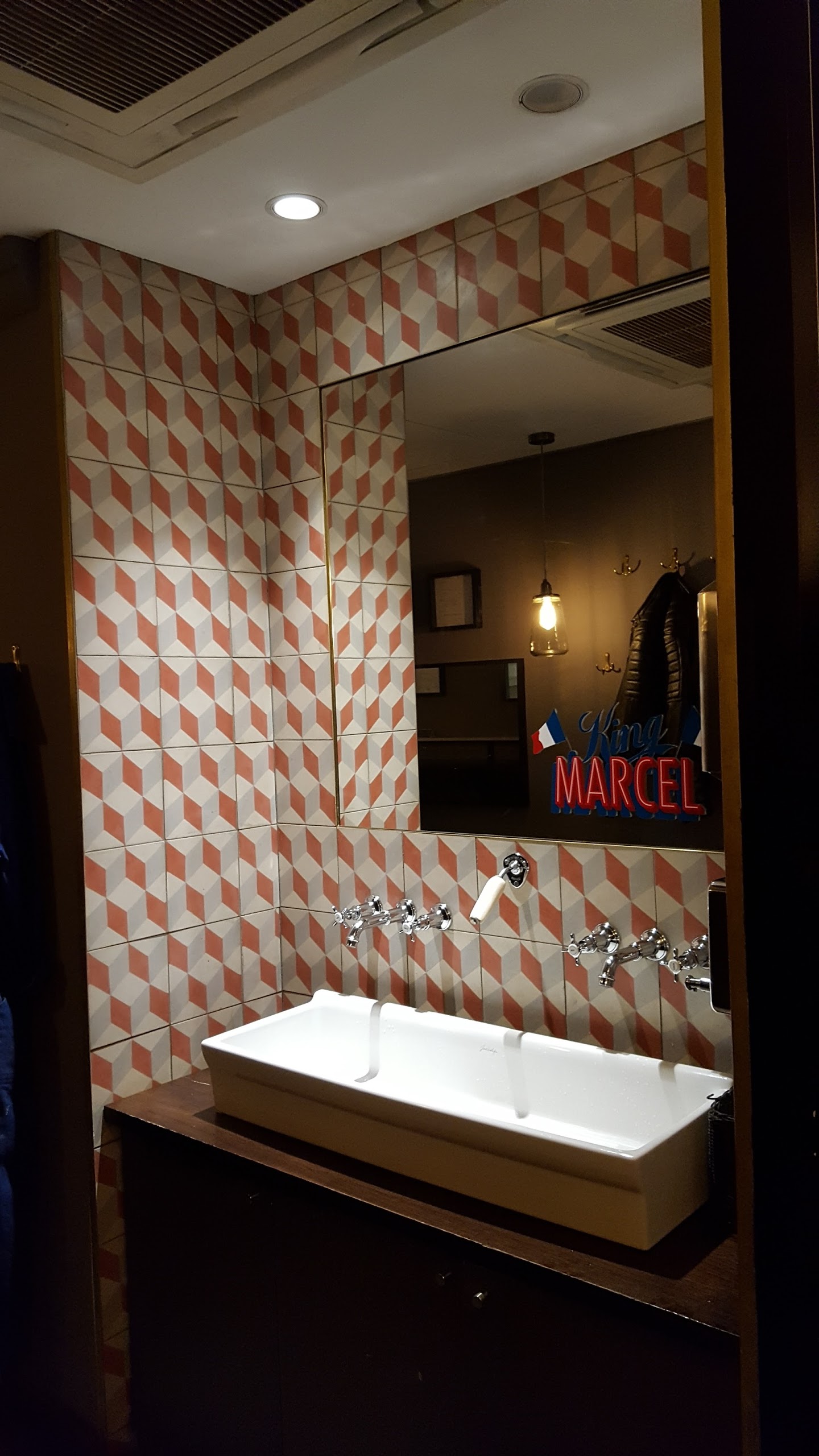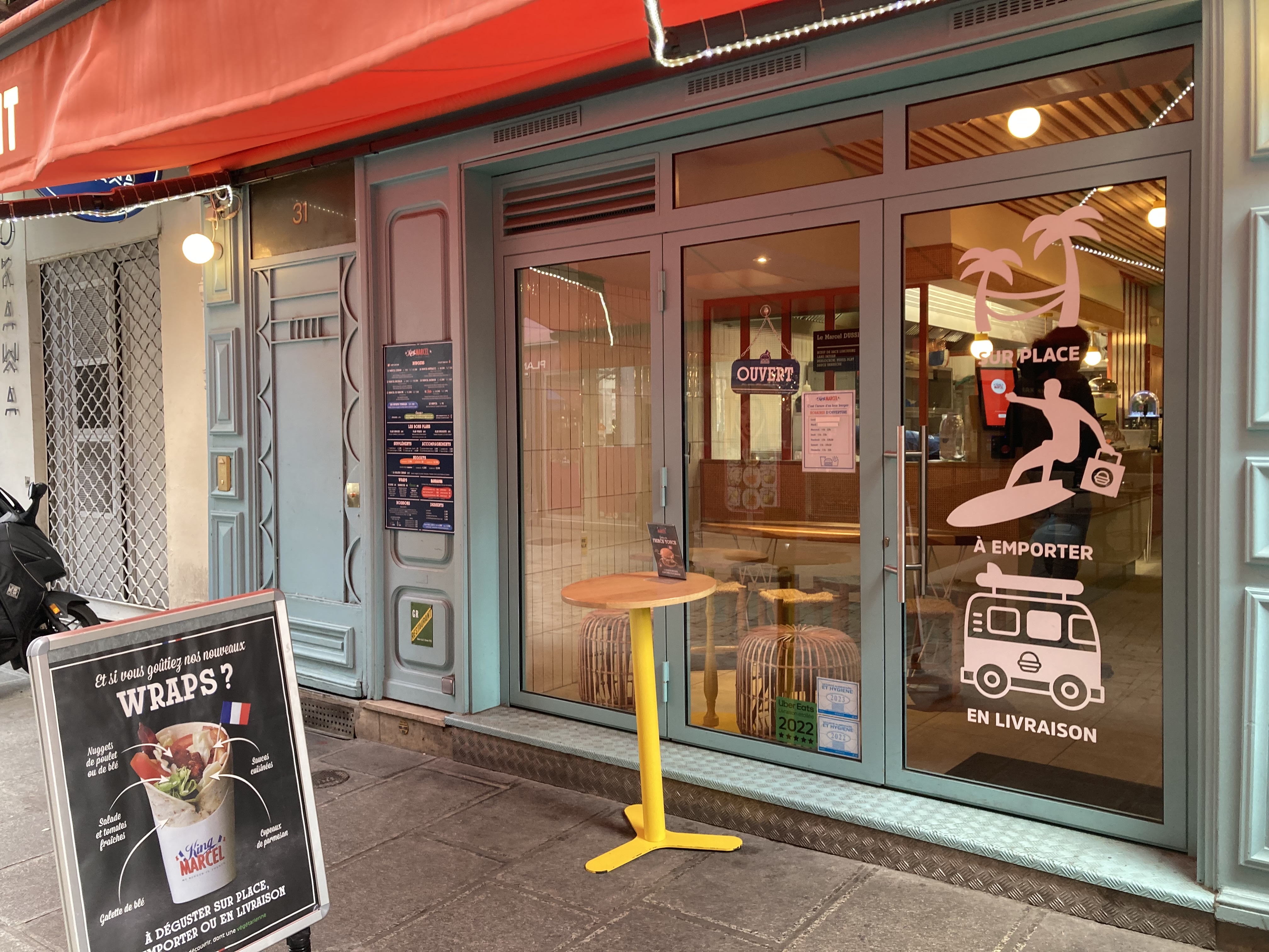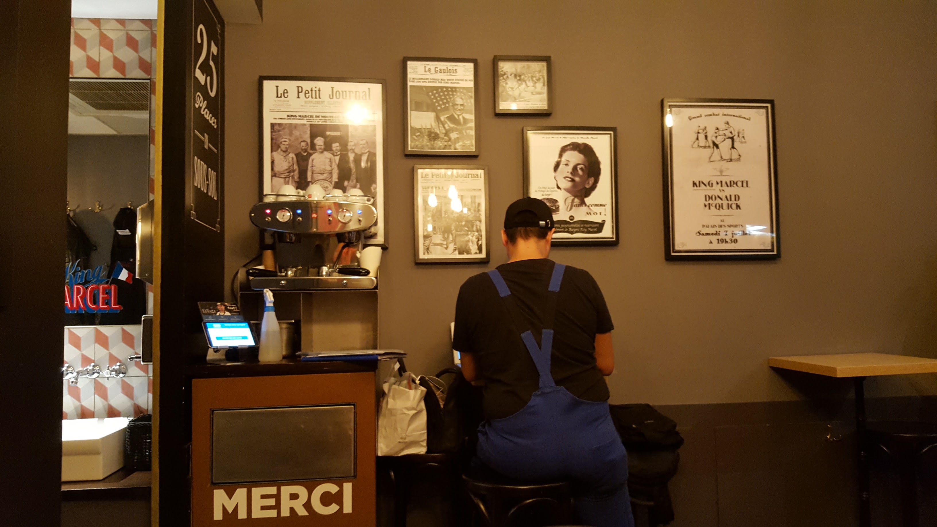 Ma venue était l'occasion de tester pour la première fois King Marcel, que j'avais hâte de tester depuis plusieurs années. Ma déception fut éclatante. À l'entrée, une responsable qui hurle sur un des employés, le menaçant tout haut d'un avertissement pour une simple maladresse, et ce devant les clients. Une immense gêne s'installe alors, avant de descendre dans une étroite salle en sous-sol, où l'on se sent vite oppressé par le manque d'espace, l'agencement du mobilier et couleur criarde des peintures, dans une décoration bien trop calquée sur l'ancienne enseigne. Un repas servi à table sans couverts ni serviettes. Nous commandons un wrap Veggie, qui contiendra du poulet. Il est clair que j'ai regretté d'avoir déjeuner ici, et n'avait qu'une hâte : sortir. La responsable devrait clairement revoir la façon de s'adresser à son équipe.