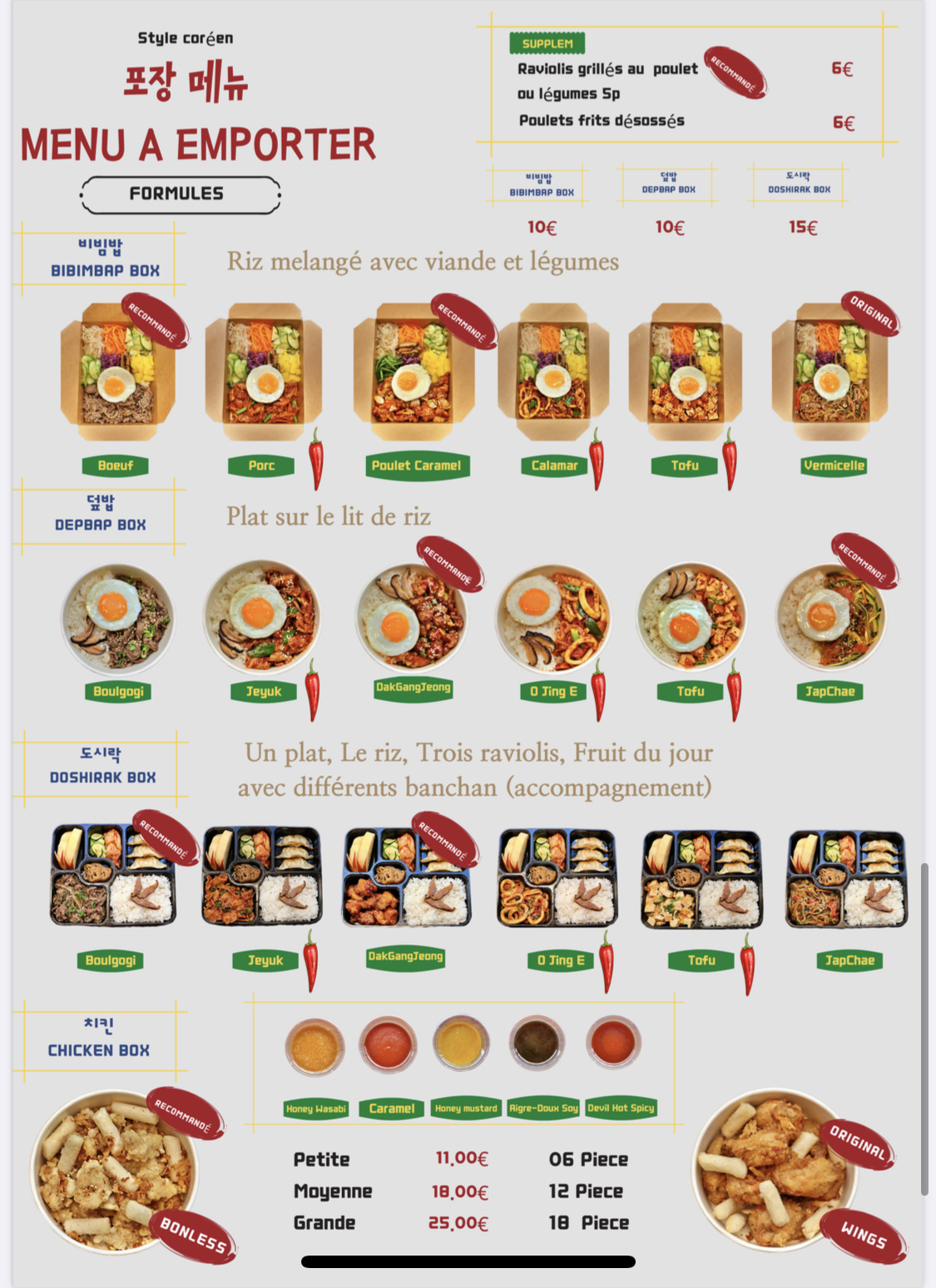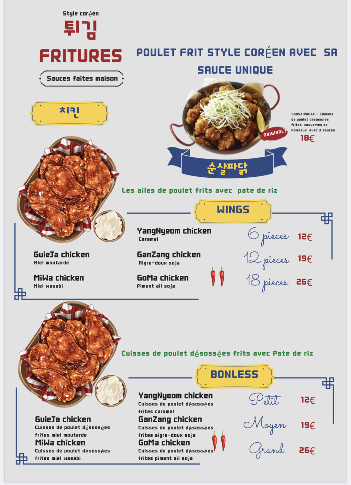 Tout d'abord le personnel est très accueillant et toujours à notre service pour ne manquer de rien Ensuite le poulet fris est vraiment pas mal, la sauce aigre douce est vraiment bonne Les toppoki au fromage donc pas mal, il y a la possibilité de les demander moins épicé Poulet halal De manière générale j'ai bien mangé, les quantités sont satisfaisante Je recommande
