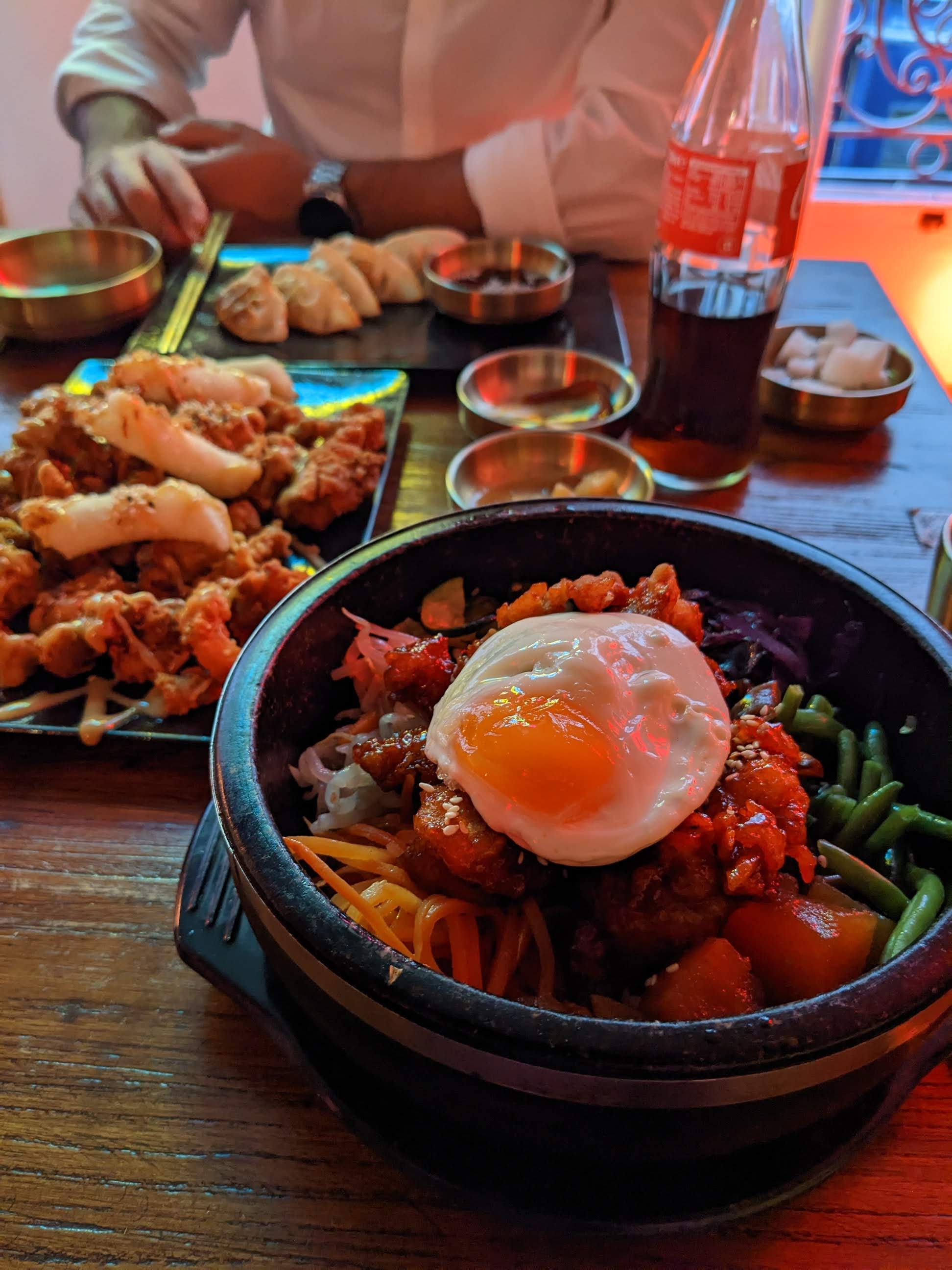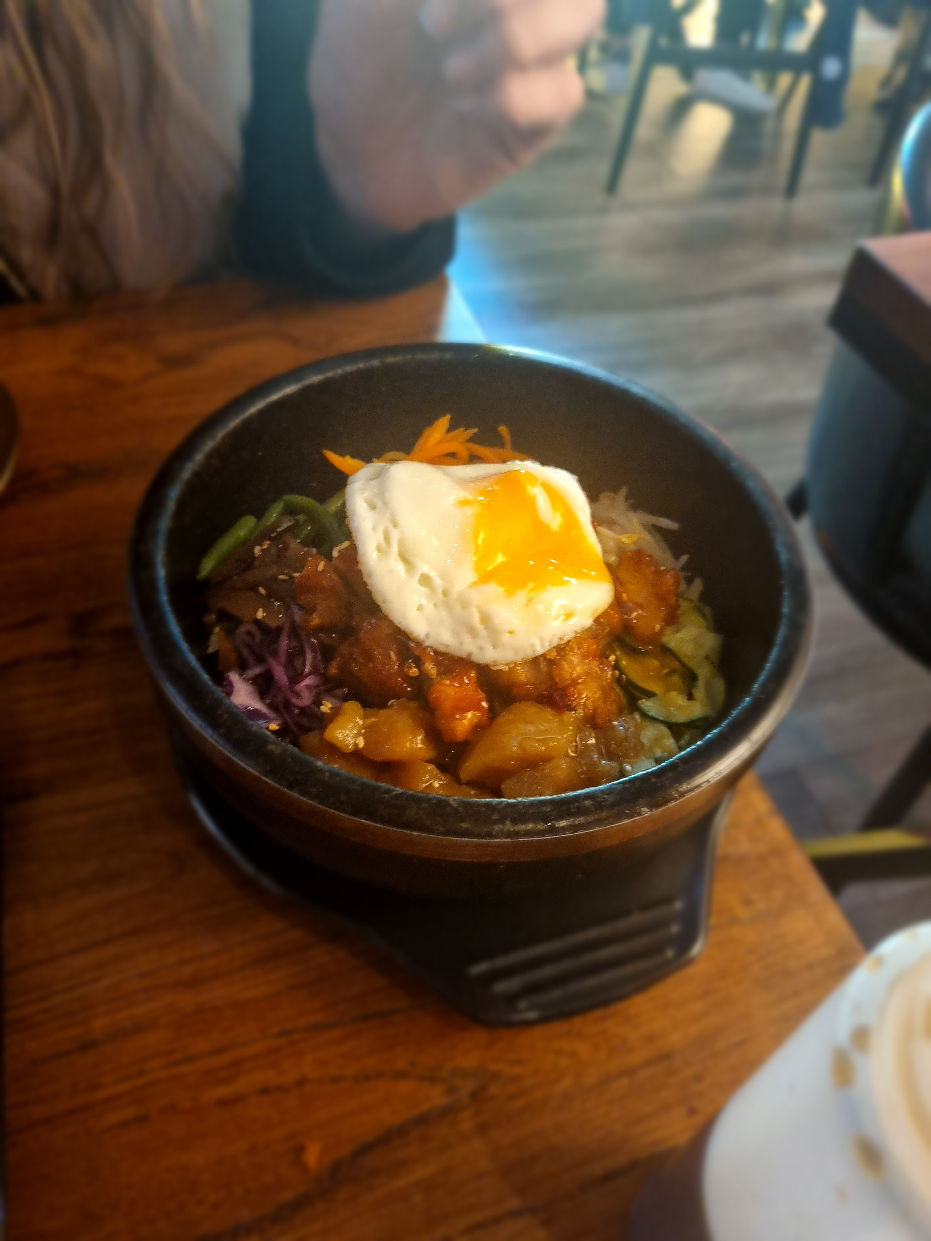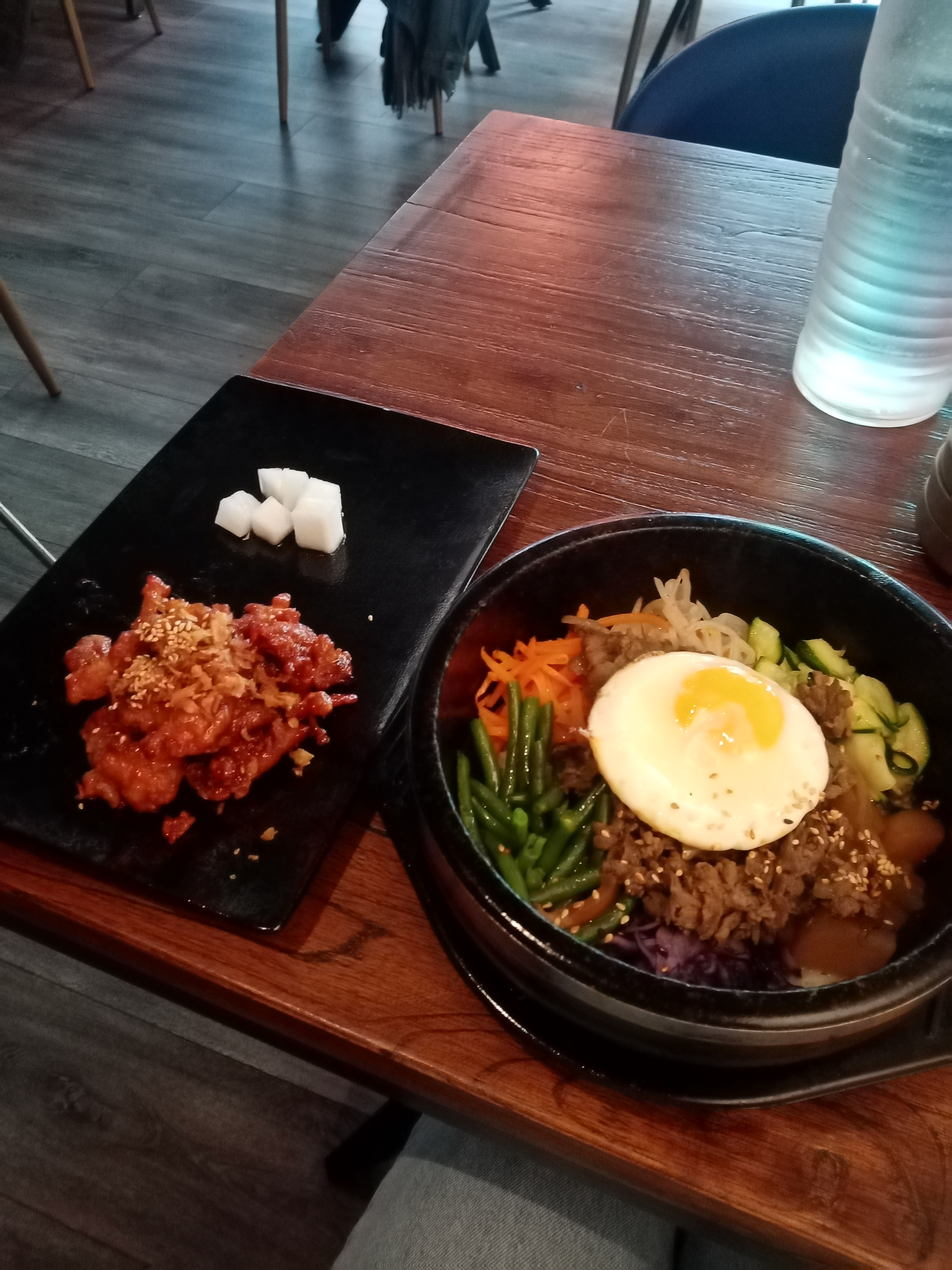 La cuisine est plutôt bonne. J'ai goûter le poulet frit au caramel et le bibimbap aux fruits de mer. Ce n'est pas le meilleur bibimbap que j'ai goûter mais il était bon. Les sauces proposées pour accompagner n'étaient pas top. Le gros soucis est en fait le personnel. Mes amies ont du attendre devant le restaurant pour qu'on soit au complet avant de pouvoir nous asseoir à l'intérieur alors qu'il n'y avait littéralement personne dans la salle du bas. Autant s'il y avait du monde j'aurais pu comprendre mais là c'est excessif. Enfin les accompagnements sont vraiment minuscule en quantité pour plusieurs personnes et pas en individuel. Le menu du midi est abordable, mais lorsqu'on veut prendre un plat à la carte c'est nettement plus cher. Bref gros moins pour l'accueil pour le moins pas ouf. D'autres restaurants coréens ont un meilleur rapport qualité/prix