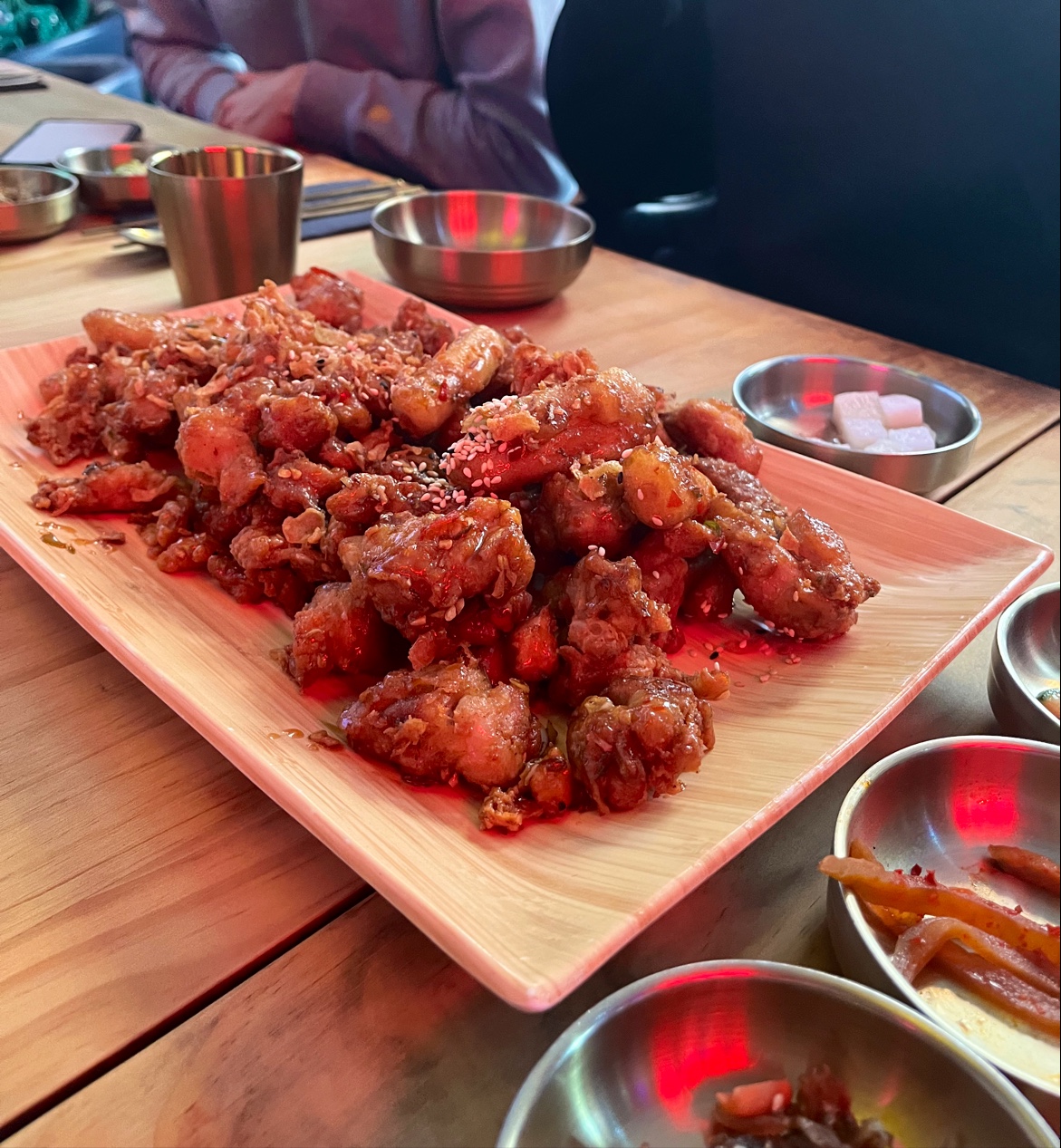 Première fois que je m’y rendais après avoir vu pas mal de posts sur Instagram cela m’a donné envie de le tester. J’enlève une étoile parce que venir dans ce restaurant avec des enfants de bas âge est cependant difficile d’accès surtout à l’étage. Escaliers très étroits donc faire attention. Je sais que si je reviens je ne ramènerai pas mes enfants. Car oui je reviendrai avec plaisirs. C’est le premier restaurant coréen où j’ai véritablement mangé du poulet frit qui pique. Pour mon palet cela reste assez subtile mais parmi tout ceux que j’ai essayé jusqu’à maintenant c’est celui qui ne ment pas lorsqu’il dit que cela est piquant. Très croustillant et portion généreuse. Avec cela j’ai pris un Goul Bossam, tranche de poitrine de porc vraiment succulent et fondant en bouche. Pour ma part j’ai adoré les trois accompagnements ( tofu, kimchi et poireaux émincés ) ma tante n’a cependant pas aimé les poireaux émincés tant mieux j’en ai eu plus pour moi ! Je reviendrai avec plaisirs tester les autres plats !