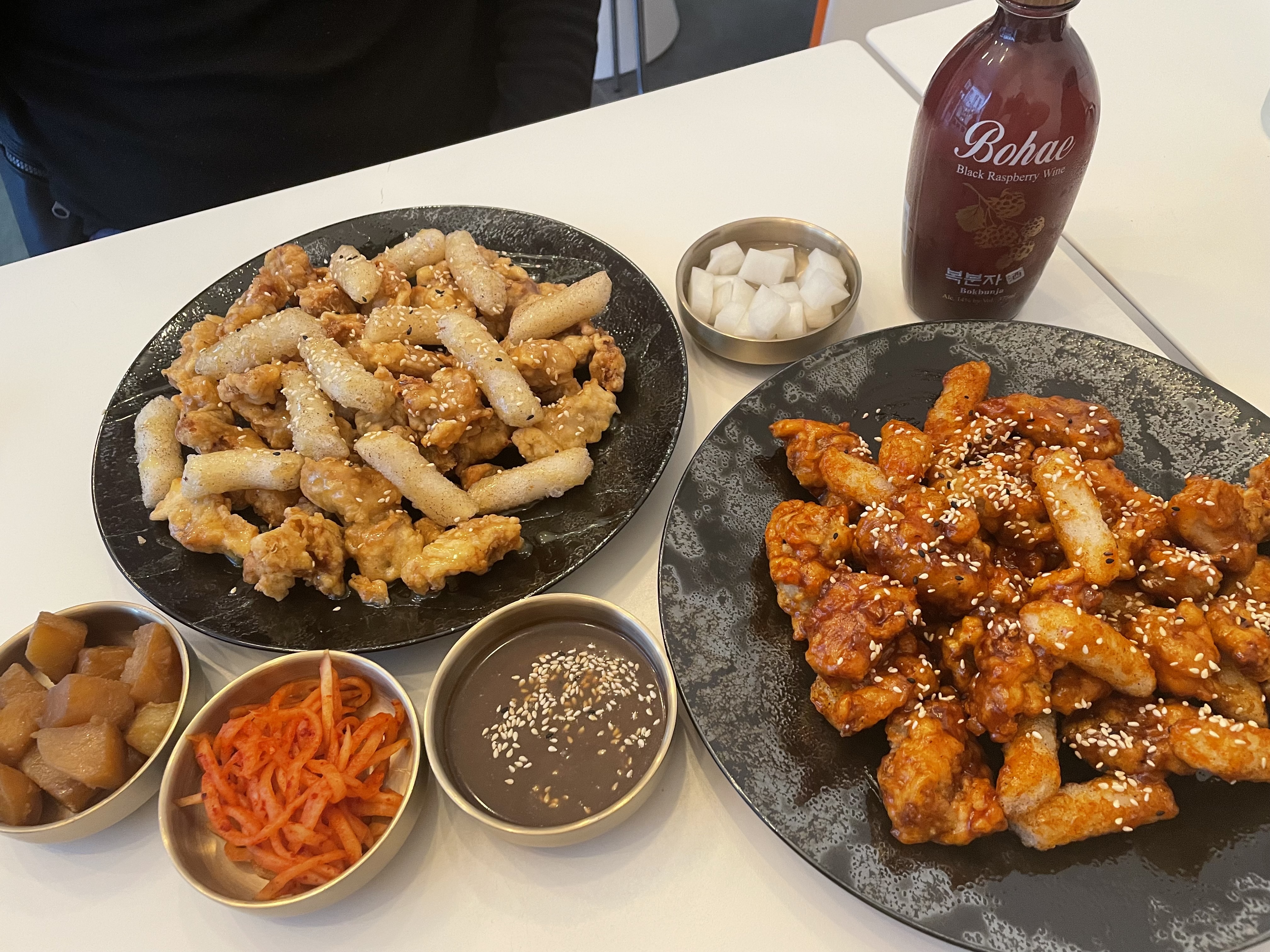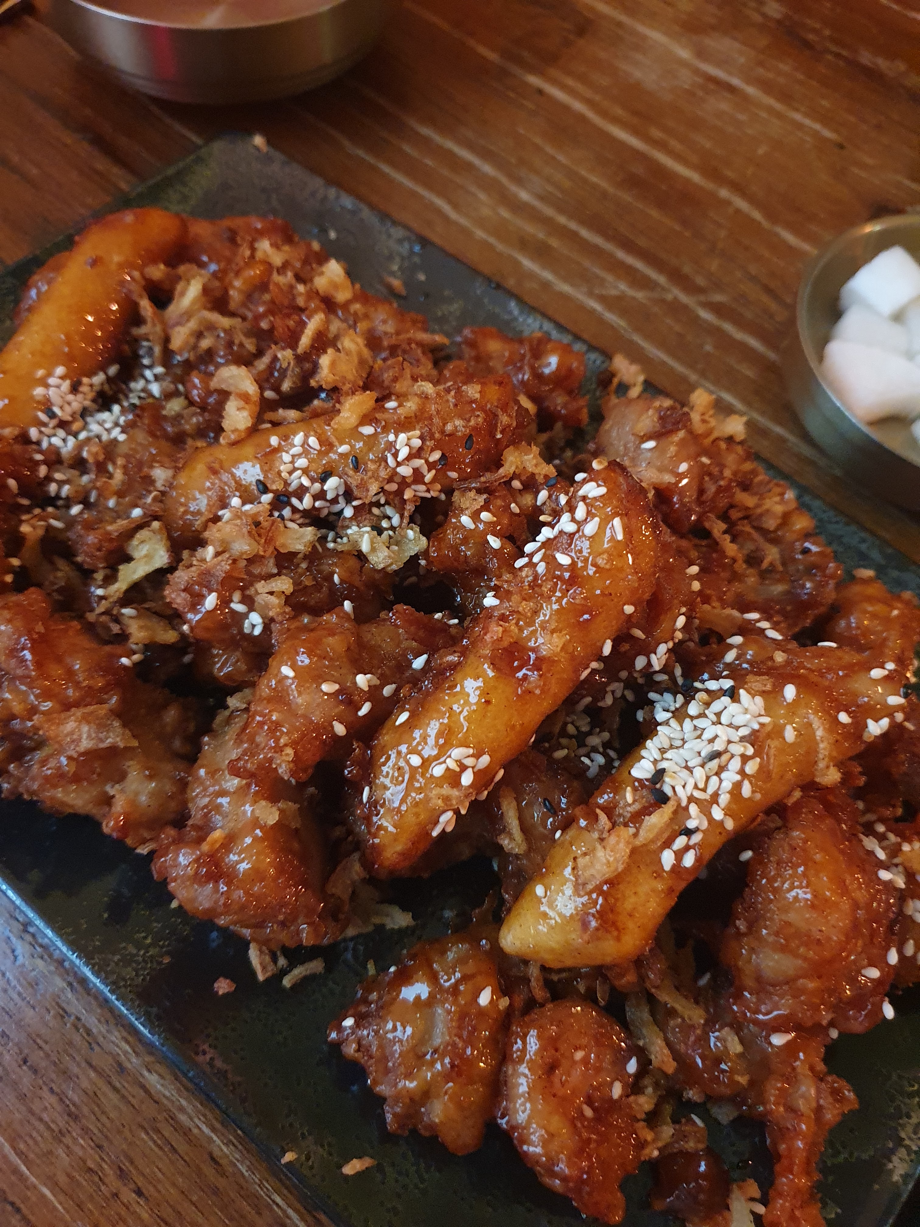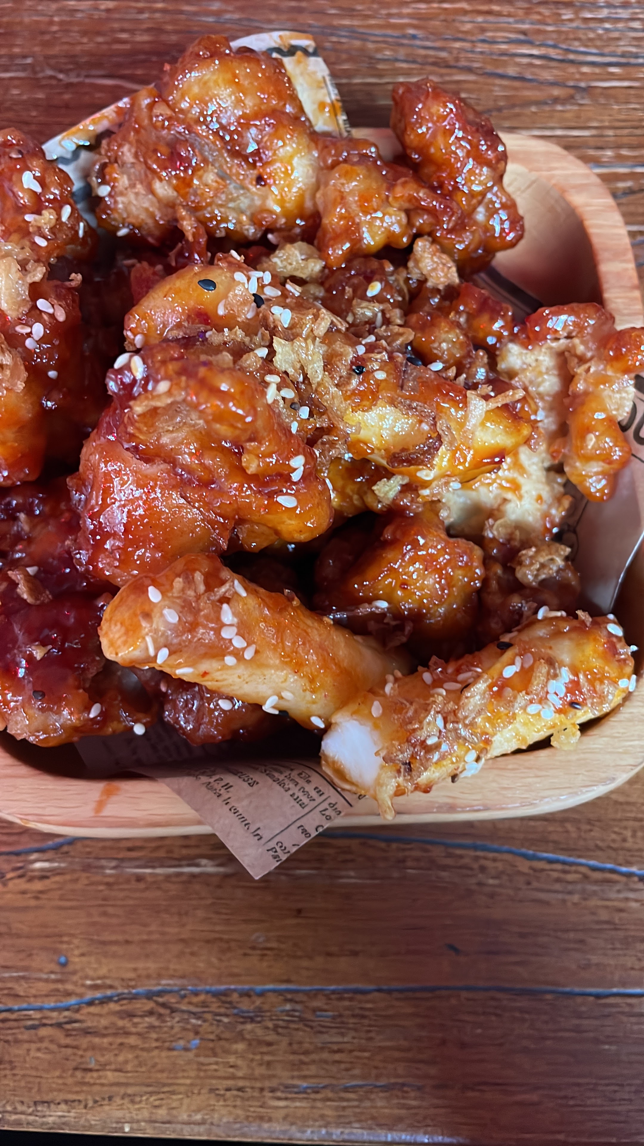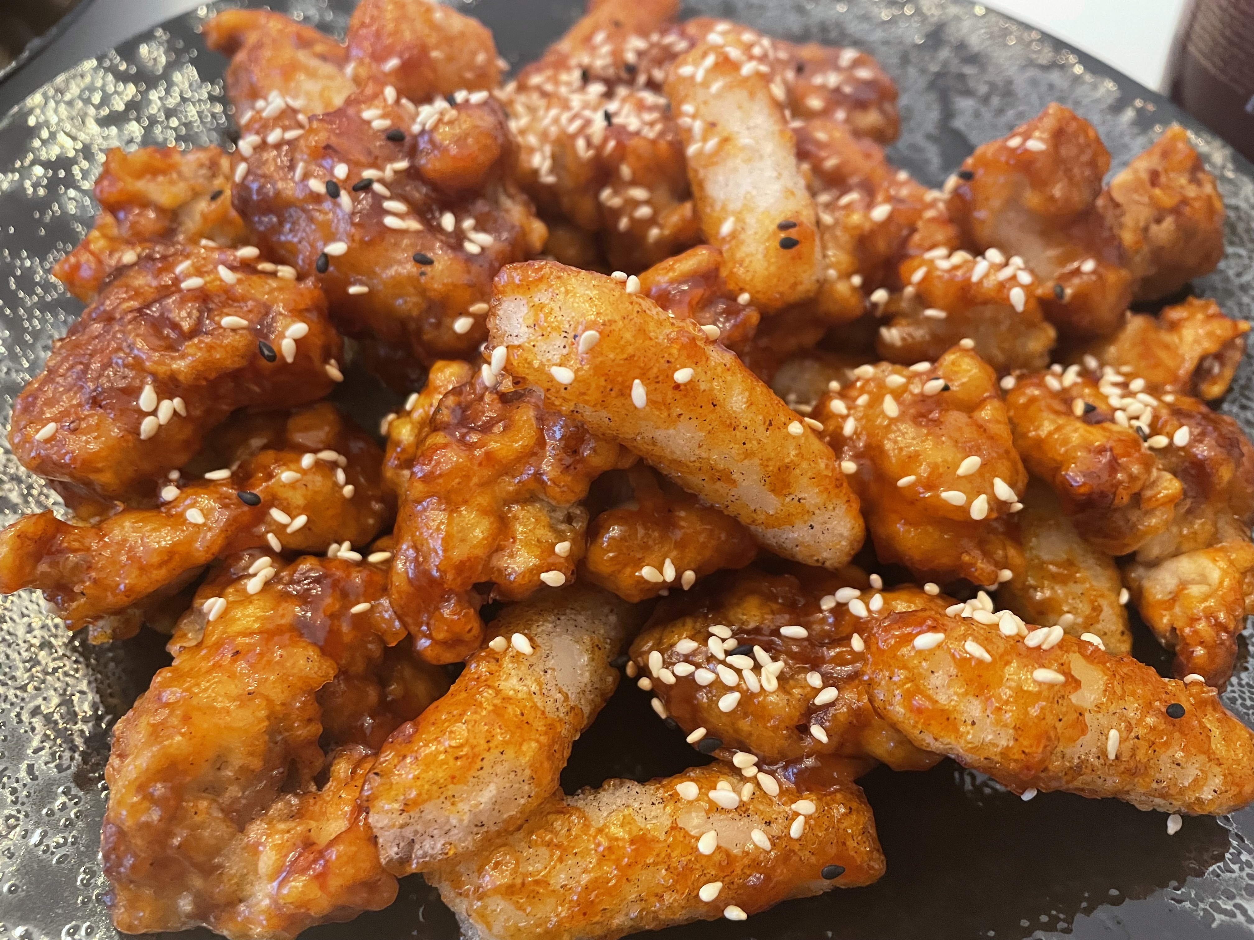 Première fois que je mange du poulet frit coréen et c’était vraiment top j’ai beaucoup aimé la pâte de riz frit c’était la première fois que j’en mangé bonne découverte.