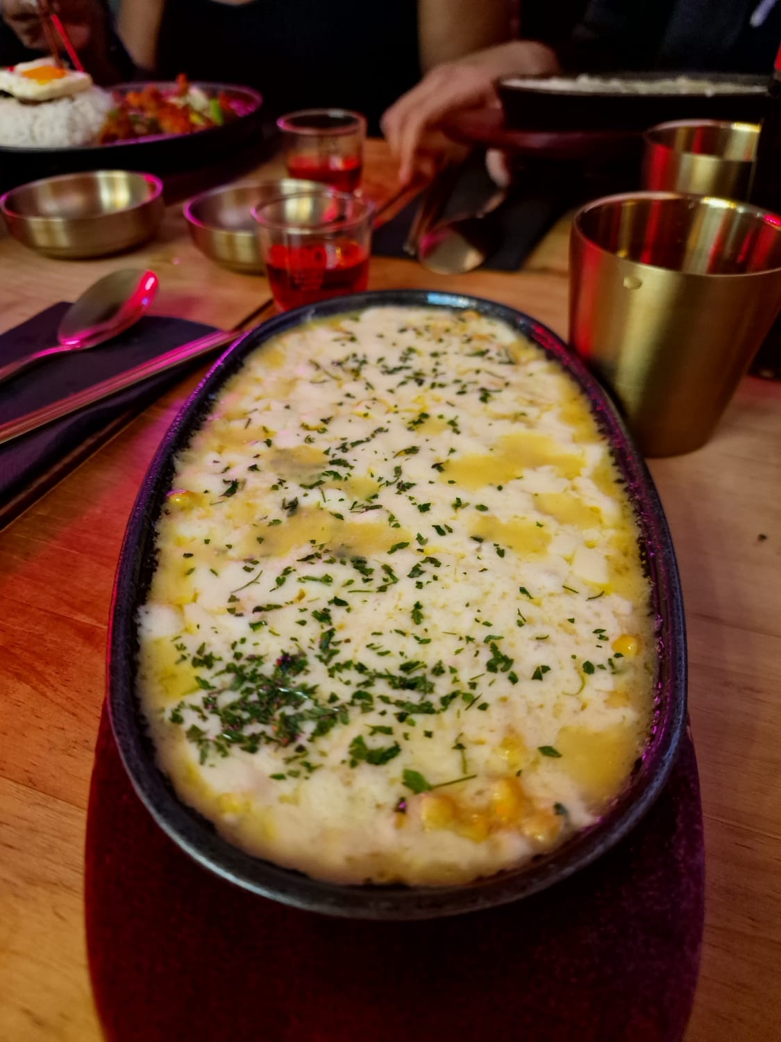 Première fois dans un coréen, Très bon poulet frit !! Vraiment bon. Lieu sympa Bon riz aux légumes Le corncheese m’a vite écœurée, mais c’est une histoire de goût. A tester pour leur poulet frit. Par contre, l’odeur de la cuisine trop imprégnante alors que nous étions à l’étage.