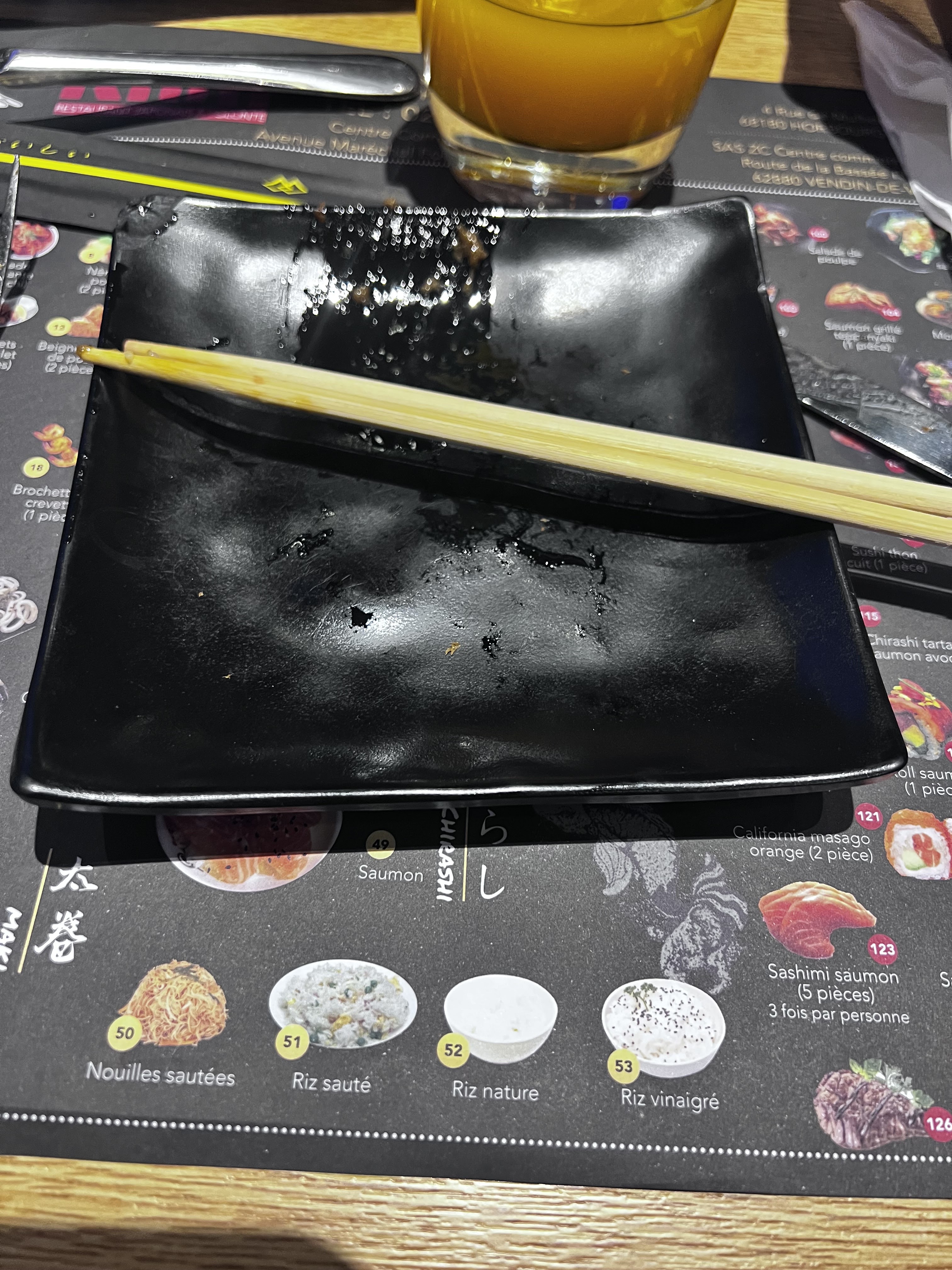 Bonjour, Avis mitigé, le décor est très beau et vous pouvez même avoir un petit salon privé (il est préférable de le réserver à l’avance). Le service par tablette est sympa et commander par lot de 5 n’est pas dérangeant quand on mange. Cependant le problème c’est les plats, tout est nature. Bœuf fromage sans sauce yakitori, plat de beauf sans sauce (sans sel), poulet sans sauce ni sel, brochette poulet nature et plus curieux c’est le riz froid. J’ai demandé au serveur pour le riz, pour eux c’est normal. Habituellement on nous sert du riz chaud et on ajoute un peu de sauce soja. Sinon pour les desserts vous avez un grand choix de bonbons. EDIT POUR LE 13 AOÛT 2020: NE RESPECTE PAS LES RÉSERVATIONS. On appelle on réserve et quand on arrive à l'heure on dit qu'il y a pas de réservation à notre nom. EDIT 27/07/2022: Assaisonnement OK, maintenant il y a un petit plus sur le boeuf eu le poulet. Mais le tres gros probleme (qui est générale avec les a volonté) c'est les cuissons: L'ensemble des plats sont cuit sur la même plaque, ou la même huile. Donc ATTENTION les personnes allergique aux poissons/crustacés.