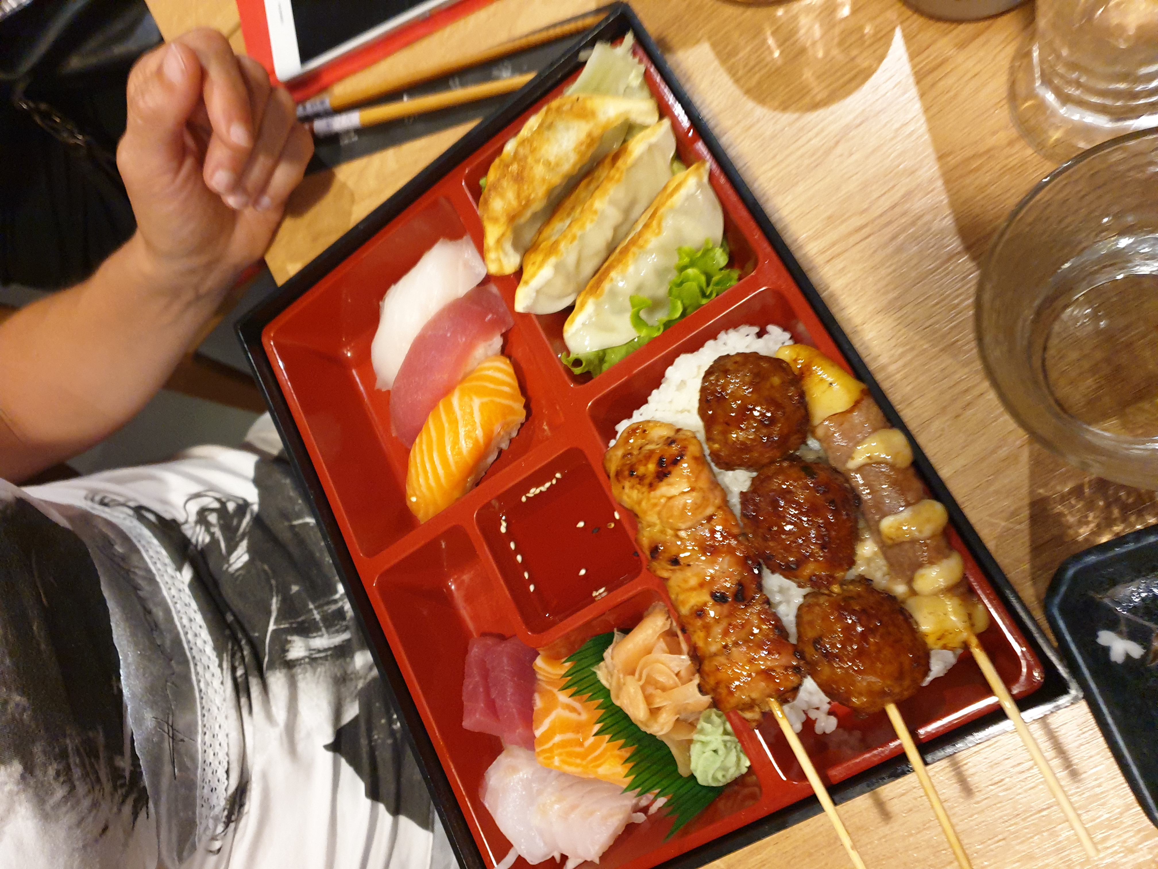 Excellent rapport qualité/prix. Les gyozas grillés sont excellents et changent de la piètre qualité habituelle des restaurants Japonais. La tranche de poisson sur les sushis est d'une taille raisonnable, le poisson est frais. Les broches sont du même niveau, les boulettes de poulet notamment ne sont jamais crues au centre.