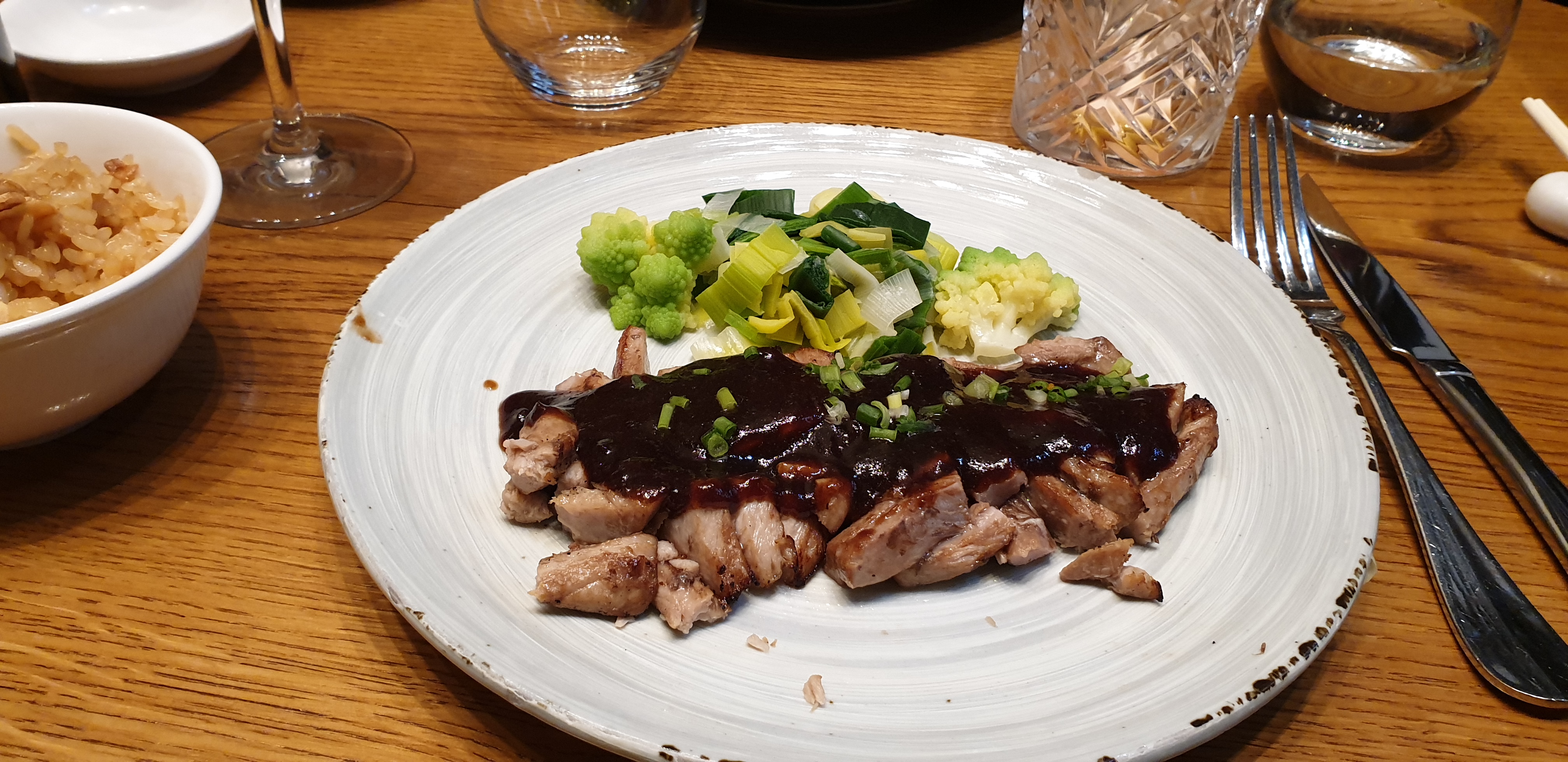 Cher mais tellement bon. J'y suis allé un samedi donc le bento n'était pas disponible, mais j'ai pris le saumon et commandé un côté du riz à l'ail. Il y avait aussi le cocktail au litchi et au champagne - je ne me souviens plus du nom. Tout était si bon, le service était rapide et l'ambiance était détendue. J'ai adoré.