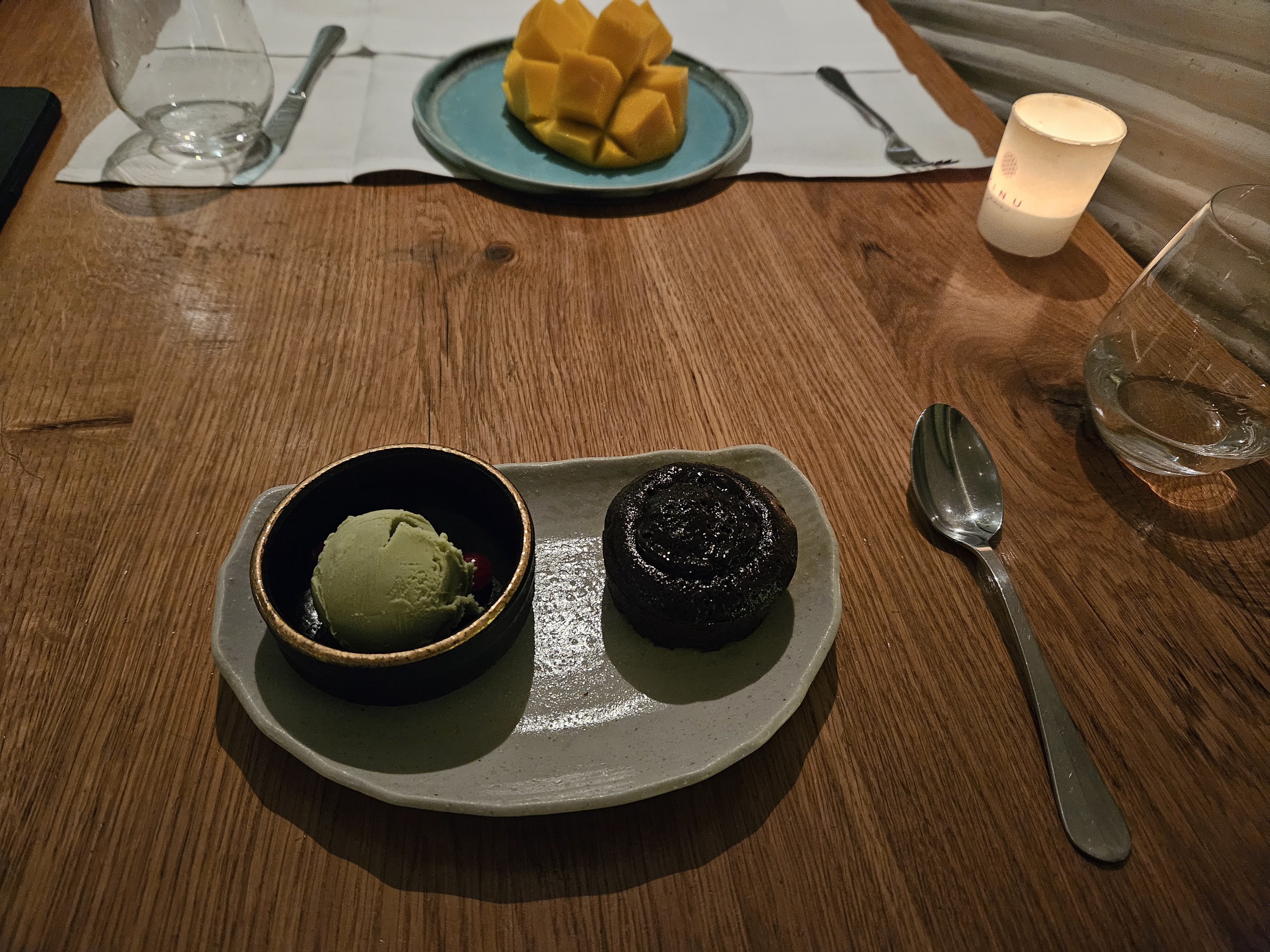 Ambiance raffinée, mais assez agitée et bruyante au déjeuner, les sushis et sashimis sont excellents et très frais, rien à redire, mais cela reste assez classique et un peu cher pour ce que c’est. Le fondant au chocolat est bon, mais le mariage chaud froid avec la glace au matcha est un peu désagréable pour les dents.