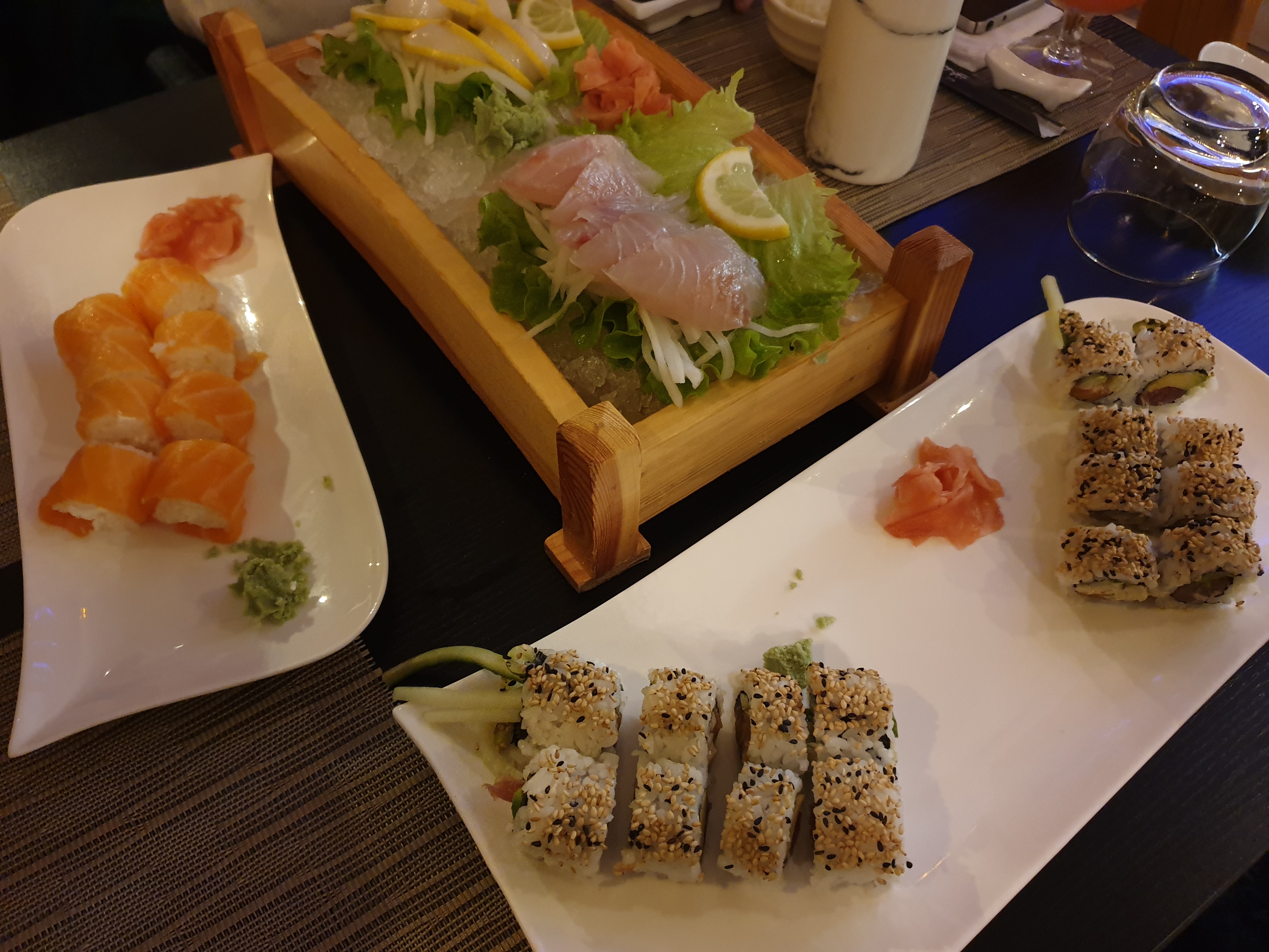J'ai adoré l'ambiance ! Malgré un samedi soir, c'était assez calme. Le personnel est absolument adorable ! Sans parler de la nourriture qui était excise ! La salade et la soupe miso étaient incroyables et la présentation du plan merveilleuse ! Nous avons pris le menu Sashimi à 15 pièces et je recommande absolument ! Ça n'a rien avoir avec ce qu'on trouve dans les supermarchés, là c'est de la vraie qualité avec une magnifique variété de sashimi proposés. Je recommande à 100%