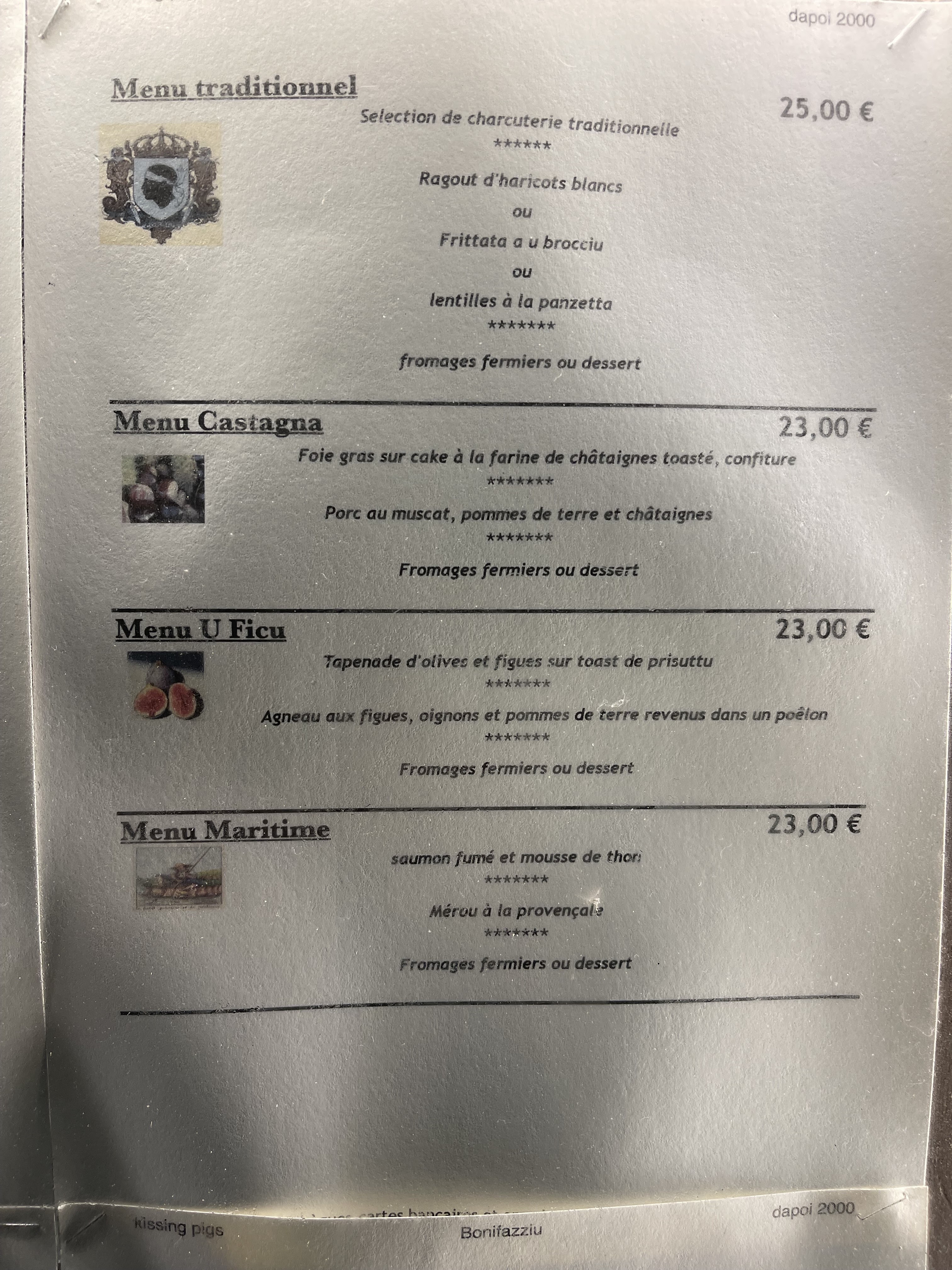 Nous avons visité l'île de Beauté en hiver et fait un petit tour par la magnifique ville de Bonifaccio. Nous cherchions un petit resto typique et convivial et en se promenant nous avons trouvé le Kissing pigs. Allez-y. Les yeux fermés. Un régal. Tout cuisiné sur place, produits locaux et échanges très spas avec le personnel. Un régal !! Merci !