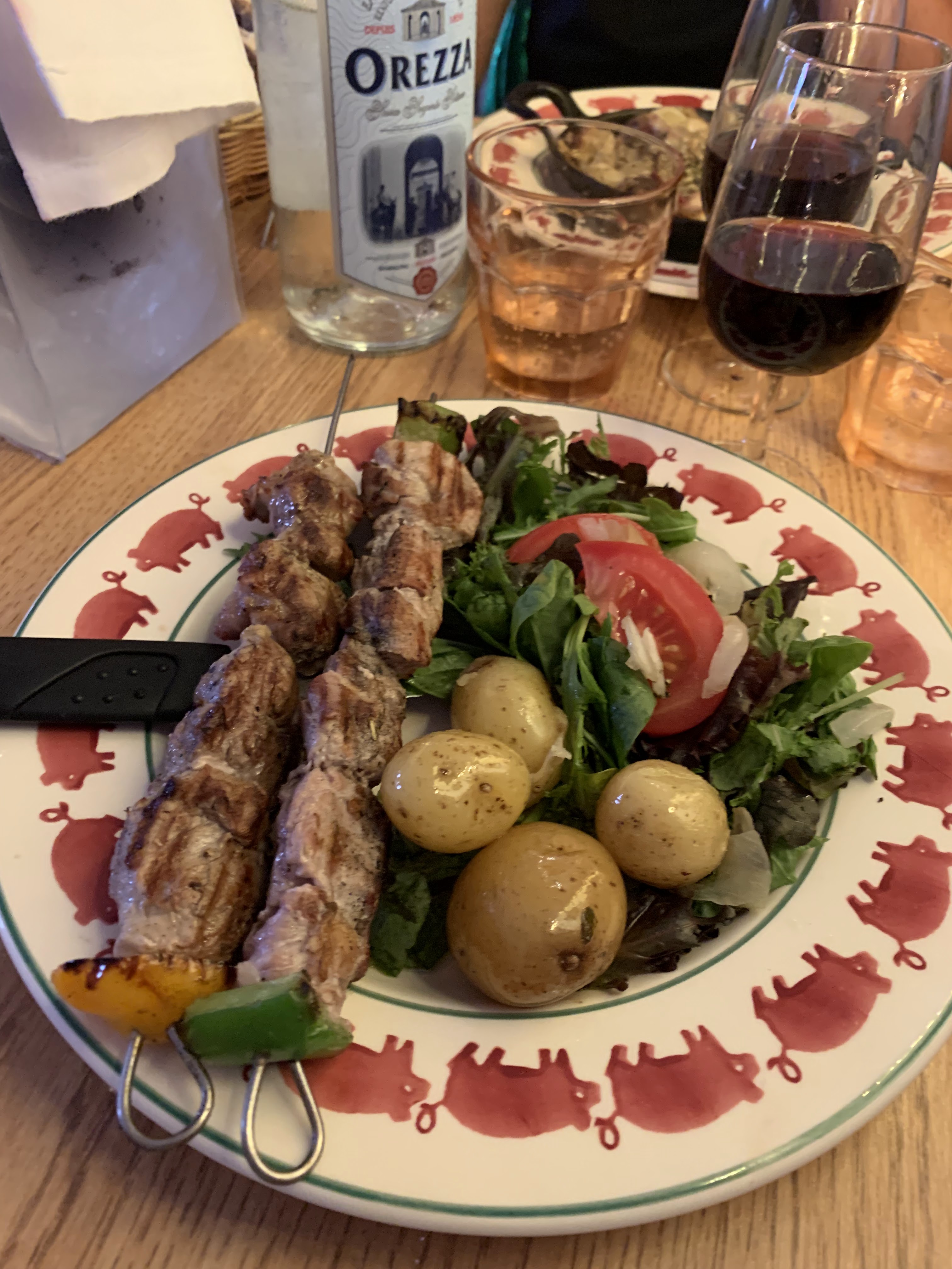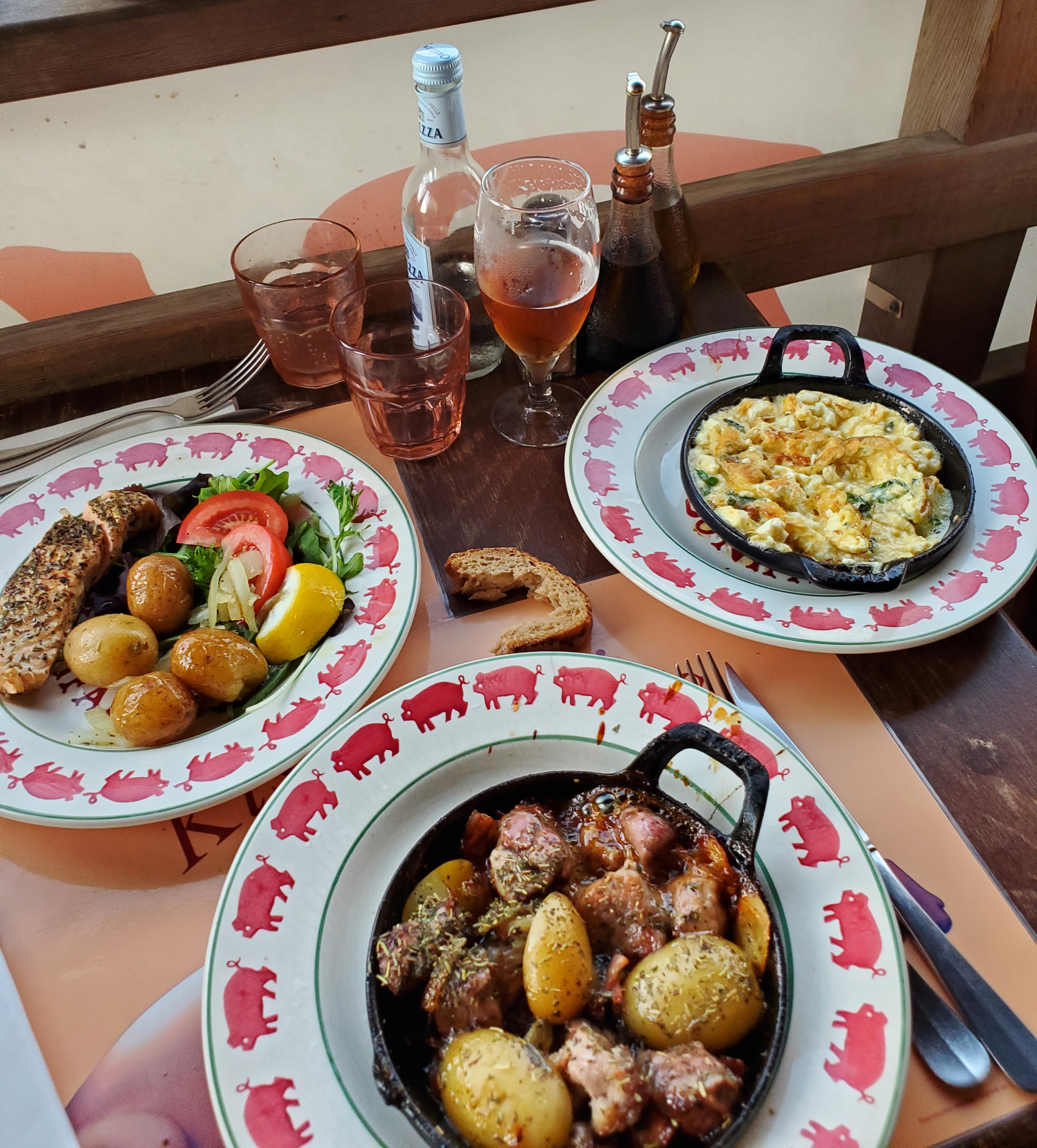 En recherchant des restaurants le long du port, nous avons trouvé cet endroit intéressant juste à côté des bateaux. Le cochon qui s'embrassait avait quelques plats qui nous semblaient intéressants, alors nous avons décidé d'entrer. Nous sommes arrivés à 7h15 sans réservation et avons pu nous asseoir sous la terrasse couverte. Nous avons partagé une salade végétarienne, puis avons pris le mérou et le plat d'agneau. Les deux étaient fantastiques, le service était excellent car le serveur parlait différentes langues et pouvait facilement communiquer avec nous. Au début, nous avons commandé une bouteille de ce que je pensais être du vin rouge mais c'était du rosé et nous avons pu la rendre et obtenir un blanc rouge. Si nous restions ici plus longtemps, c'est un endroit où nous retournerions certainement. Je recommanderais d'y aller.