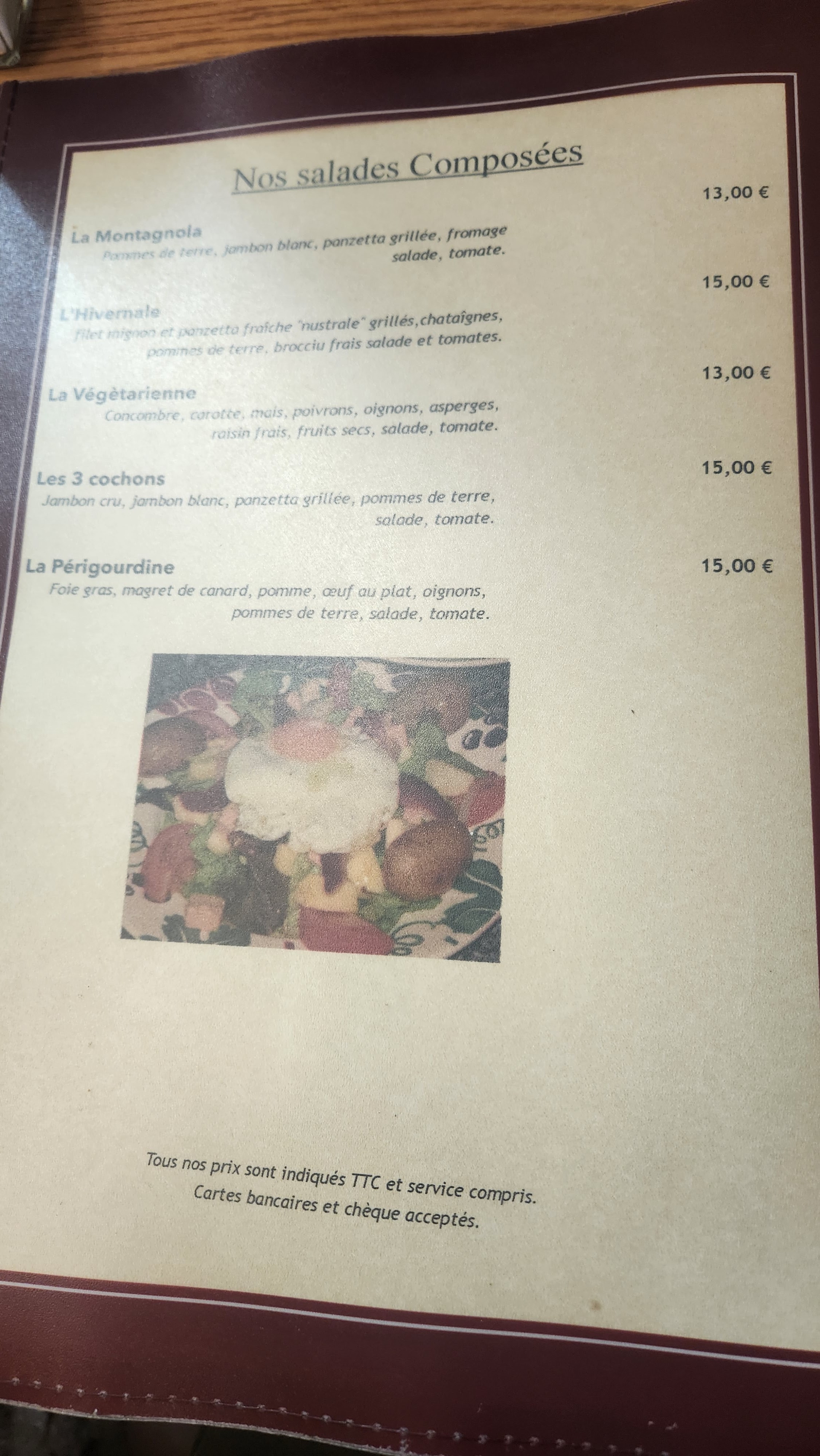 Nous n avons pas du tout aimé ce restaurant. Sur la carte : fois gras / en fait mousse de fois achetée au spar : 14 euros. En plat : magret de canard de 80g avec 3 patates grenailles sans sauce, 25 euros. Restaurant d ambiance très rustique et le cuisinier qui passe son temps à regarder un match de foot à côté de vous. Une note finale pas du tout à la hauteur de ce qu il y a dans l assiette ! Fuyez !