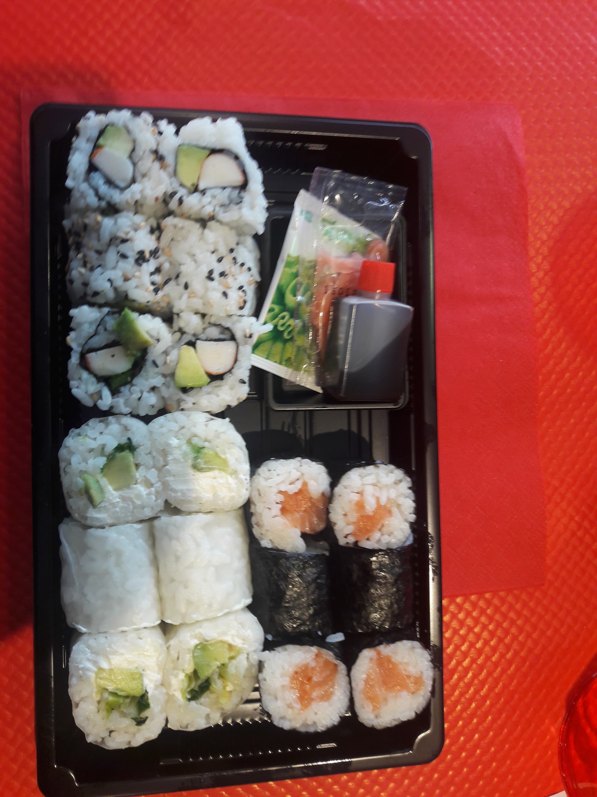 Sushis plutôt bons et service rapide en se rendant sur place mais le personnel n'ecoute pas vraiment nos demandes, sans baguette ni serviette je me retrouve avec 2 paires et 4 serviettes qui ne me servent à rien...