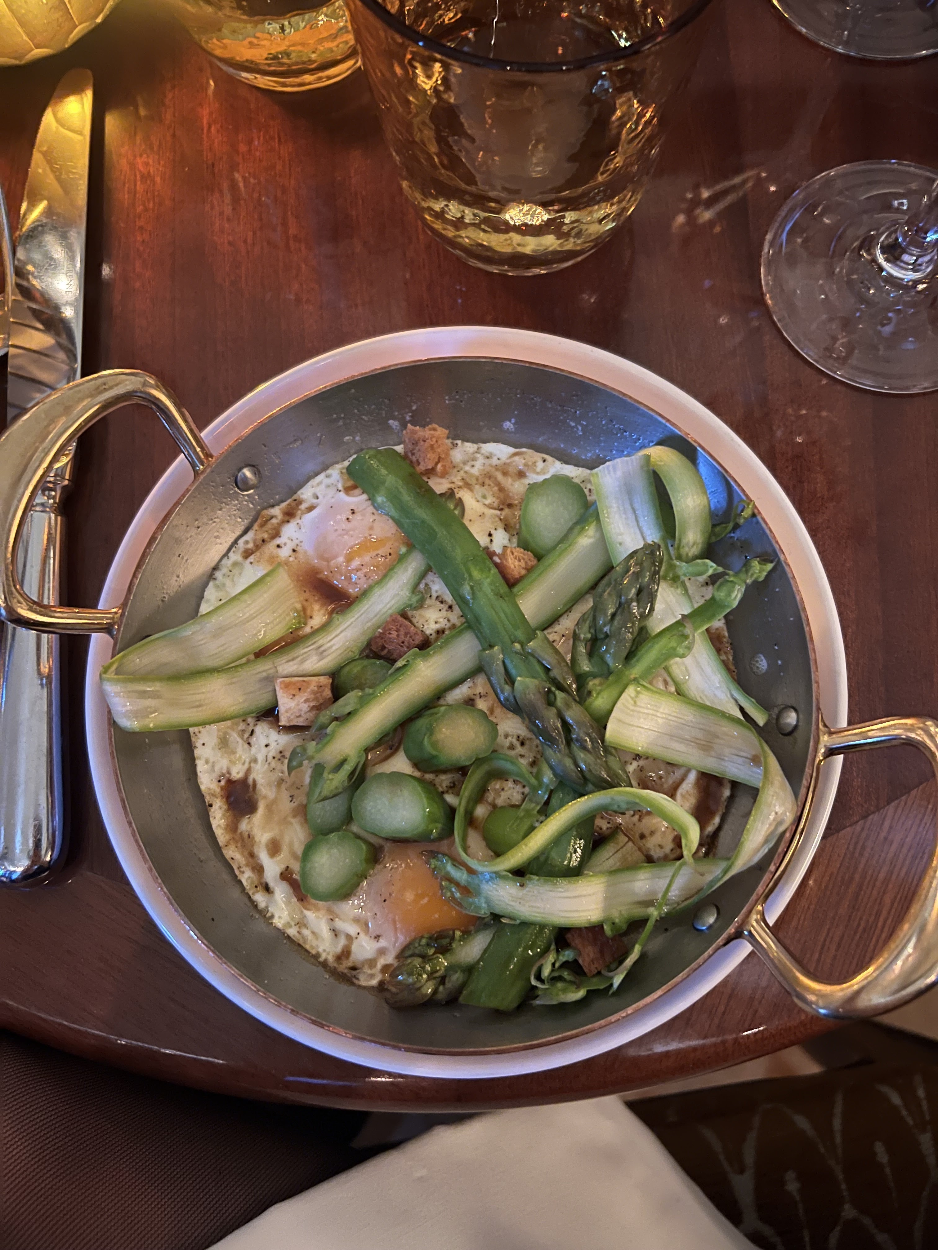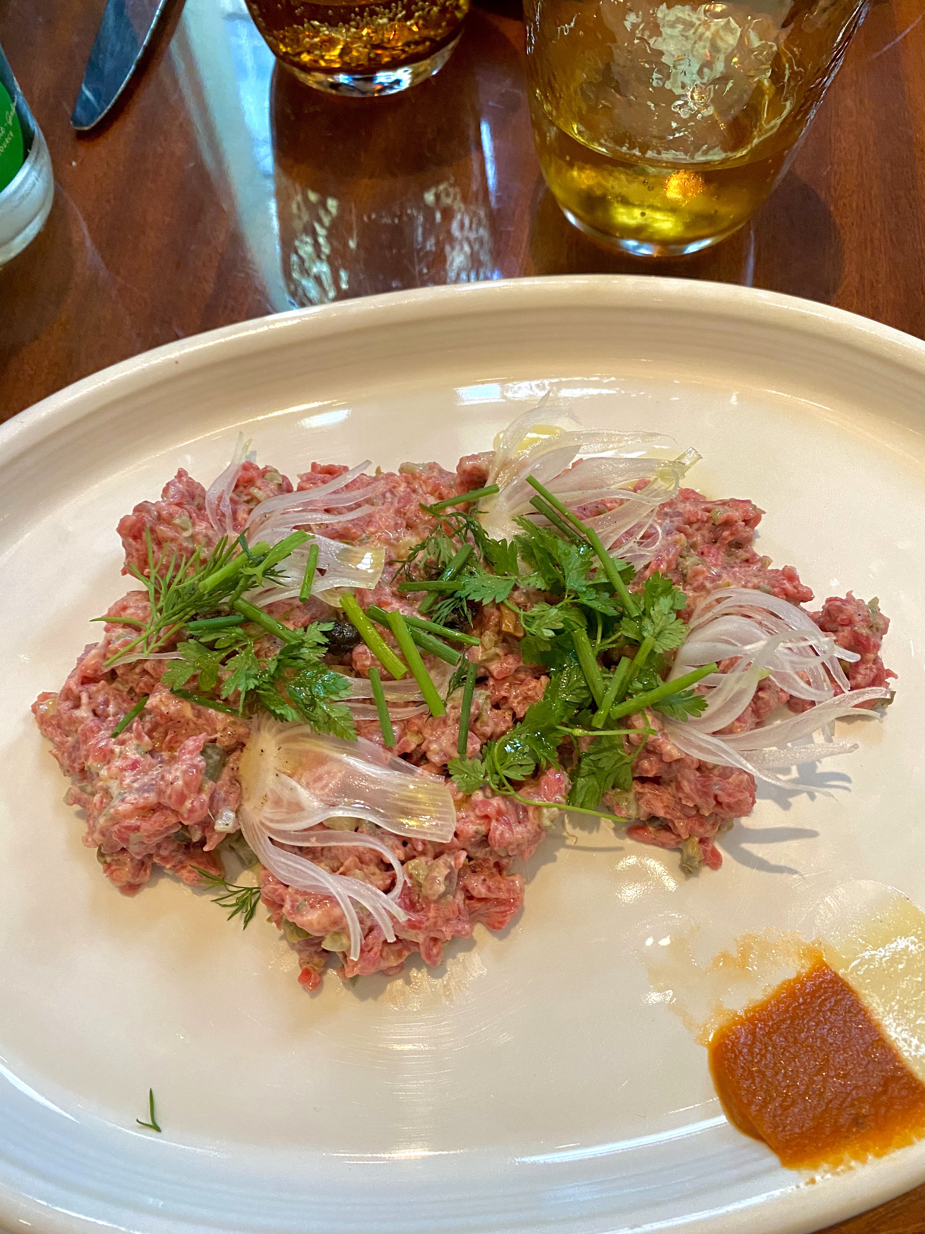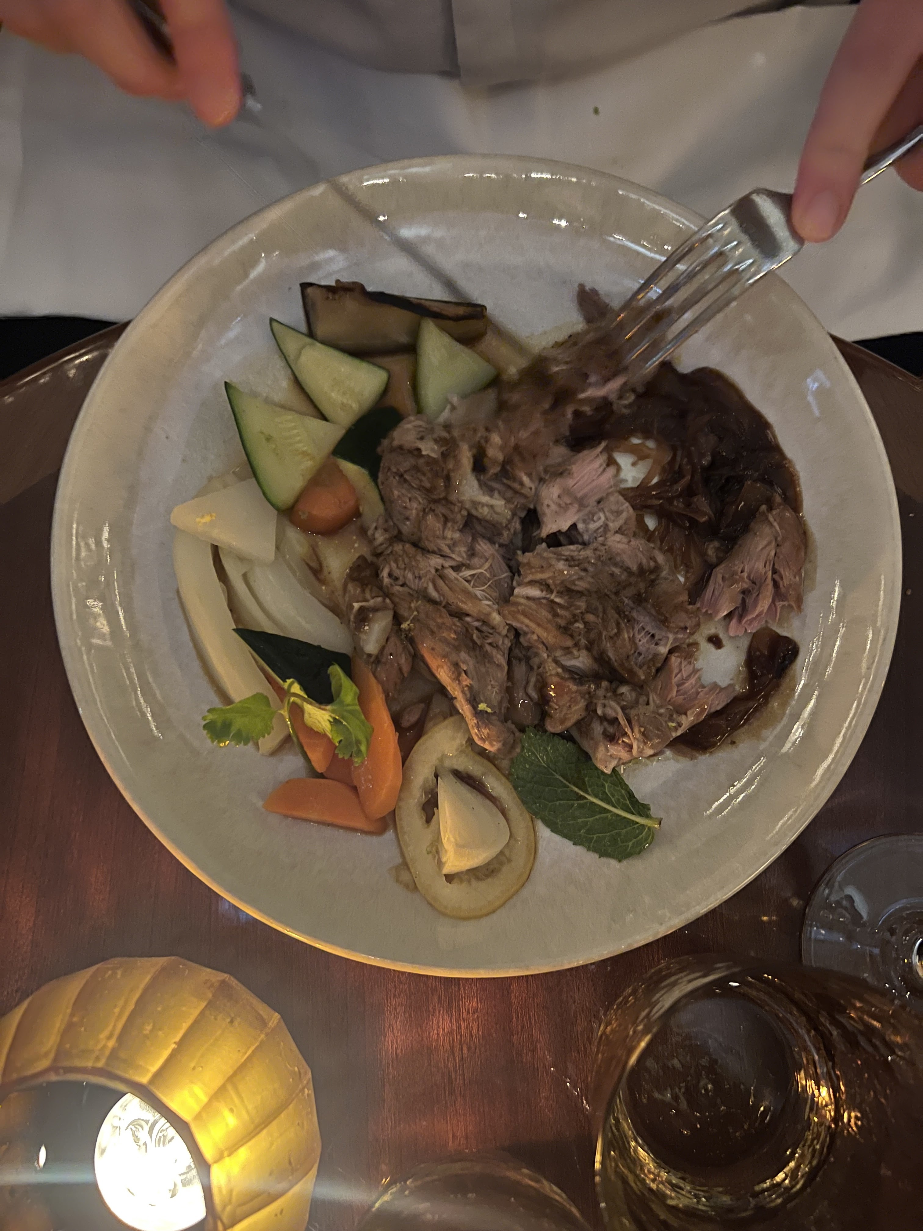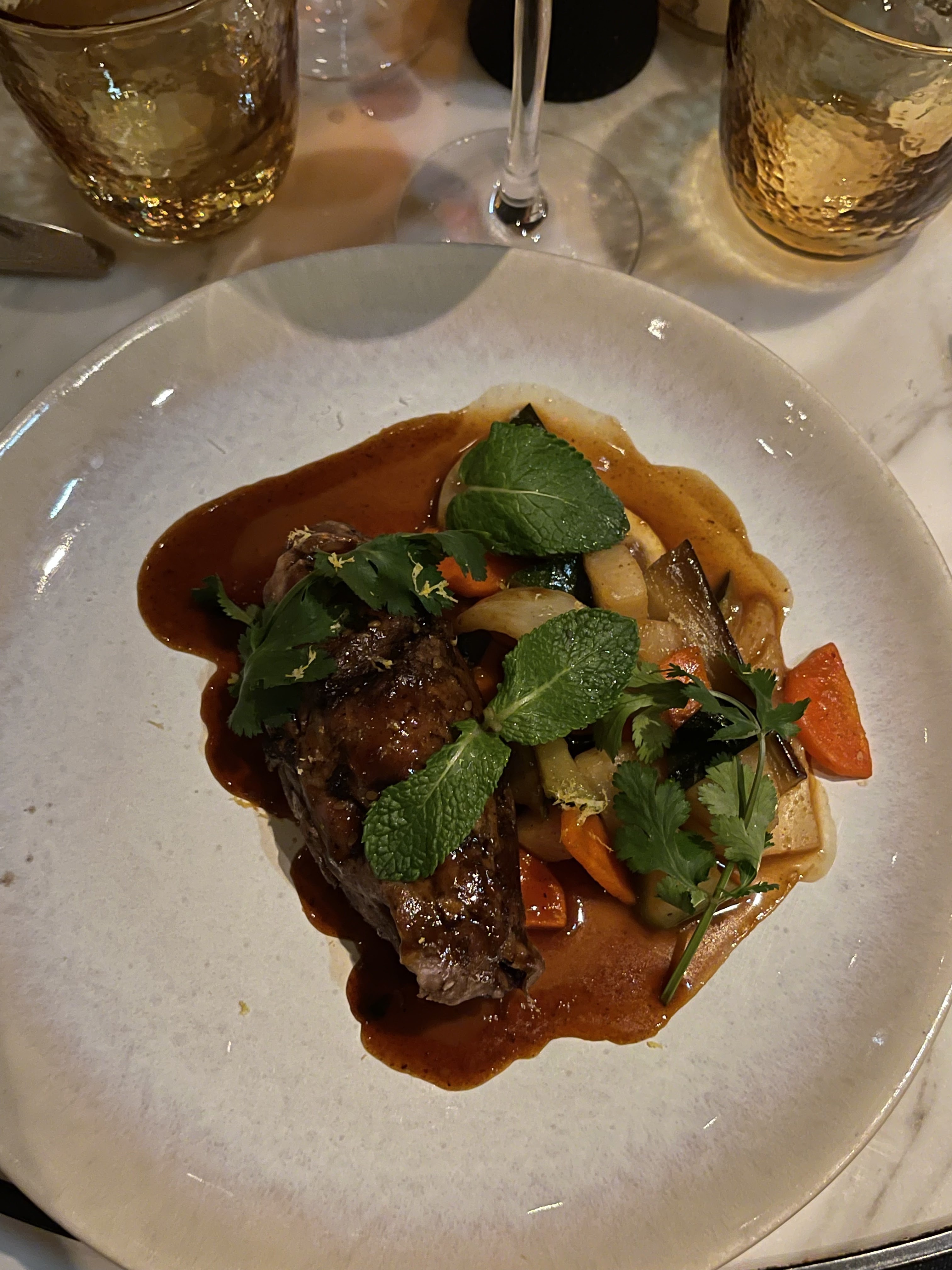 Nous arrivons pour le déjeuner, nous sommes accueillis avec le sourire dans ce restaurant qui offre un cadre très chic et contemporain, dans une salle d’inspiration 19e. La cheffe Stephanie le quellec propose une carte simple mais travaillée avec des plats sans chichis, généreux et extrêmement bien cuisinés ! Nous avons pris le velouté et l’os à moelle en entrée, puis le tartare et l’épaule d’agneau confite (qui n’avait pas de harissa à notre grande tristesse…).