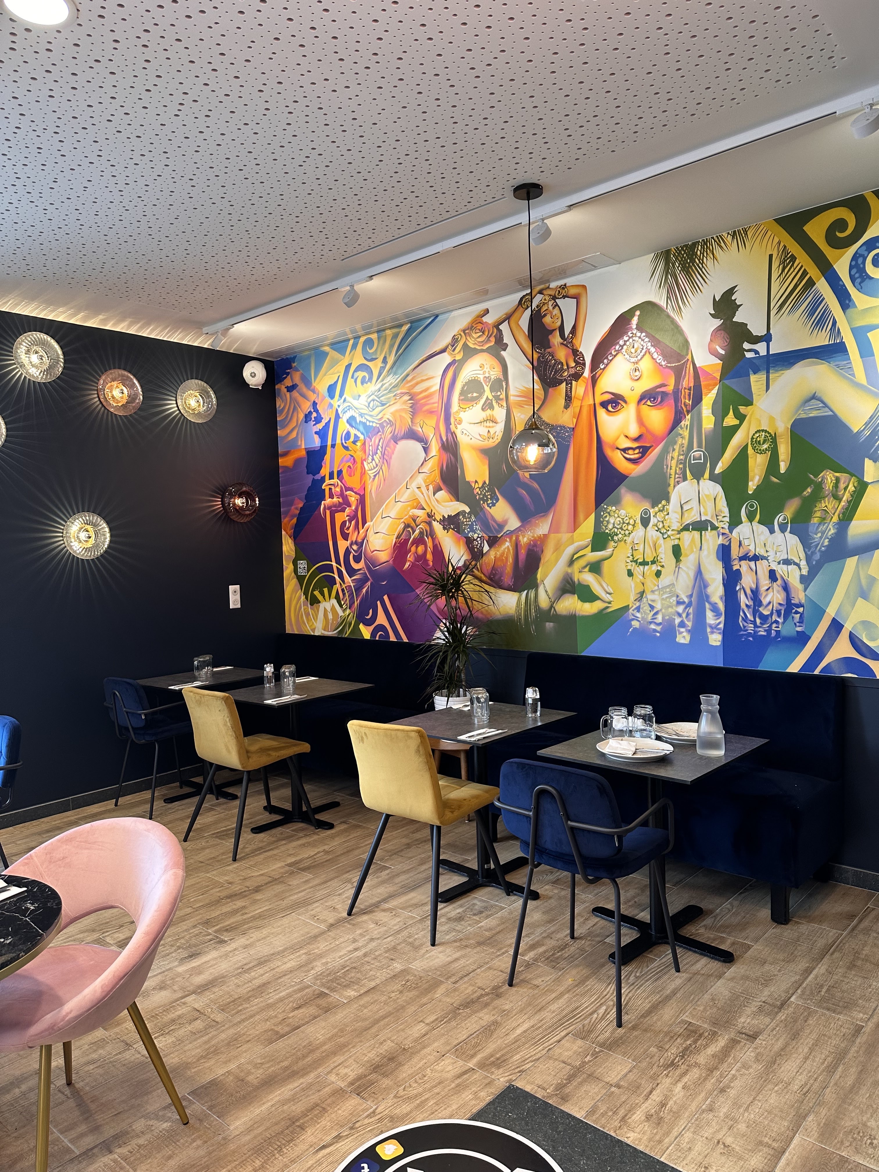 Super déco surtout les 2 magnifiques peintures. La cuisine est bonne et le concept original. Le service est agréable. Une adresse à retenir.