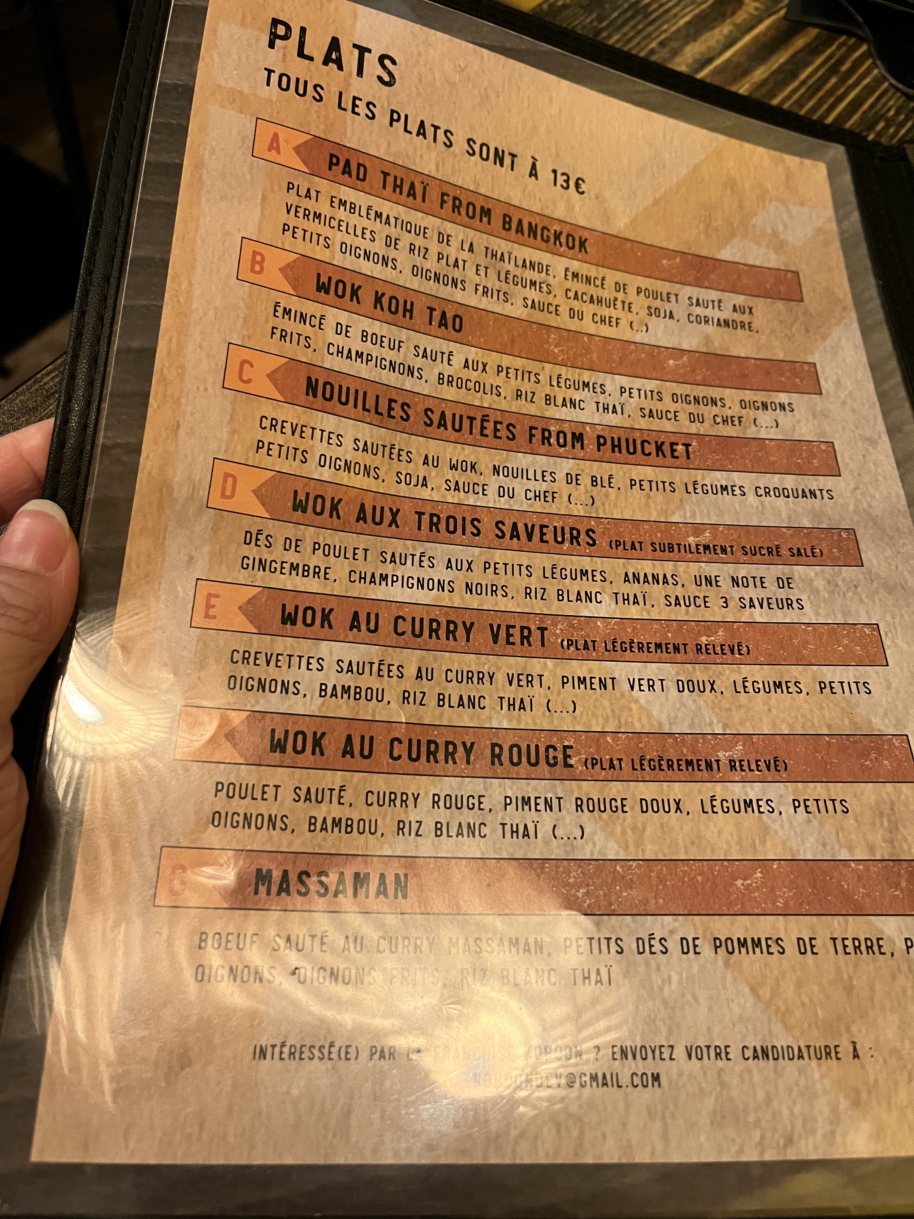 Les plats sont délicieux et copieux. Serveuse sympa Rien à redire. Par contre, il y a un courant d'air froid dans le restaurant... Désagréable quant on sait qu'en Thaïlande il fait 30 degrés quand on mange dans la rue.... Dommage et vraiment revoir ce problème de froid qui gâche le repas.