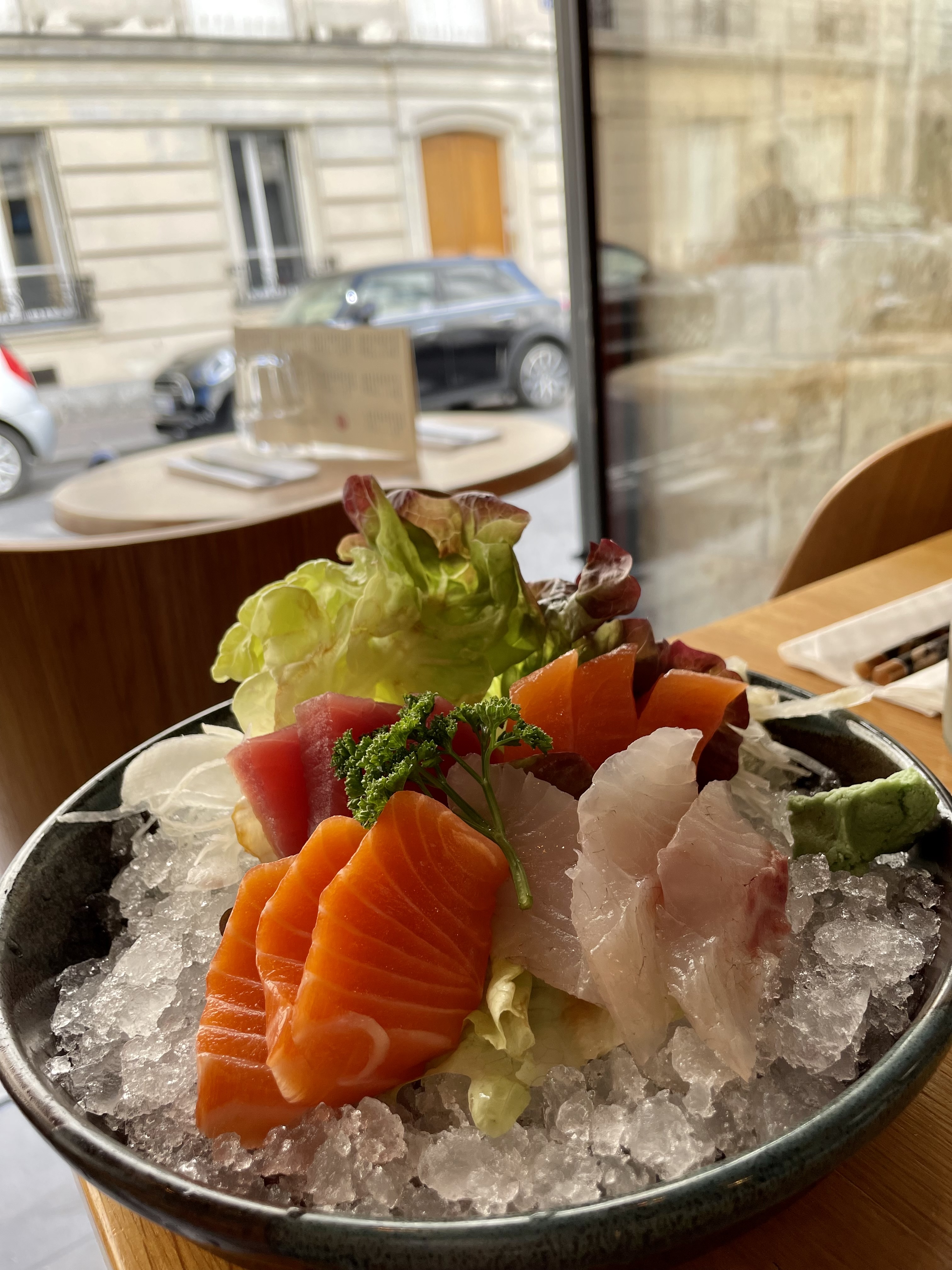 Un déjeuner sashimi merveilleux et surprenant que nous avons découvert en nous promenant dans le quartier de la Tour Eiffel. La qualité du poisson et la présentation du sashimi (sur lit de glace) me feraient croire que j'étais dans un restaurant japonais beaucoup plus cher. Cependant, les prix étaient extrêmement raisonnables et l'ambiance était pittoresque, avec des sièges en plein air dans une ruelle parisienne tranquille.