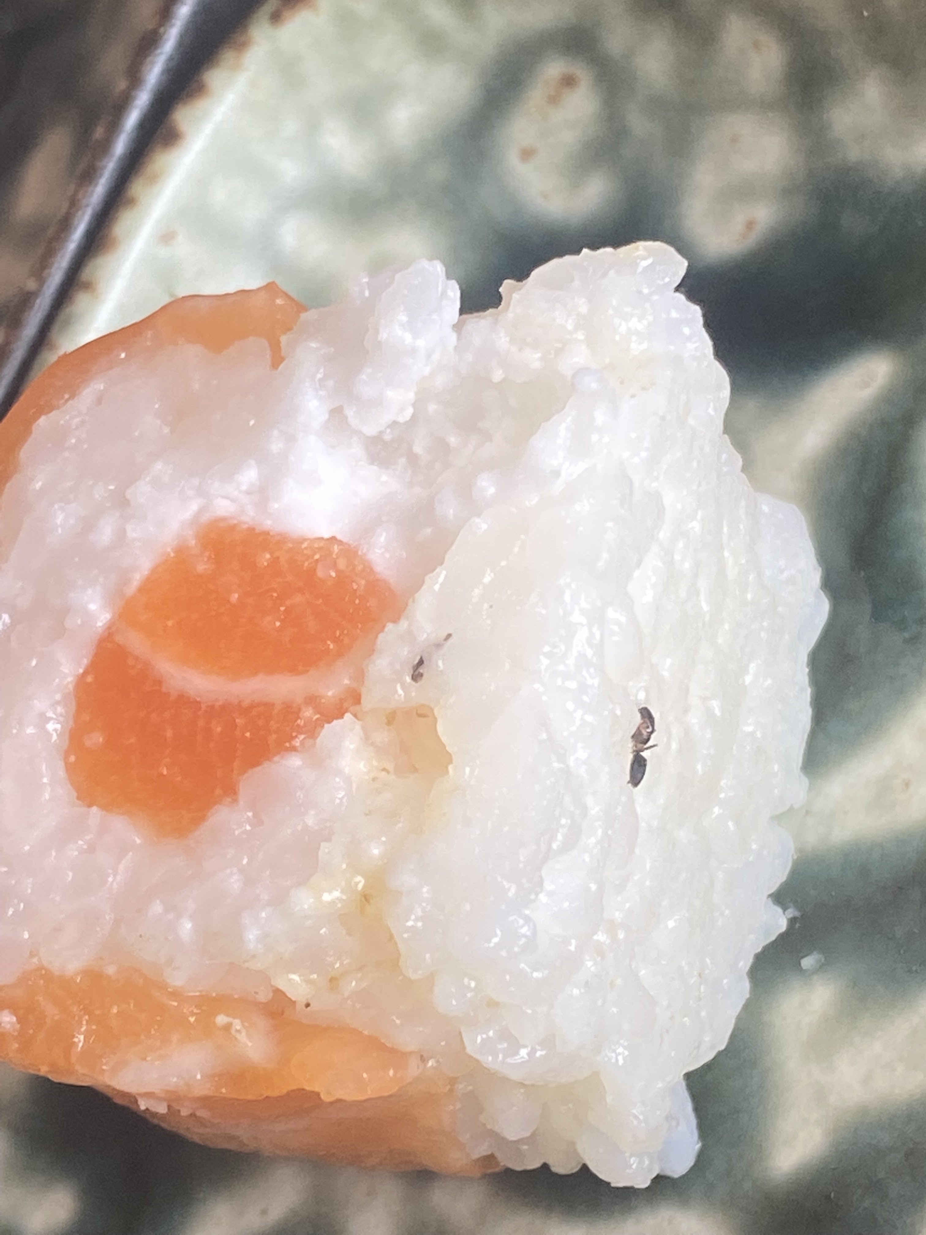 Autant les fourmis dans le sushi, ça ne devrait pas arriver mais ça peut arriver à cause de la chaleur etc.. mais charger son portable DANS le récipient contenant le riz cuit utilisé pour les sushis!!! Hygiène déplorable !!