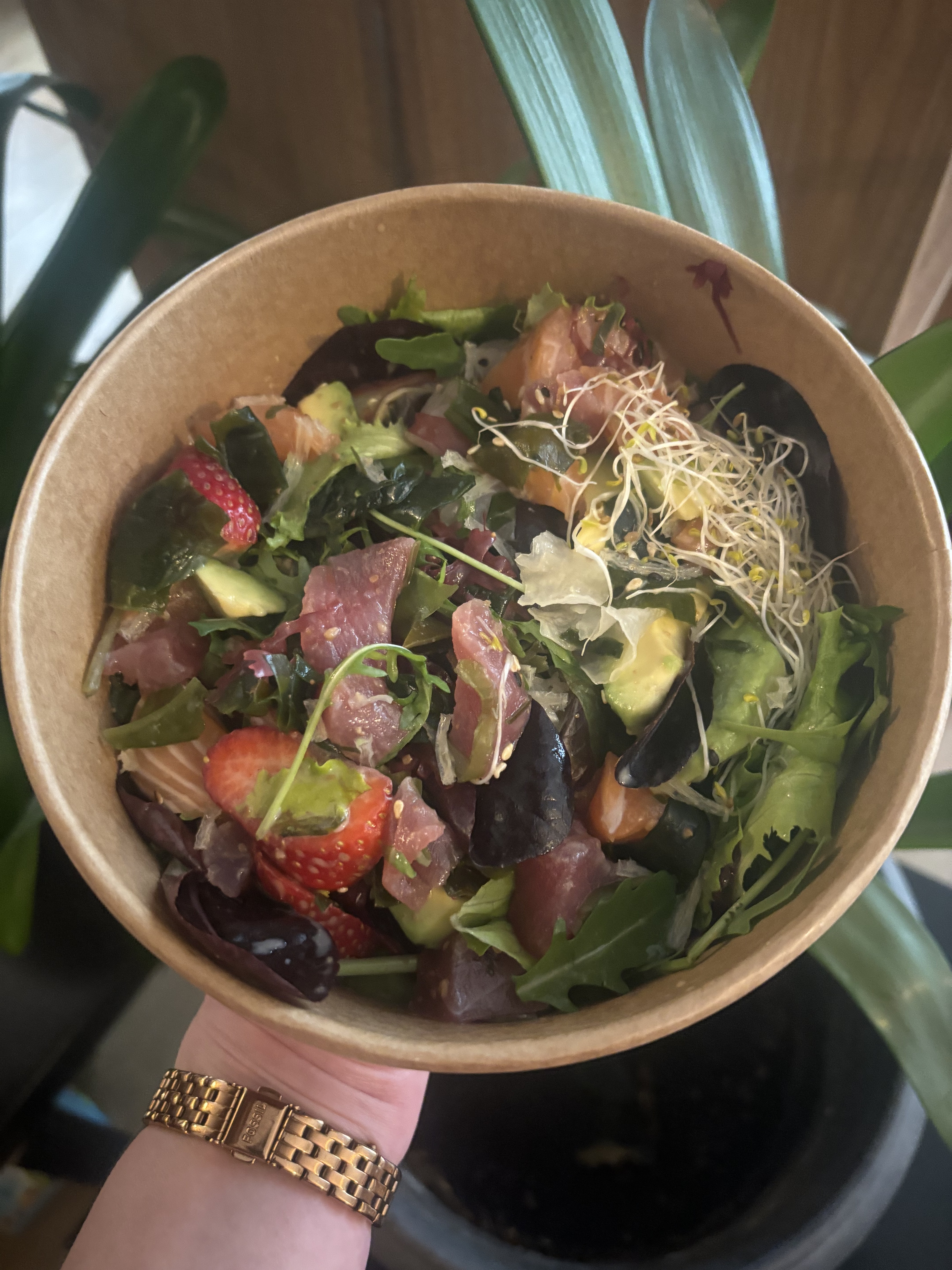 Excellente adresse . J'ai pris la salade koko : poissons crus et mesclun avec une super sauce sésame. Hyper frais avec en prime des bonnes fraises 😋