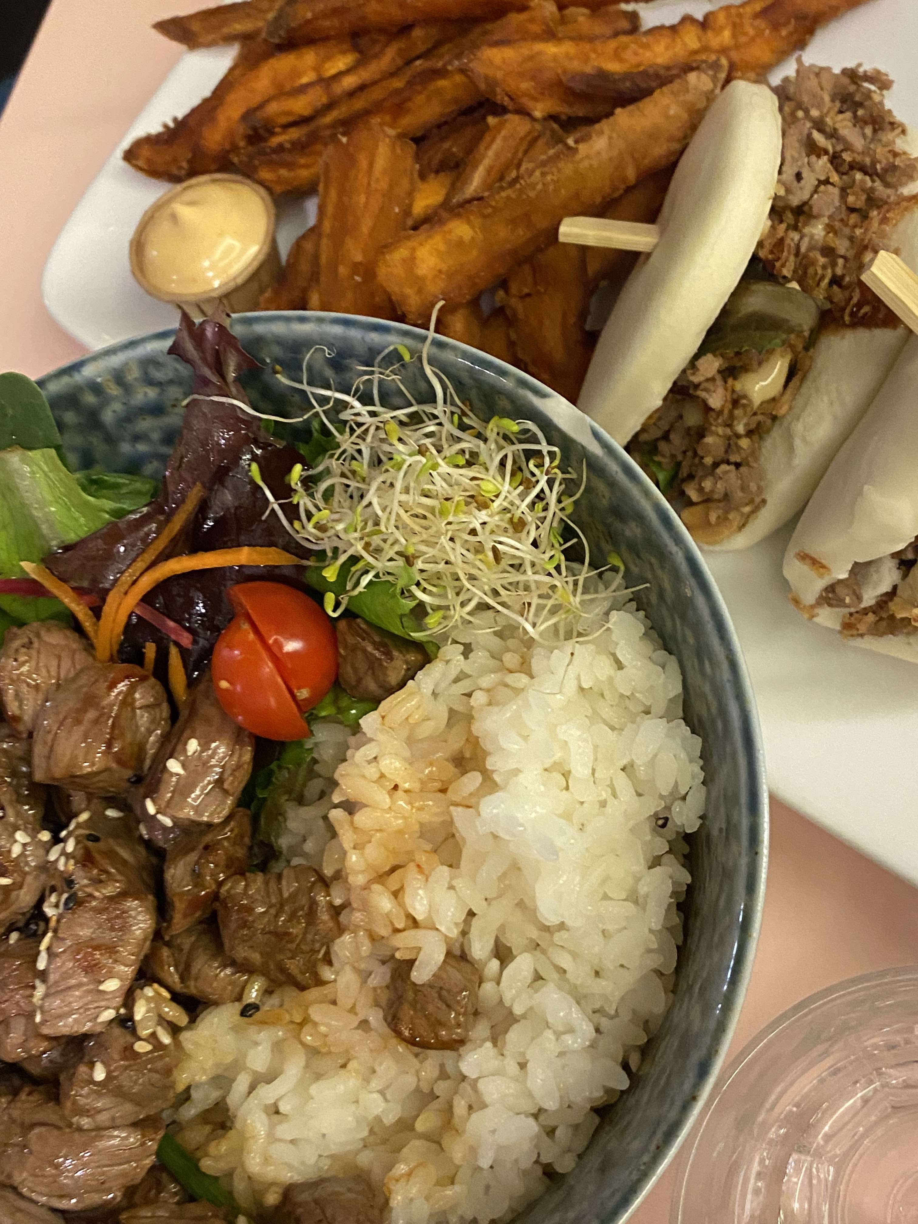 Très décevant! Du haché de boeuf 10grammes par sandwich max puisqu’ils sont quasiment introuvable et broyés en mini morceaux. Donc on mange du pain vapeur, des oignons frits et des cacahuètes! Très cher pour le prix et gustativement pas de goût et sec! Et doute sur les gyozas pas frais ni fait maison…déçu mais 2* pour les frites de patate douce maison!