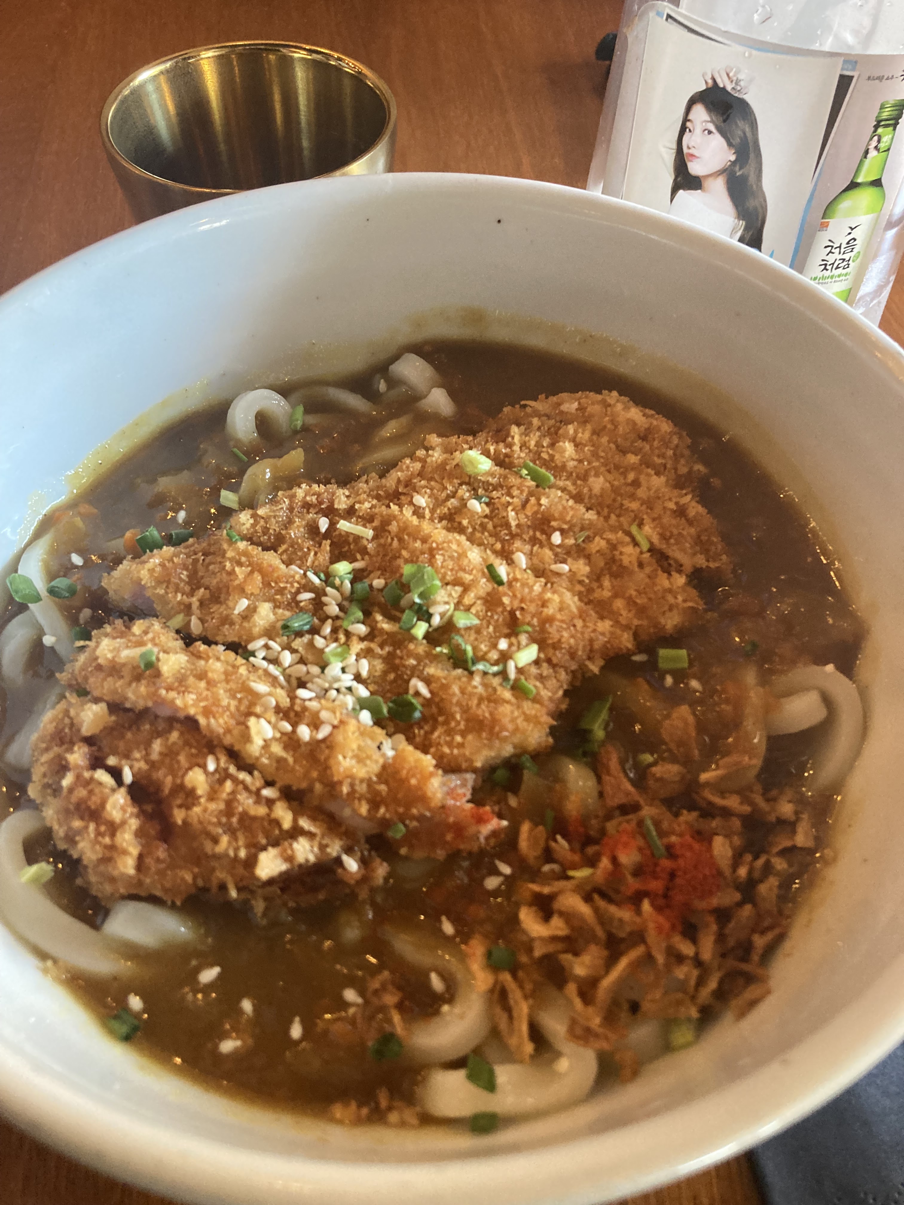 Je prends rarement le temps de mettre un avis, mais ce restaurant vaut définitivement le coup. Commençons par l’accueil. Irréprochable. Un apéritif est offert, et la carte est disponible avec des photos pour permettre de mieux choisir ses plats. L’entrée, du poulet frit sauce sucré-salé, était délicieuse. Le poulet fond en bouche. Pour le plat, des pâtes sauce rosée accompagnées de poulet pané, le constat est le même. Les portions sont généreuse, et les saveurs réellement originales. Le tout dans une ambiance coréenne chaleureuse, fidèle jusqu’à la carafe d’eau. Bref, j’y reviendrai sans l’once d’un doute !