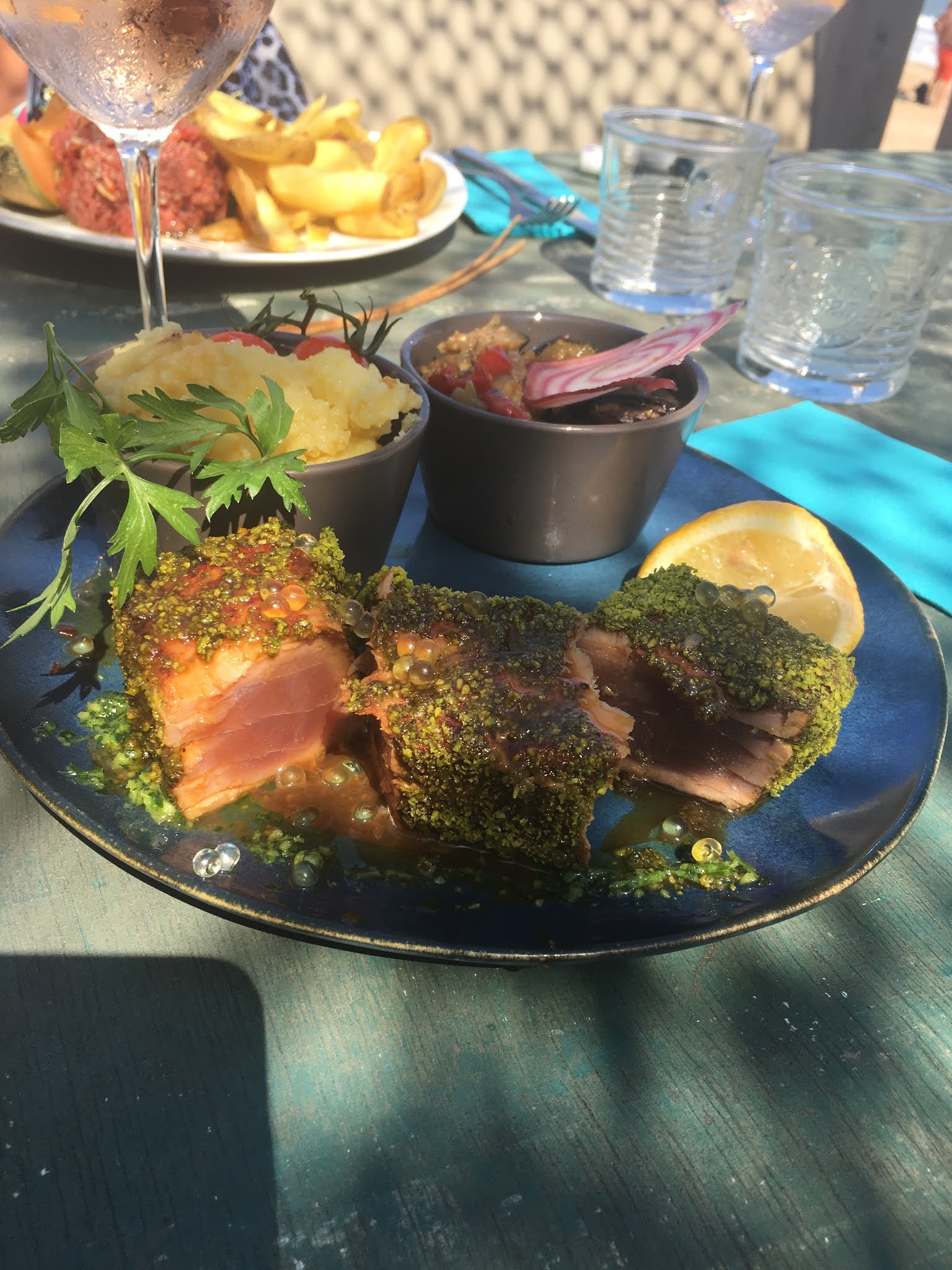 Cadre très sympa, bon choix à la carte et nourriture de qualité, la quantité est là et c'était très fin. Le gros bémol c'est le service, dommage pour cet établissement de ne pas avoir d'employés à la hauteur, du moins pour 2 des serveuses, une autre serveuse et le plagiste avait l'air plus pro. Première serveuse, qui blablate bcp (on a entendu une serveuse lui dire qu'elle papotait déjà alors que c'était le début du service) mais qui mets 30mn pour vous apporter vos apéros qui sont sur le bar depuis plus de 15mn. Résultat rosé qui arrive pas frais, elle propose des glaçons c'est plutôt bof. Pendant le repas on demande une carafe d'eau qui finalement arrive à la fin du repas avec un tenez si vous avez soif... avec la voix fausse et aiguë 👌😁 Dans l'après midi nous allons au snack prendre 2 boissons, après une attente de plus de 10mn alors qu'il n'y avait qu'une cliente pour 2 paninis et qui ralait de l'attente. Elle nous sort là il faudra repasser je suis débordée 🤔 vu comme elle brasse de l'air et aucunes organisations ça se comprend! Mais j'ai trouvé exagéré et suis allée au bord du restaurant, une personne sûrement le responsable est venue de suite nous servir. Moins d'une minute pour le faire je pense que la serveuse aurait eu le temps!! Bref changez d'équipe!