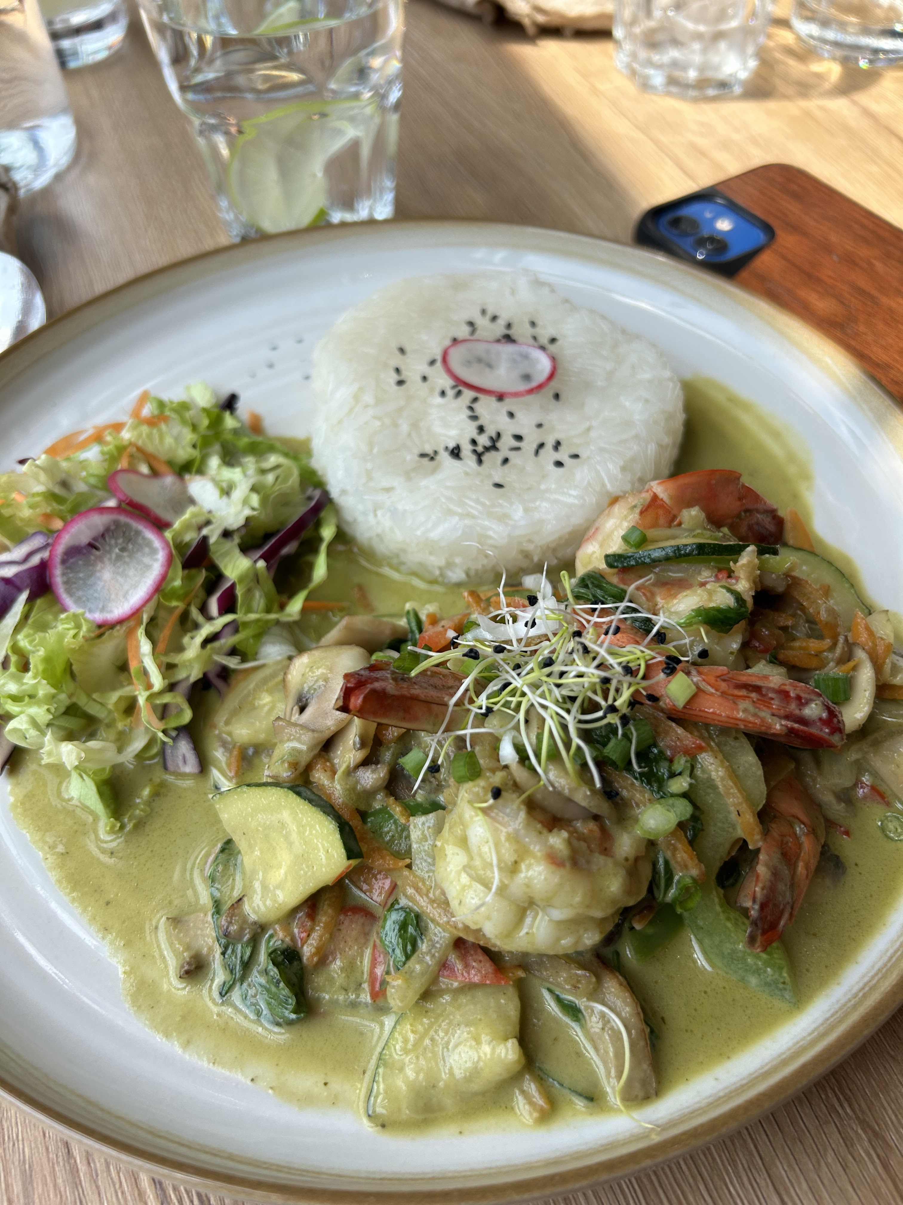 Très bon repas, nous avons pris les pâtes de riz sautées au wok avec crevettes, le curry jaune de dorade royale et les nems au chocolat, tout était très bon; cocktail mai tai délicieux; service impeccable, le personnel est très accueillant et aux petits soins!! Nous reviendrons avec joie!!