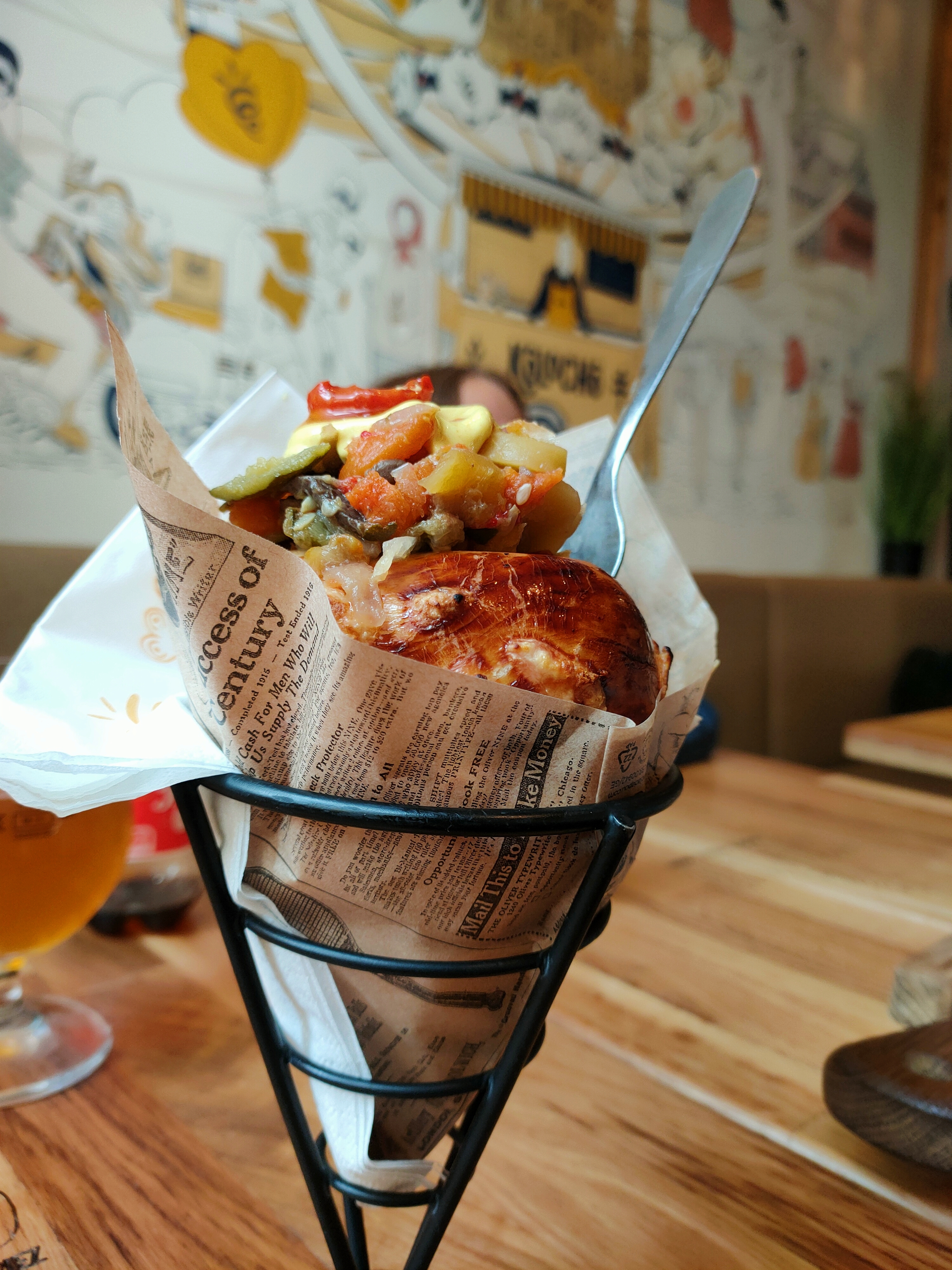 Venu en coup de vent à 12:45, bonne surprise (peut être moins pour eux) mais assez peu de monde dans la salle. Bon accueil malgré tout et on m’explique rapidement le concept. Je fais le choix d’un « Royal Burger » accompagné d’une sauce roquefort maison. En boisson le classique local, le breizh cola. Et en dessert j’ai opté pour un Krumble pommes caramélisées. Je n’avais pas vu de suite que le restaurant proposait des spécialités d’Europe centrale (les kôlochô du coup) mais ça a l’air sympathique, à essayer une prochaine fois. À l’arrivée du plat, petite déception, les frites ne sont clairement pas maisons. Par contre très bon point concernant le bun de mon burger, il est excellent, il est affiché comme étant maison, et j n’ai bien envie de le croire. La sauce biggy est correcte bien qu’un peu basique, le steak correct, et le reste a l’avenant. C’était un plutôt bon burger, gourmand comme il faut. La sauce roquefort maison pour les frites était très bonne, je l’aurais préféré à la sauce biggy dans mon burger ! Les frites étaient mollassonnes et pas très qualitatives. Mais c’est cohérent avec des frites industrielles comme celle ci. Bref au global, c’est très correct. Lencrumble maison était plus crumble que réel contenu, mais bon ça me va il était bon. Dommage qu’il n’y avait pas plus de pommes caramélisées car elles étaient top aussi. Bref au global, j’ai bien mangé pour une somme relativement correcte. À essayer donc ! Enjoy !
