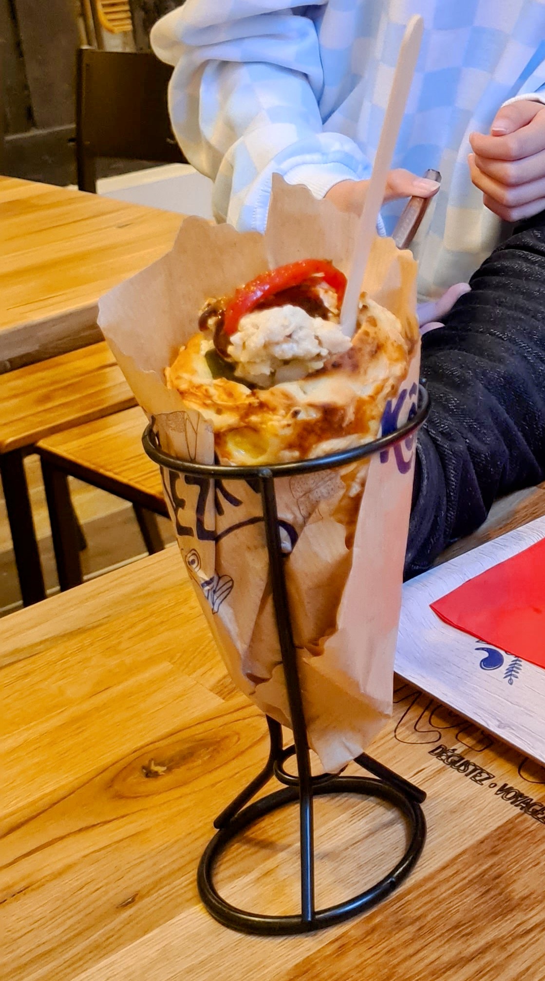 Très original et bon! Nous avons été bien accueillis. Le seul bémol : la sauce coulait au fond du cornet et lors de la préparation du sac à emporter les serviettes ont été oubliées...