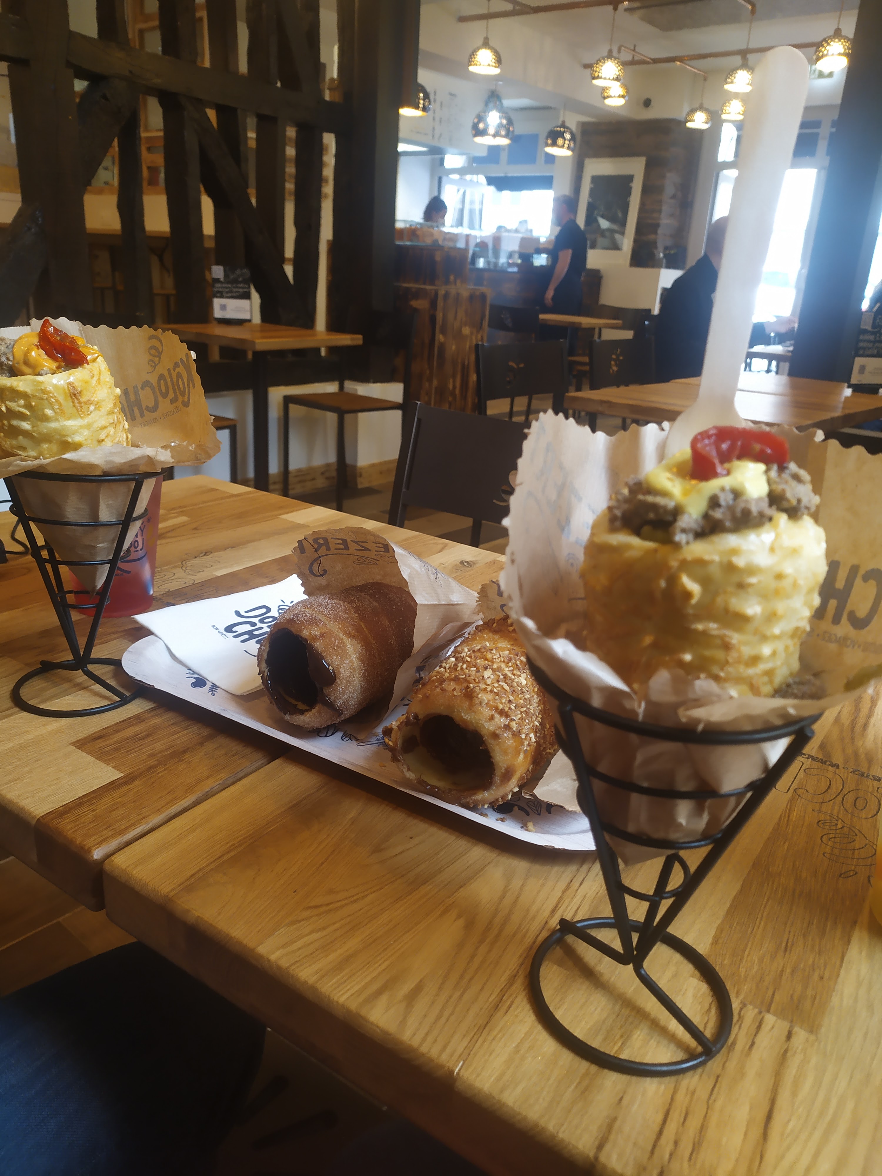 Je connaissais ce délicieux dessert venu de Hongrie mais que j'ai eu le plaisir de manger à Prague et là j'ai eu l'occasion de le goûter salé avec une saucisse à la sauce Andalouse, très bonne surprise et surtout très bon endroit, de l'accueil très chaleureux et convivial au cadre très sympathique tout y est fait pour passer un excellent moment! Gros coup de coeur pour la boisson fraîche fraise cranberry j'adore!! Un endroit à faire et refaire sans souci de plus très bon rapport qualité prix: 15€60 pour le salé, le sucré et la boisson.