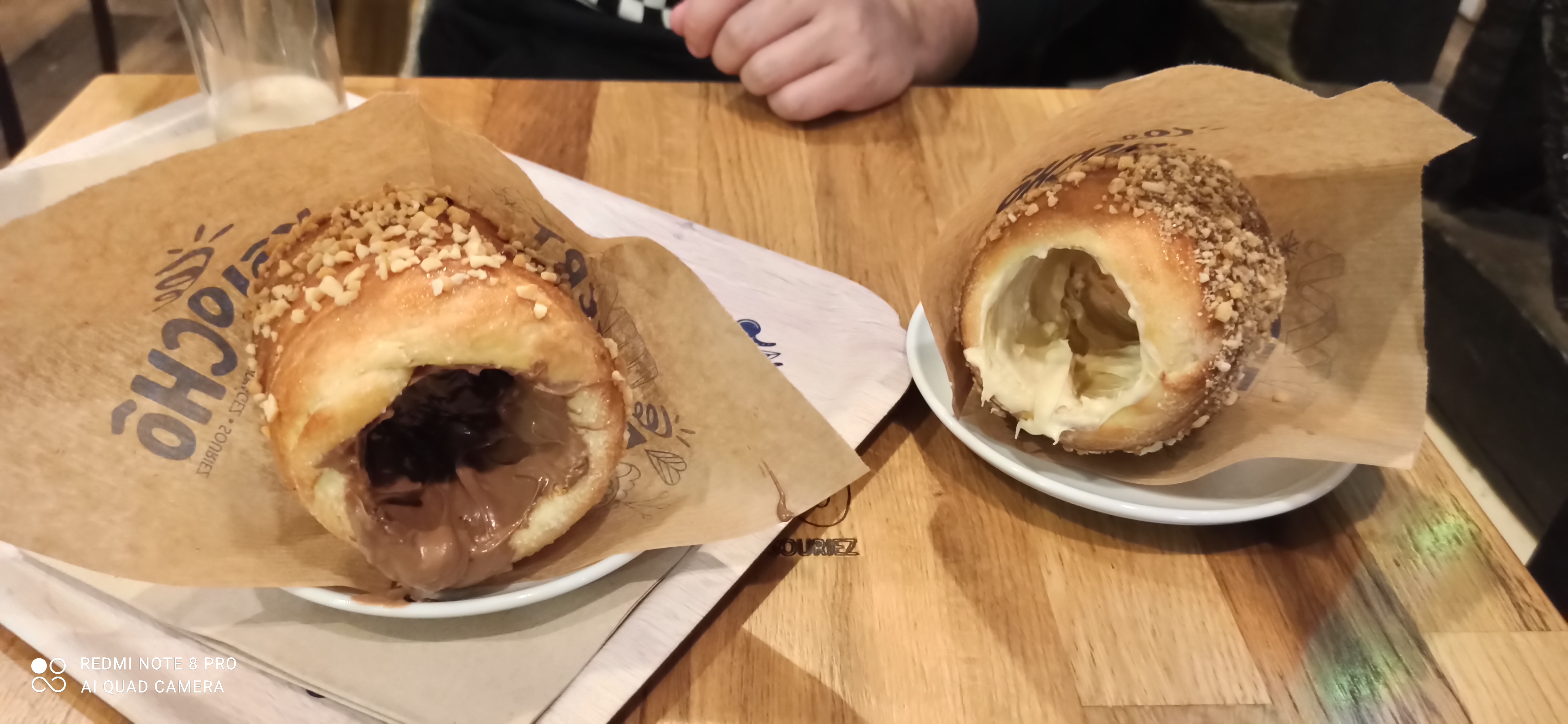 À mon tour d'apporter ma pierre à l'édifice, édifice où festin rime avec destin, destin, ce même mot à l'origine d'une histoire peu commune que vous aurez l'opportunité de lire pendant que vous mangerez si, comme moi, voyageur solitaire, vous n'avez personne à qui faire conversation, pendant le repas, et qui vous expliquera pourquoi vous vous retrouvez actuellement à manger une spécialité slave en Bretagne. Pour la modique somme d'une douzaine d'euros, vous aurez l'occasion de déguster une formule complète avec boisson maison, et brioches fourrées (pour ma part) à aux pommes de terre, lardons et fromage à raclette pour ma version salée, et fourrée au chocolat avec de la praline tout autour pour la version sucrée. Bien sûr, vous avez bien d'autres choix, mais je fût très satisfait de ces deux là ! L'endroit est donc évidemment recommandé et recommandable bien qu'à ce stade, mon avis ne face pas la différence, puisque 99% des clients semblent satisfaits de leur expérience avec la brioche venue d'ailleurs. Le patron est sympathique, bien que peu bavard ce soir là je pense. J'aurais préféré qu'il me raconte son histoire plutôt que j'ai à faire la conversation avec une feuille de papier me l'a racontant. Mais c'est un détail ! (P.S: en plus, il y avait des fautes d'orthographe ! 😋) Je vous souhaite évidemment bien du succès pour votre projet futur, cela en vaut largement la peine. Au plaisir de venir découvrir d'autres saveurs une prochaine fois.