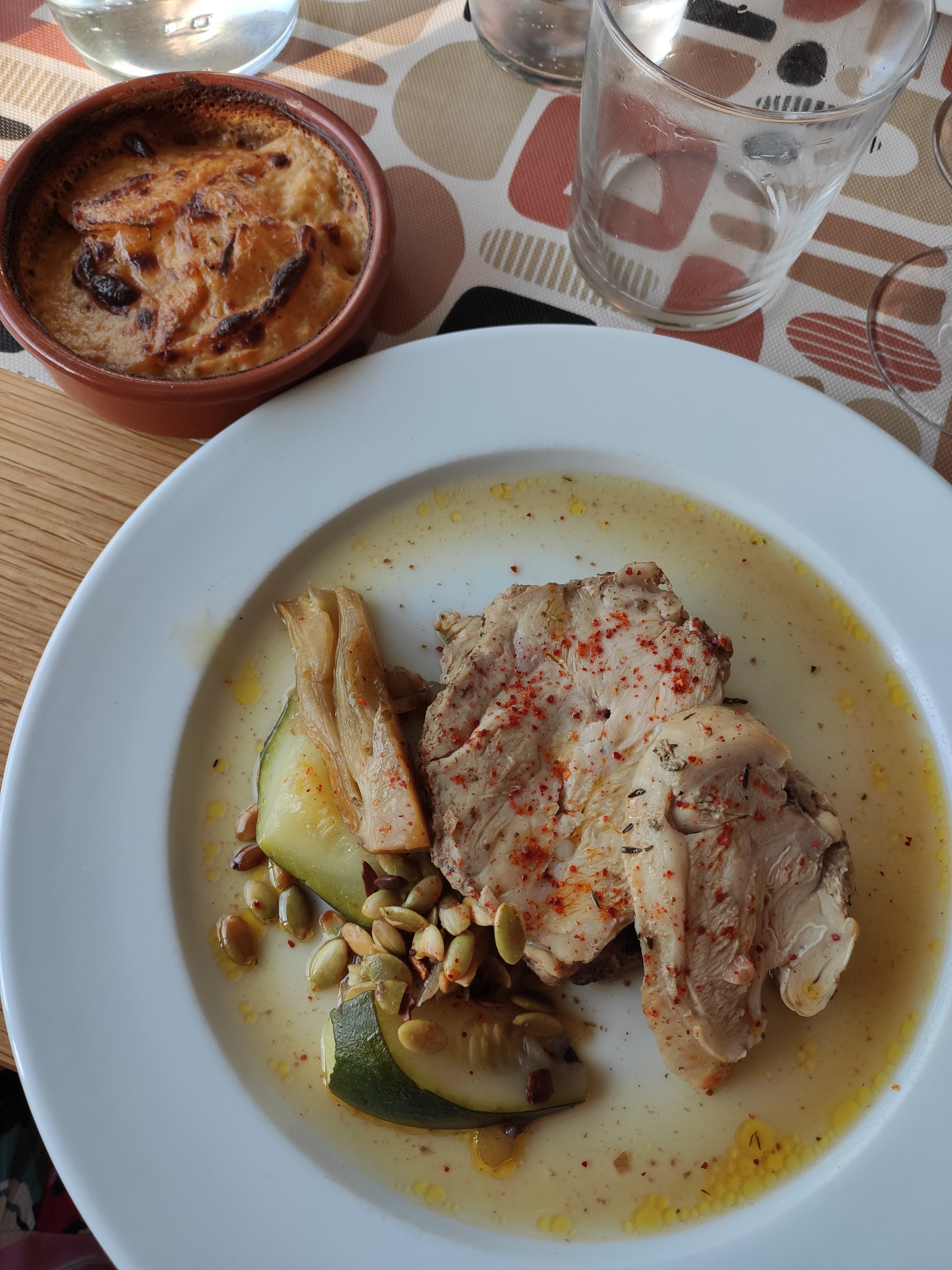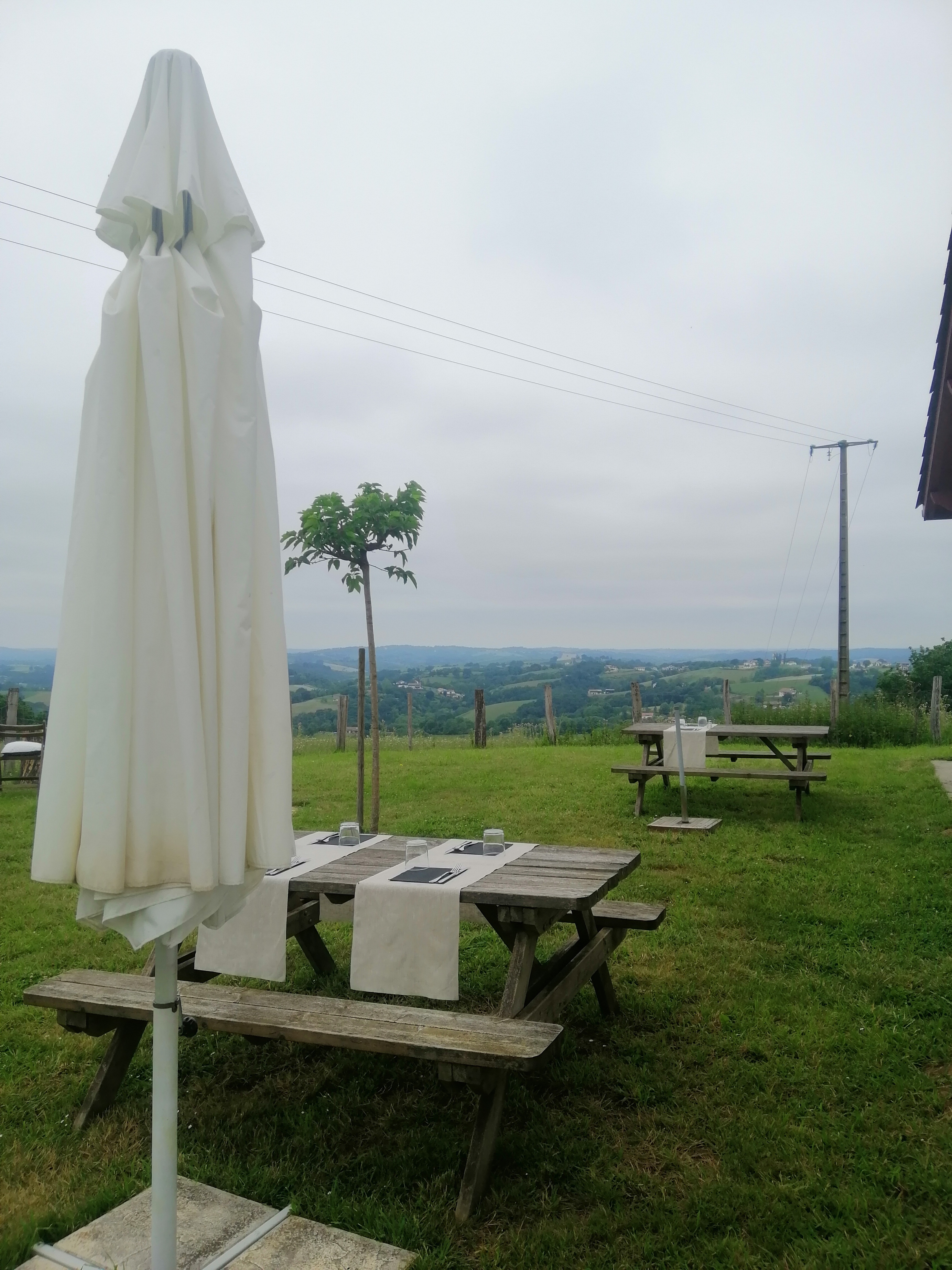 Plats bien préparés avec cuisson parfaite (foie d'agneau puis porc). Bien copieux. Un peu déçue par le rosé que j'ai trouvé acide. Cadre rural très agréable au calme et vue superbe. Bonne expérience.