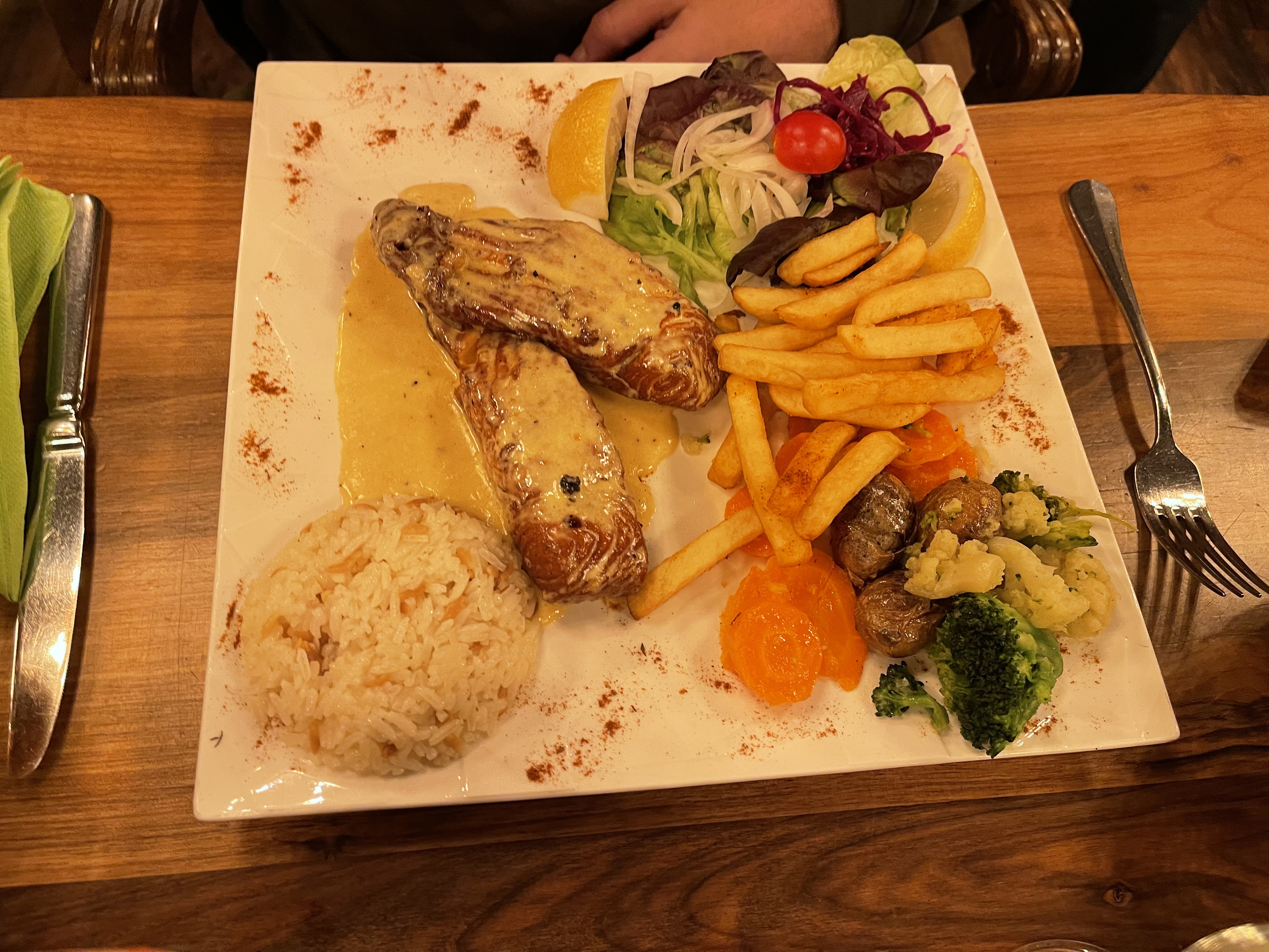 Lieu et accueil chaleureux, belle décoration. Le restaurant est grand avec une ambiance familiale. J’ai pris le saumon à la crème pour changer des grillades, c’était bon mais le saumon était trop cuit malheureusement. En revanche service rapide malgré le monde.