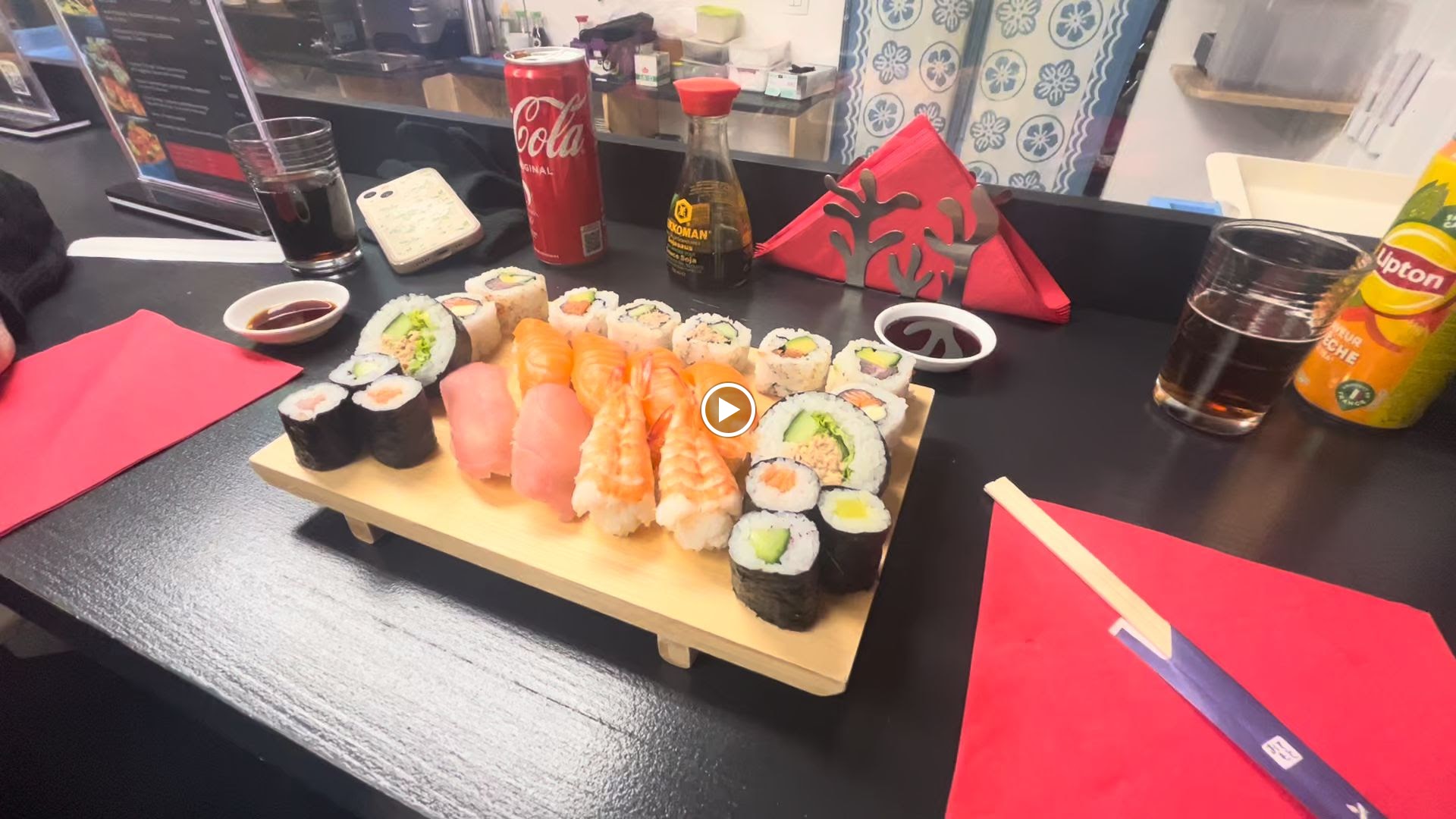Un service très rapide ,un bonne accueil des gens chaleureux.J ai commandé un plateau de sushi pour 2 et la nourriture était excellente je recommande vivement