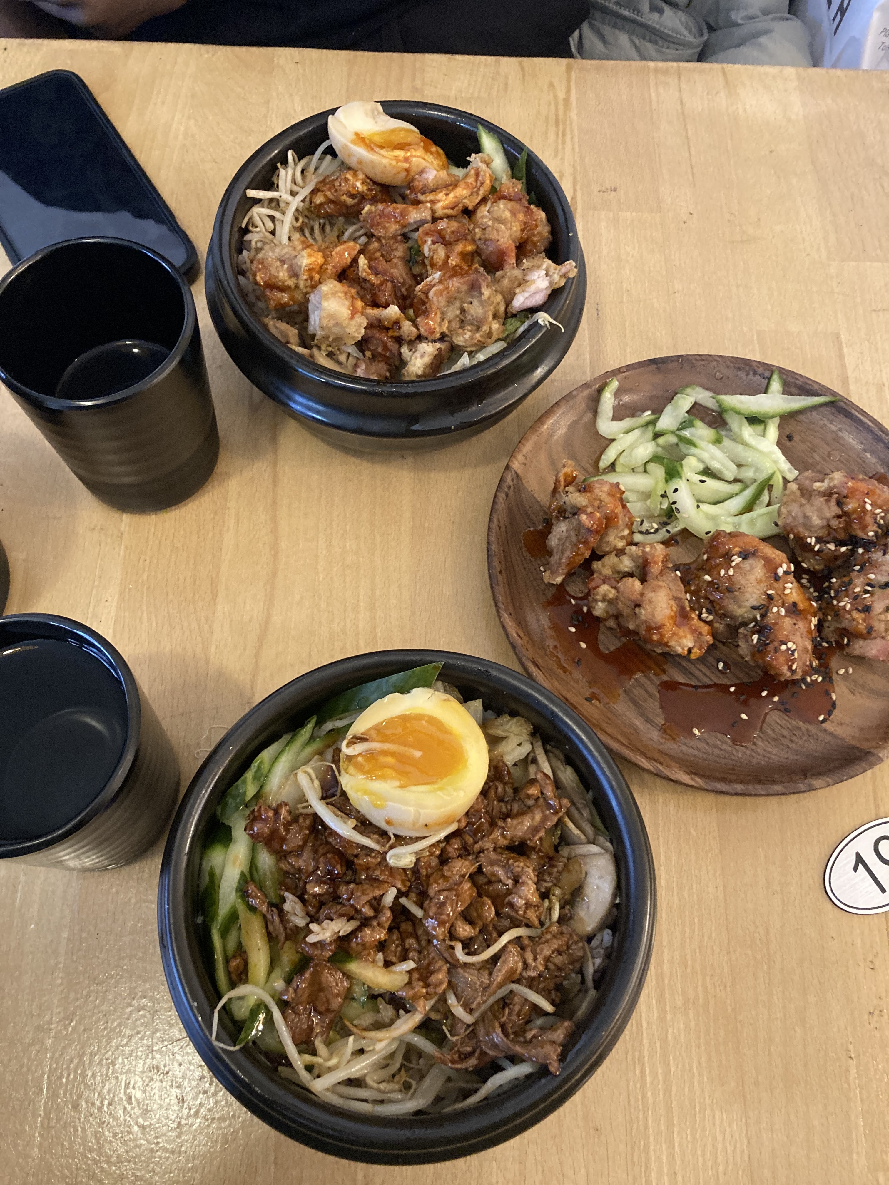 Lieu très amical, service au top. J'ai pris le plat partage + ttobbeoki + les bibimbap bœuf/poulet. Repas copieux , servi dans des magnifiques bols noirs. Concernant la boisson, j'ai choisi une boisson coréenne. Je recommande +