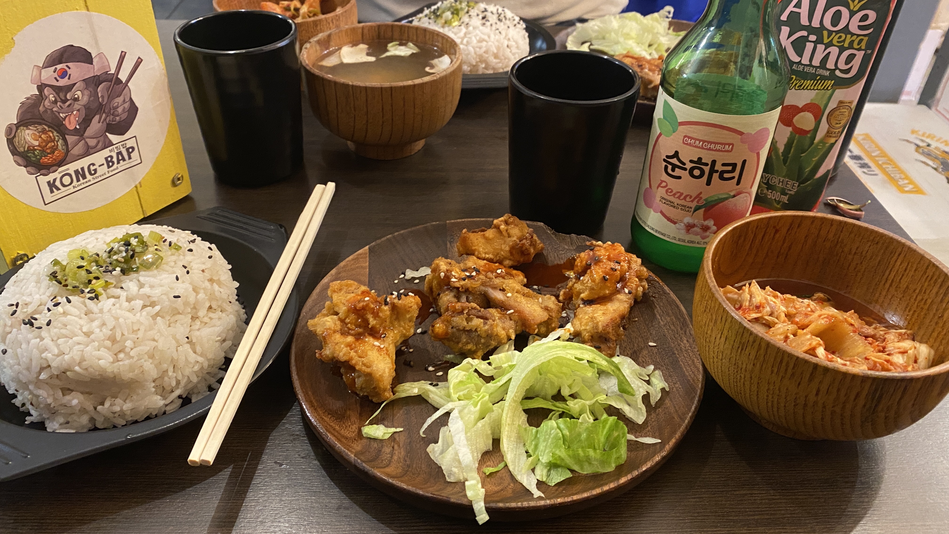 À la base, ma compagne et moi voulions manger Japonais, mais nous n'avions jamais goûté la nourriture coréenne. Nous avons donc décidé de nous fier aux avis pour jeter notre dévolue sur le resto Kong bap (on aime bien le logo avec le gorille) Nous avons pris le Chimaek pour 2. Poulet pimenté servi avec du riz et bière coréenne plus un maki Salmon Fried. C'était vraiment trop bon. Le poulet, une merveille ! 🤩 Tendre, et cette sauce qui le recouvrait au miel/piment une bombe 💥 Personnel très sympas et cadre agréable et convivial (c'est petit). Foncez au moins goûter. Nous, on a bien fini les plats (voir photo)