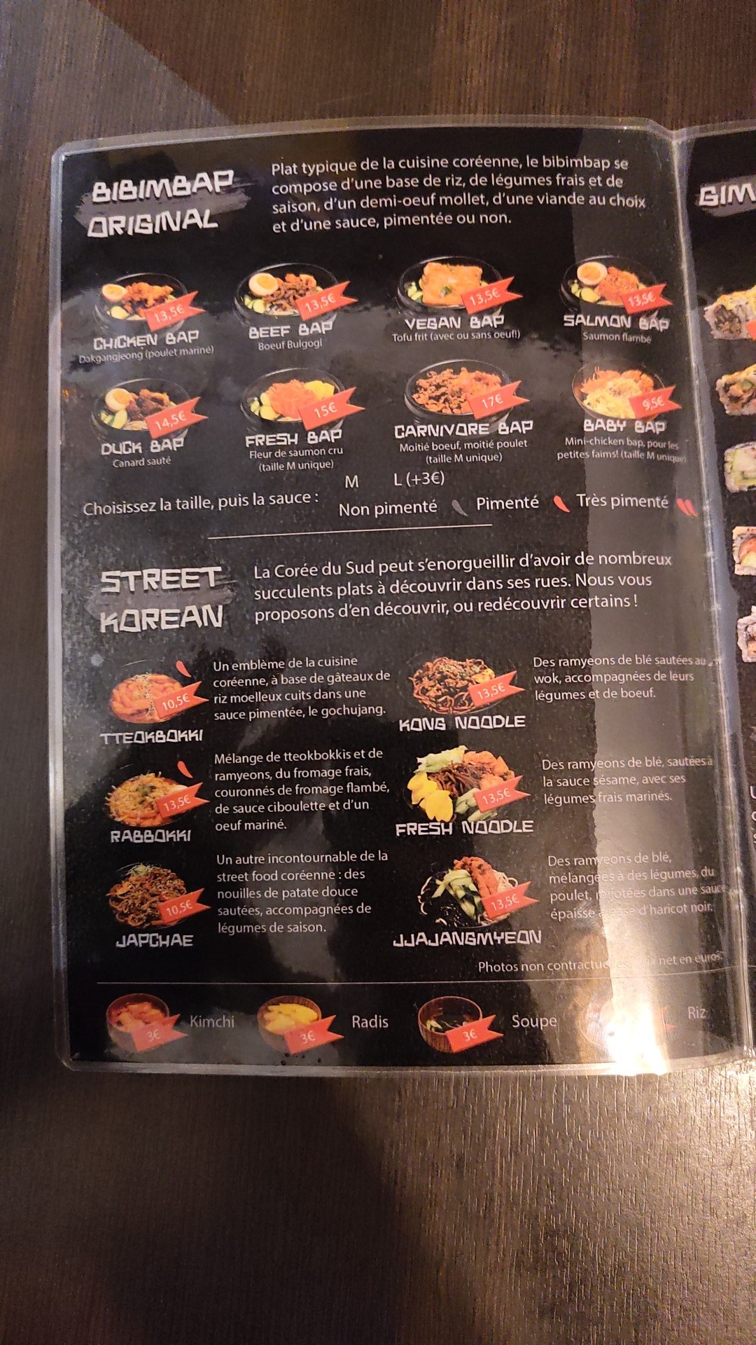 Étant déjà allé au Kong Bap de Palais de Justice j'ai voulu tester celui-ci. J'ai tenté un bibimbap pimenté et étonnamment ça va, faites quand même attention si vous ne supportez pas le piment à bien le préciser. Si jamais vous pouvez demander la sauce pimentée à part (très bonne idée) Je conseil ! (Big UP a celui qui fait la playlist Kpop !) PS : nouvelle carte