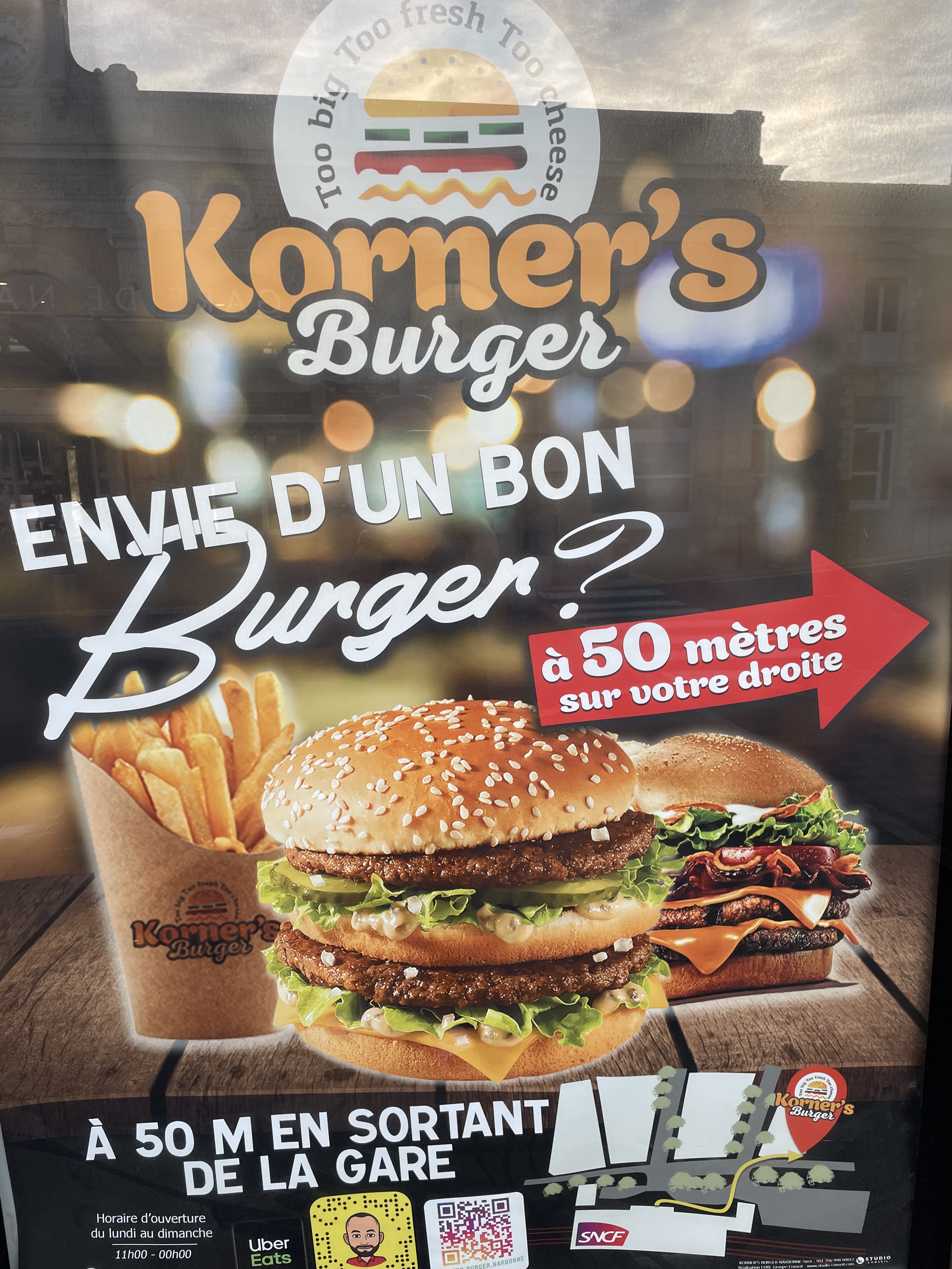 Si, suite à une panne, la SNCF confond 70 minutes d'arrêt avec 10 minutes, sachez que l'équipe du Korner's Burger sera capable de préparer votre repas en quelques secondes et de vous éviter de passer votre journée à Narbonne contre votre volonté ! Excellent rapport qualité/efficacité !