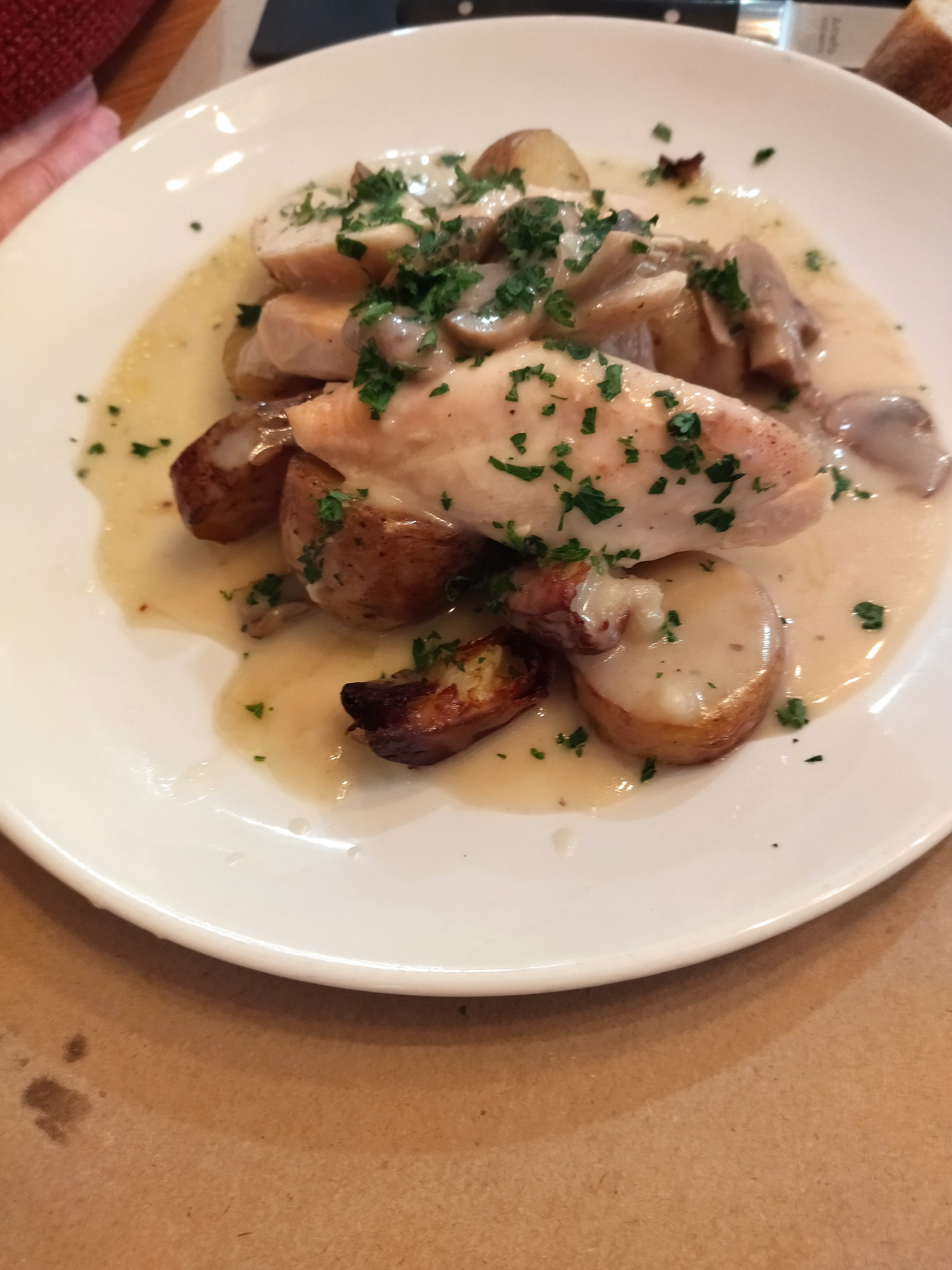 Petite terrasse derrière le restaurant agréable accueil sympathique ,suprême de volaille et sa sauce au brie très bon, prix abordables 👍