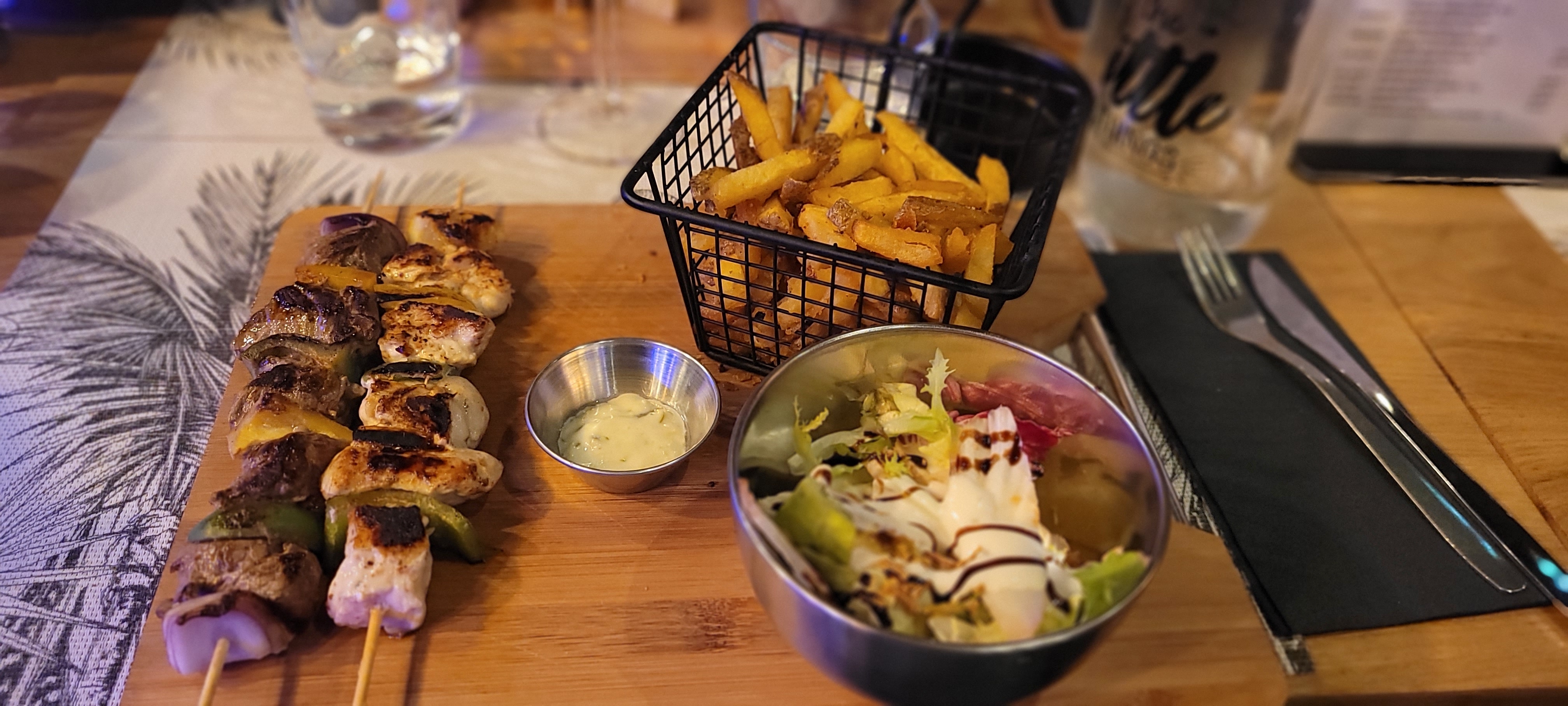 Lieu sympa, ambiance un peu trop feutrée/lounge à mon goût mais le rendu est agréable. Le prix des verres de vin est excessif (comme dans beaucoup de restos). Frites excellentes mais je n'ai pas eu de chance sur le bœuf qui était trop dur (alors que l'autre brochette de poulet était top). Je mets 5 étoiles car j'ai été suffisamment convaincu pour y retourner plus tard