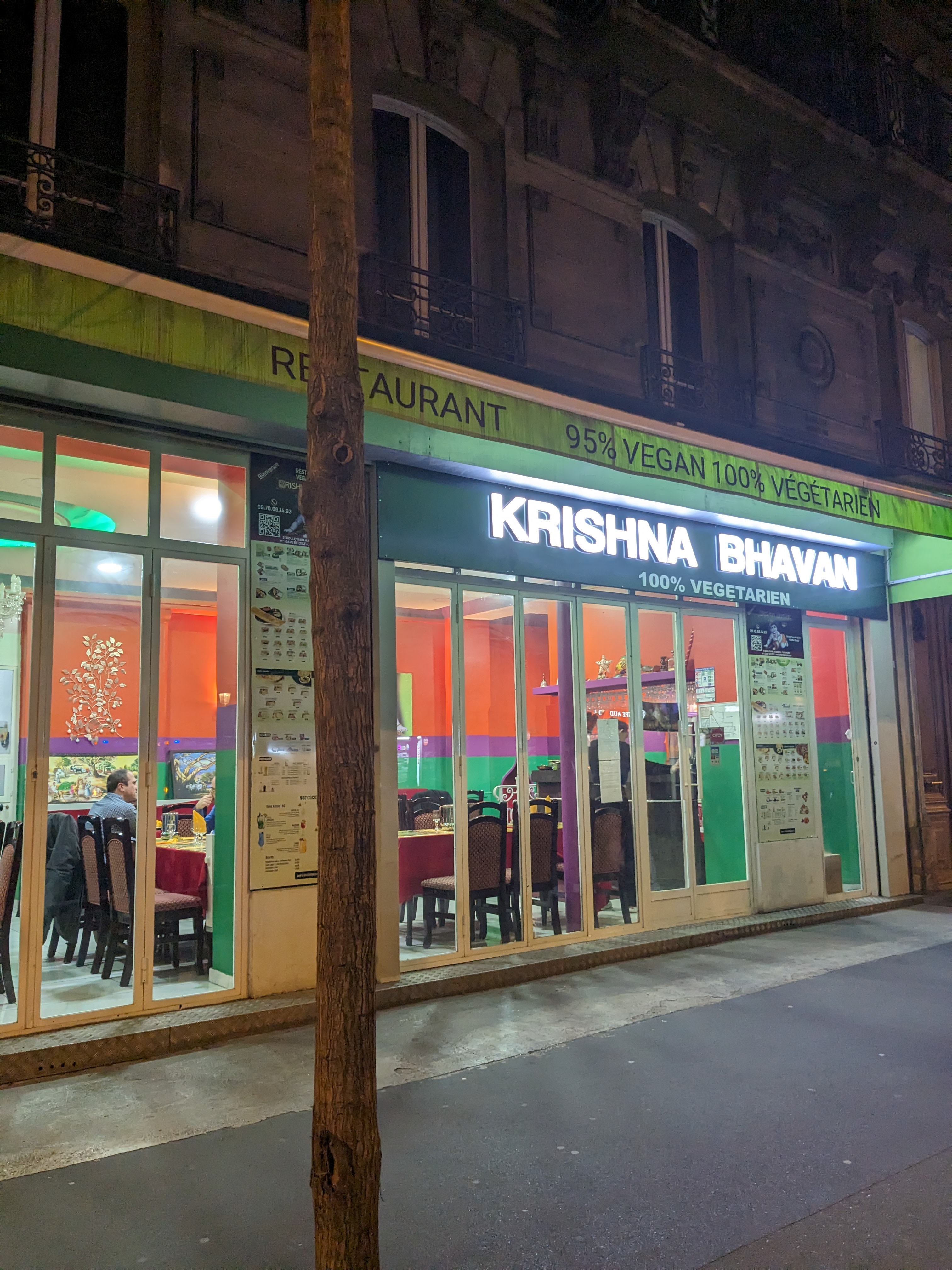 On m'a dit que c'était très bon et que c'était une annexe du même nom de la rue Cail dans le Xè, alors j'ai tenté moi-même sur place. J'ai pris des rolls végétariens ainsi que des parottas avec des curries et un lassi mangue. C'était vraiment très bon. J'y suis retourné quelques jours plus tard pour des lentilles épicées. J'avais demandé fortement épicé, je n'ai pas été déçu même s'il y a bien évidemment la possibilité d'y manger bien moins épicé. La nourriture de l'Inde du Sud / Sri Lanka est très bonne, et pour le coup le tout est très raisonnable par rapport à la qualité-prix. C'est, je crois le 4è restaurant indien occupant les lieux depuis ±17 ans. Il y a eu le Plaisir des Îles qui était bon, le Bollywood Plaza (bon mais plutôt cher) puis le Indian Grill Tandoori (le moins bon des quatre; le restaurant n'a d'ailleurs pas fait long-feu, genre une année puis changement d'enseigne). Le Krishna Bhavan est donc actuellement le meilleur niveau qualité-prix.