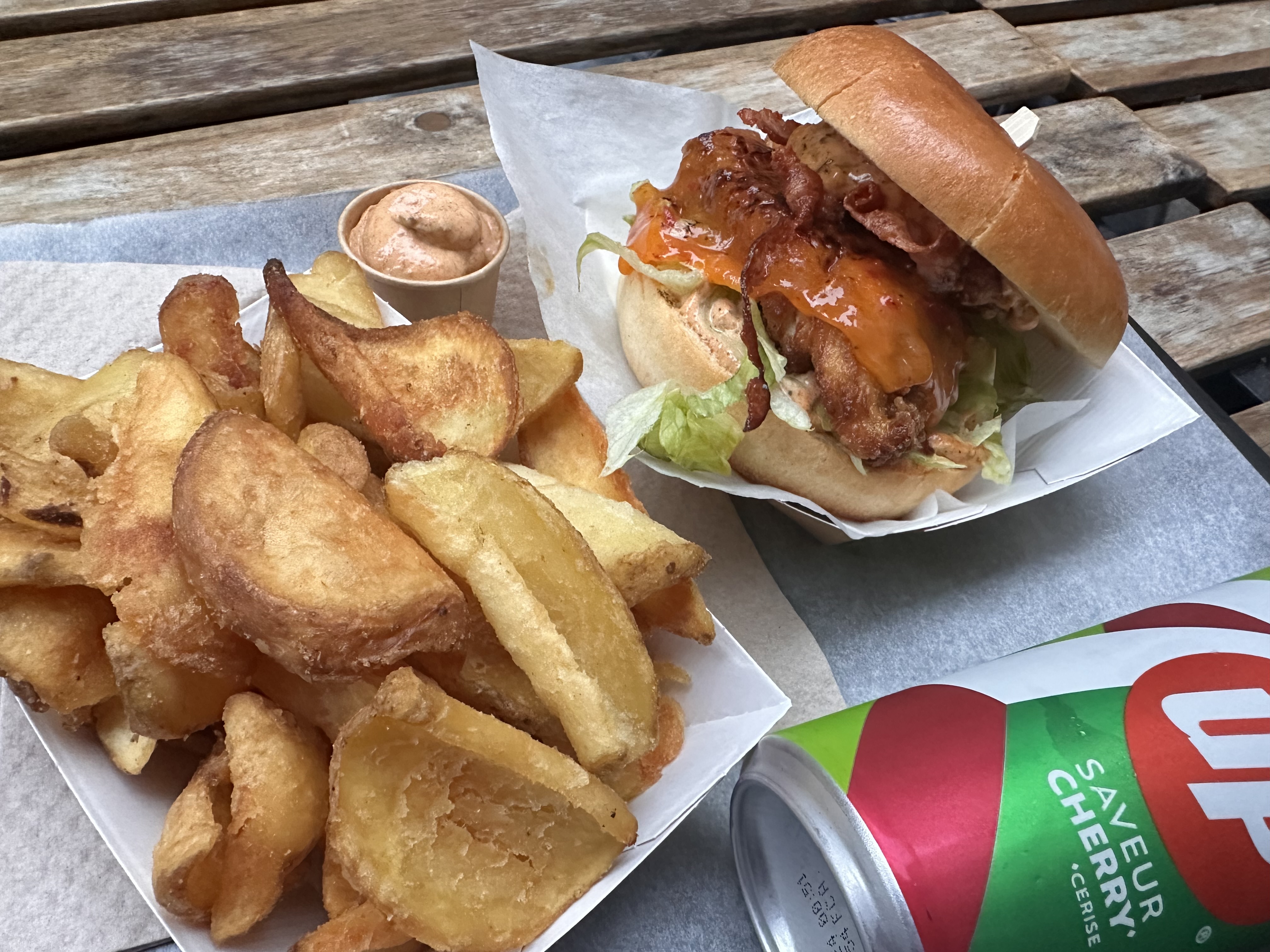 Ultra bon! Burger léger parfait pour assuler la soirée après ! Le blanc de poulet parfait. Burger bonne tenue. Frites en demie lune. Les gars sont des pros!