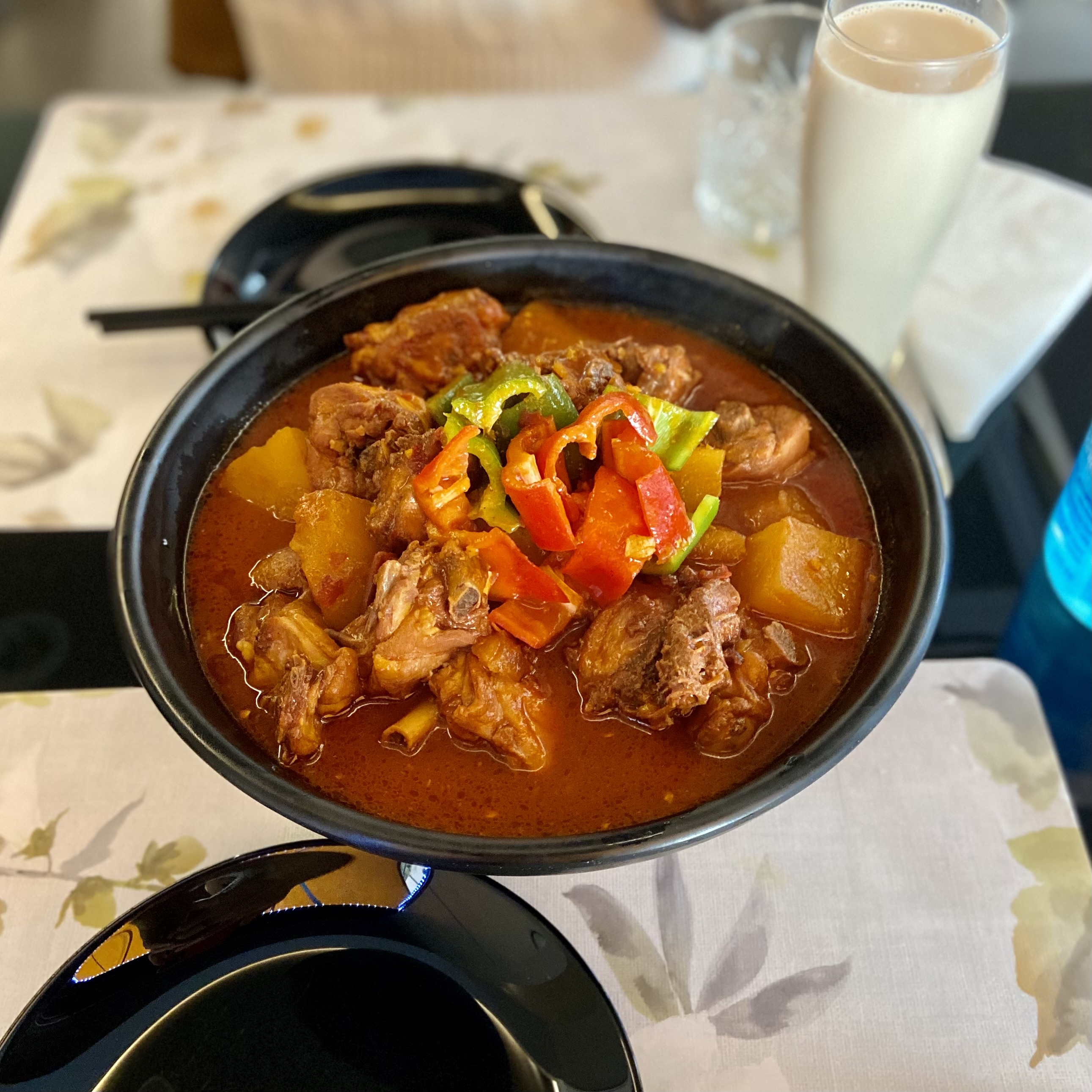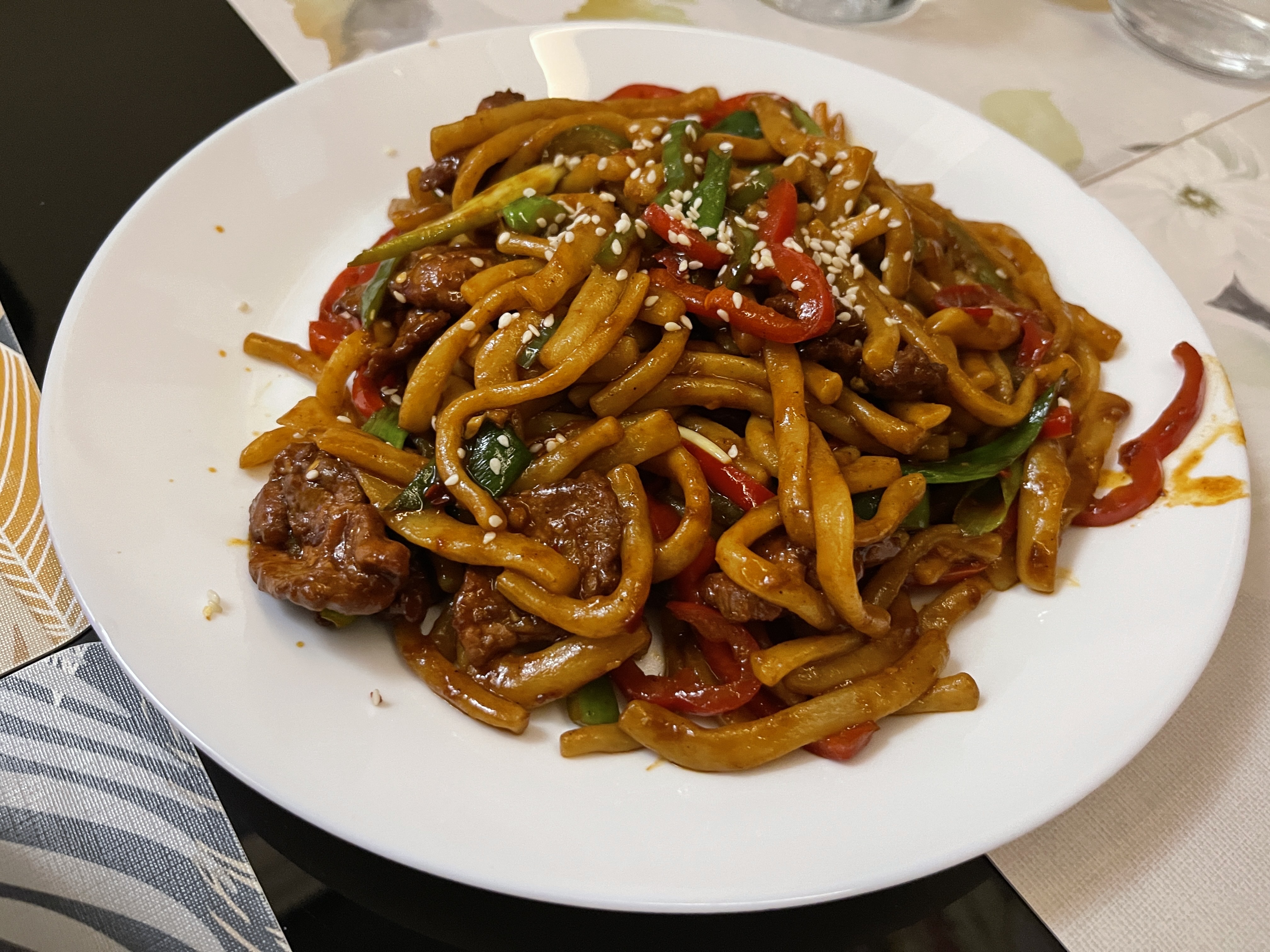 J aï pris un poulet aux poivrons, accompagné de riz et mon fils du bœuf aux champignons et nouilles. Nous nous sommes régalés. J ai ressenti seulement à la fin le piquant du plat. Ça me va comme ça d d'ailleurs. Les assiettes sont copieuses, par contre il n y a pas de vin. Pas grave on se rattrape après !!!
