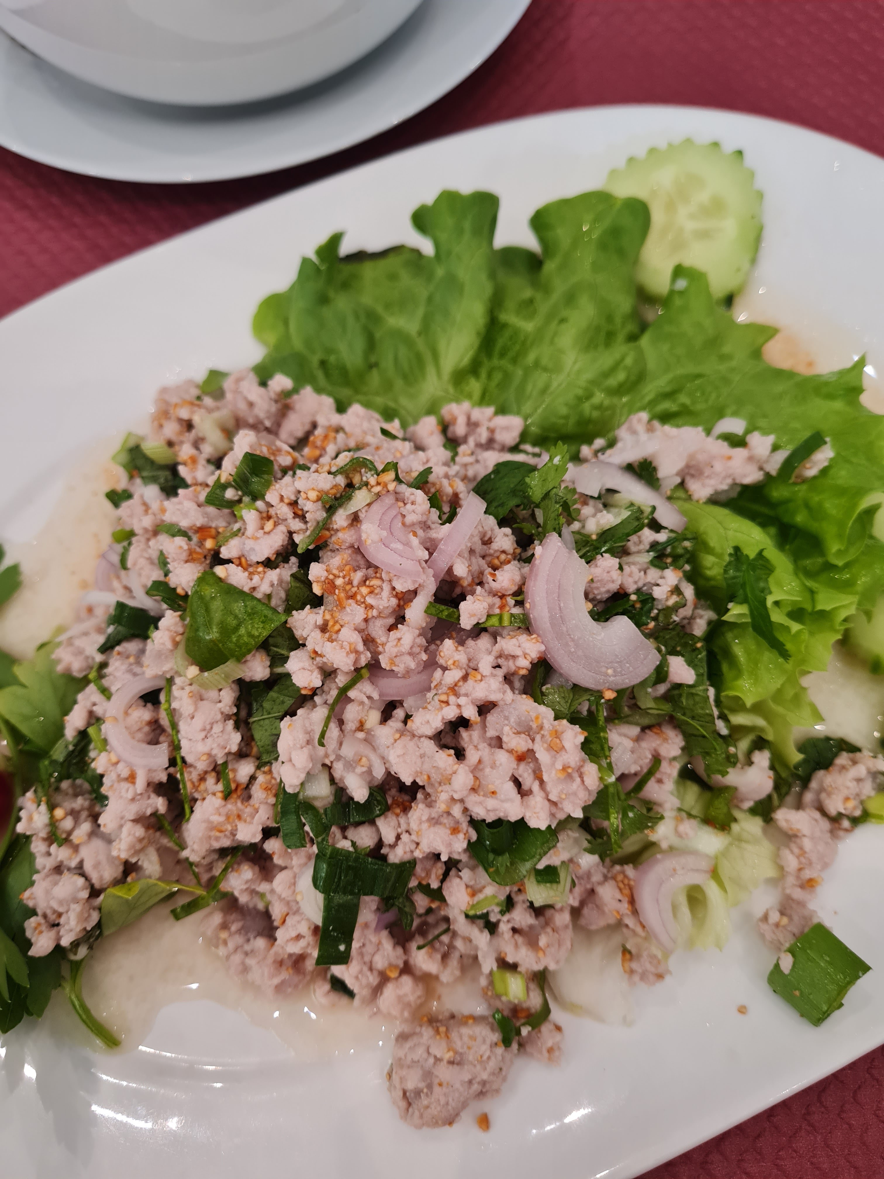 Nous sommes allés à Kruathai en juin. Nous avons commandé plusieurs plats à partager, Som Tam (salade de papaye), Pad Thai, Pad See Ew, riz frit thaïlandais, crevettes crues à la sauce épicée, sautés de basilic sacré et de porc et Larb moo (salade de porc hachée épicée). Nous avons dit à la serveuse lorsque nous avons commandé que nous aimions les épices +++++++++ Ils ont préparé chaque plat à la perfection, comme nous l'aimons TRÈS TRÈS épicé. Tout était très savoureux et délicieux, un vrai goût thaïlandais authentique :) N'oubliez pas de mentionner à la serveuse lors de votre commande si vous voulez du épicé ou pas, etc. afin qu'elle puisse préparer votre nourriture comme vous l'aimez. Je recommanderais à tous ceux qui sont à Nice et qui ont envie de cuisine thaïlandaise d'essayer cet endroit ! Essayez l’un de ces plats que j’ai écrit ci-dessus, vous ne serez pas déçu ! La jeune serveuse est très charmante et accueillante.