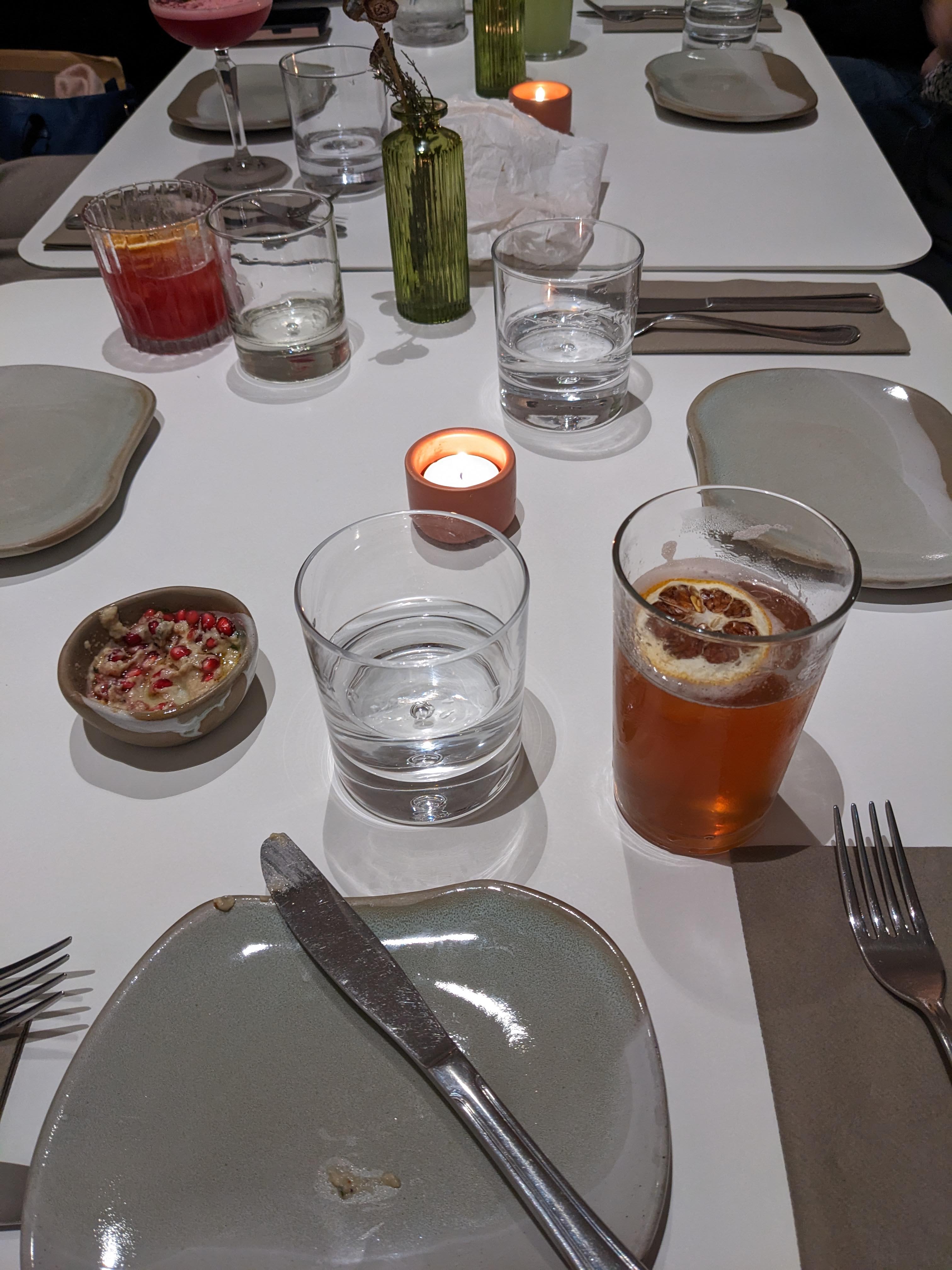 Pour un dîner à 2. Nous nous sommes retrouvées au comptoir car il n’y avait plus de places en table. C’était super car nous avons pu voir le staff travaillé et nous étions les seules au comptoir! Les 2 seuls points qui m’ont un peu dérangé c’est la hauteur du bar quand on est assises car je suis petite (1,60cm) et c’était un peu désagréable. Puis la musique était un peu forte mais l’ambiance était là avec un staff jovial sans apparences! Les plats étaient délicieux, de l’entrée au dessert, en passant par la boisson. Merci à toute l’équipe!