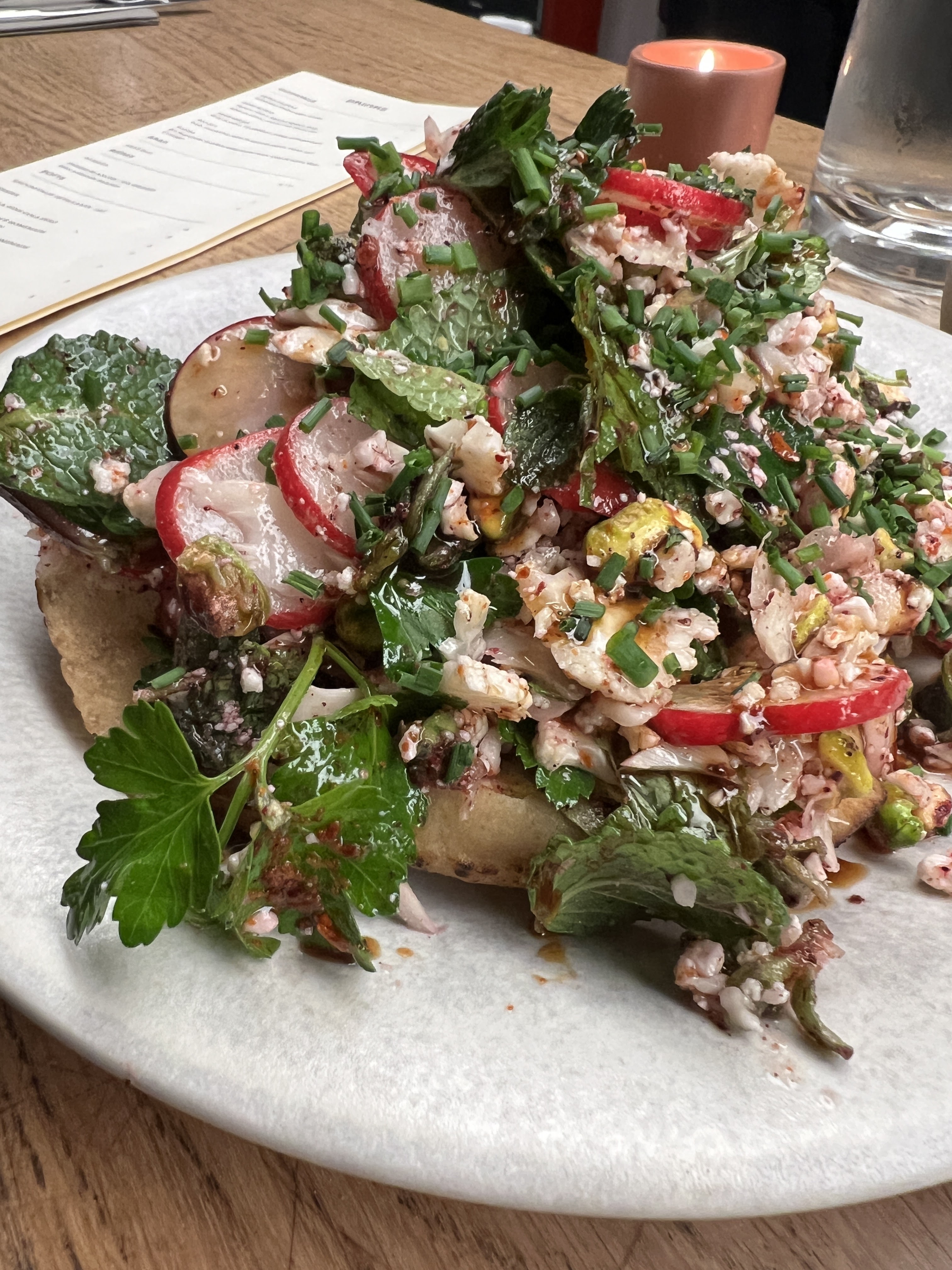 Même si c'est votre première visite, ils vous traitent comme une bonne famille. Le chou carbonisé et le houmous aux petits pois frais sont surnaturels. Tous les plats sont très inhabituels et délicieux. Le préféré de ma femme était le tartare d'agneau. Nous nous sommes assis au comptoir de la cuisine. Tout le personnel était très aimable et le propriétaire était un délice total. C'est à NE PAS MANQUER.