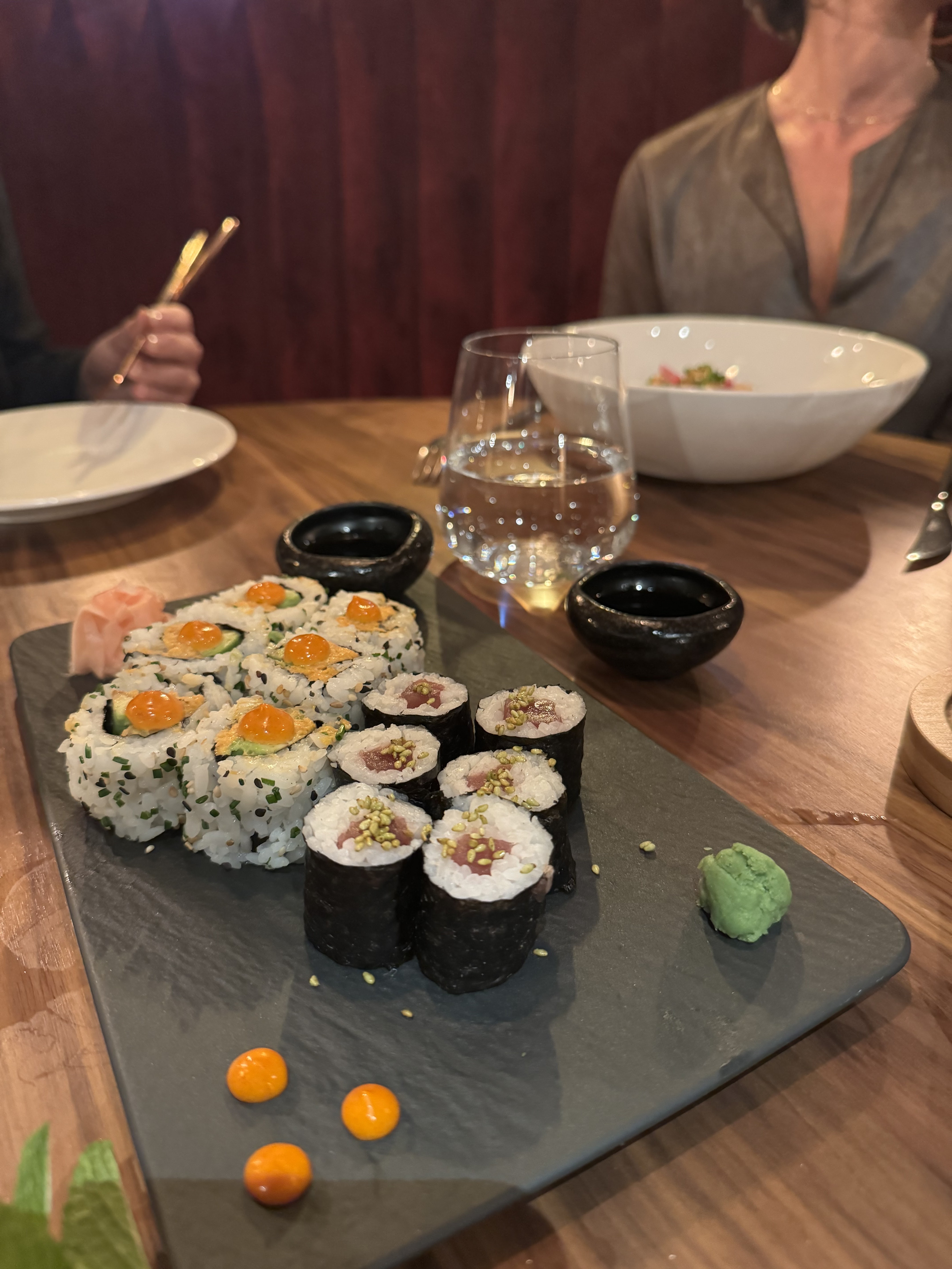Le lieu est sympa sur deux étages mais il fait assez froid dans les salles. Service bien mais très lent, on a attendu 1h avant d’avoir nos entrées (des makis et un tartare). Les entrées étaient bonnes mais basiques, pas d'originalité. Les plats étaient très bons et bien présentés. Quand meme assez cher pour ce que c’est, on paie clairement l’emplacement (8€ 2 sushis).
