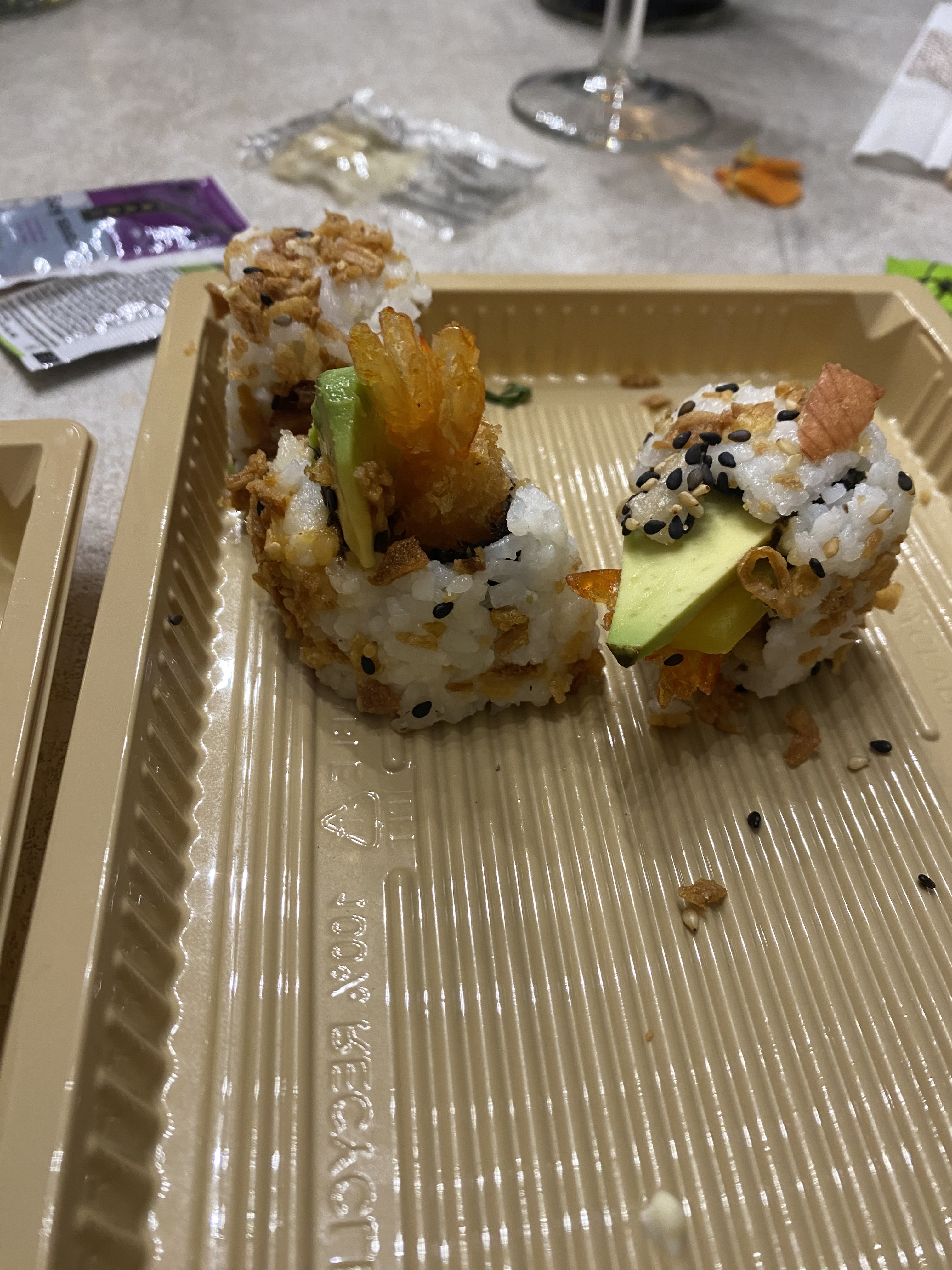 J’ai commandé à emporter Tout était entassé donc la moitié des rolls étaient cassés et les sachimi du jamais vu pour ma part ( pourquoi j’en mange souvent ) qu’on laisse tout le gris du dessous de la peau et coupé très épais De plus avocat pas mur ( tout dur) et trouver des queues de crevettes à la place de la crevette vraiment abusé !! Bref très déçu
