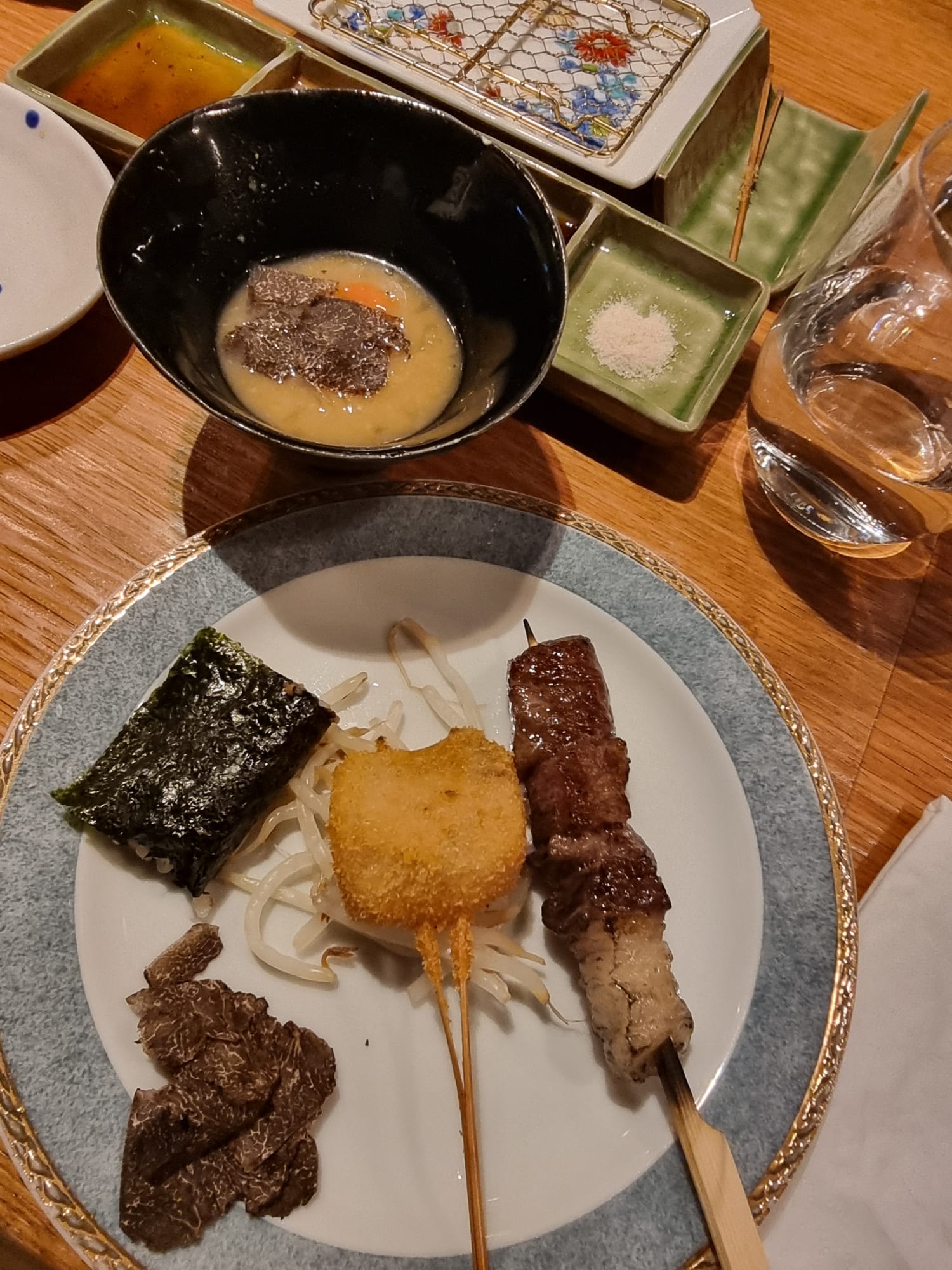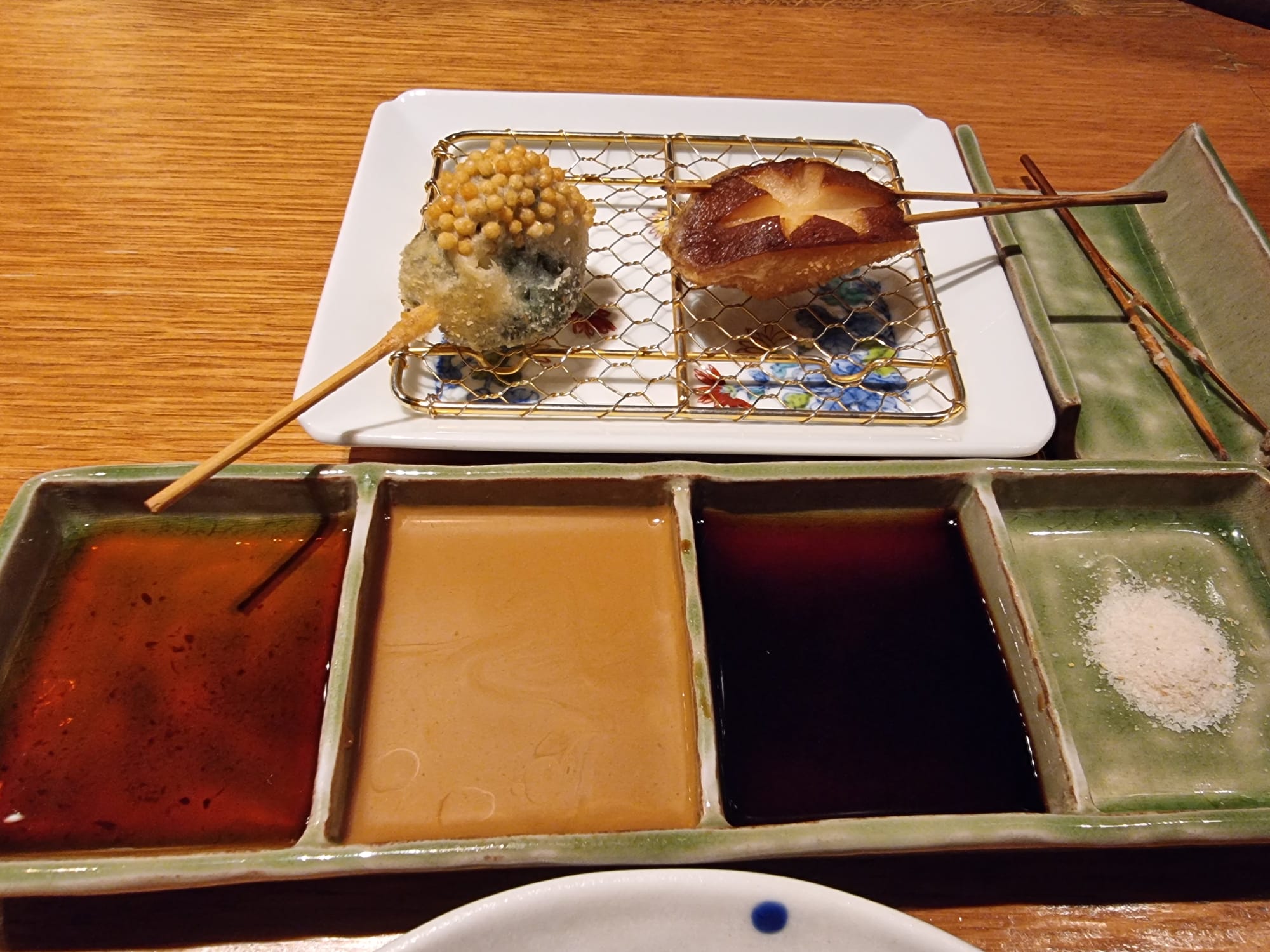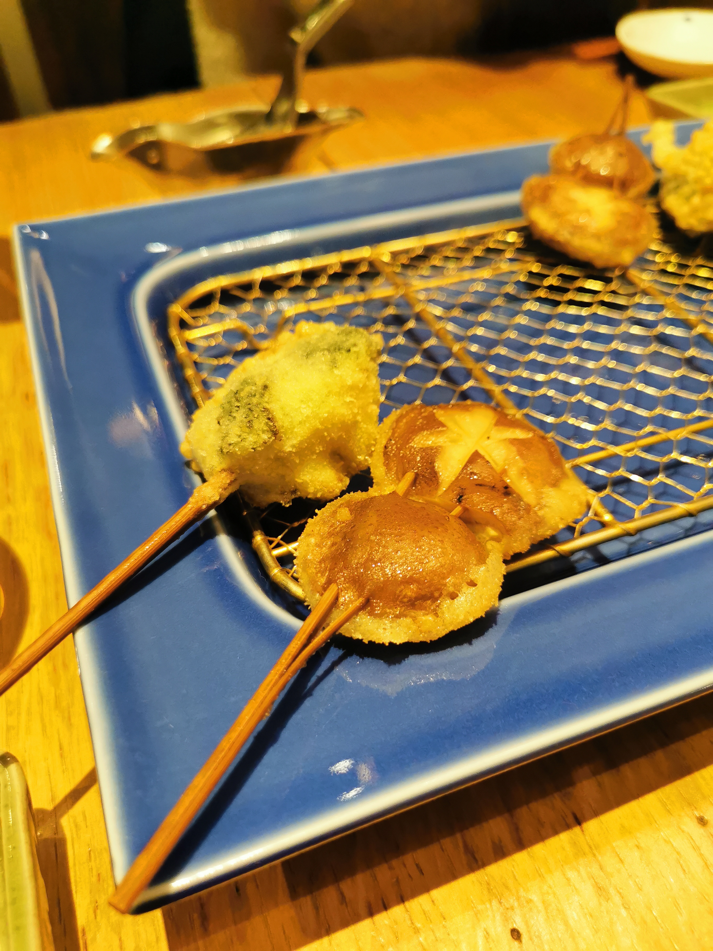 Sublimation des Kushikatsu, un plat très populaire à Osaka, servi dans des cantines. Rien qui puisse faire penser à du gastronomique. Et pourtant, c'est bien le cas ici ! Un vrai plaisir à chaque bouchée.